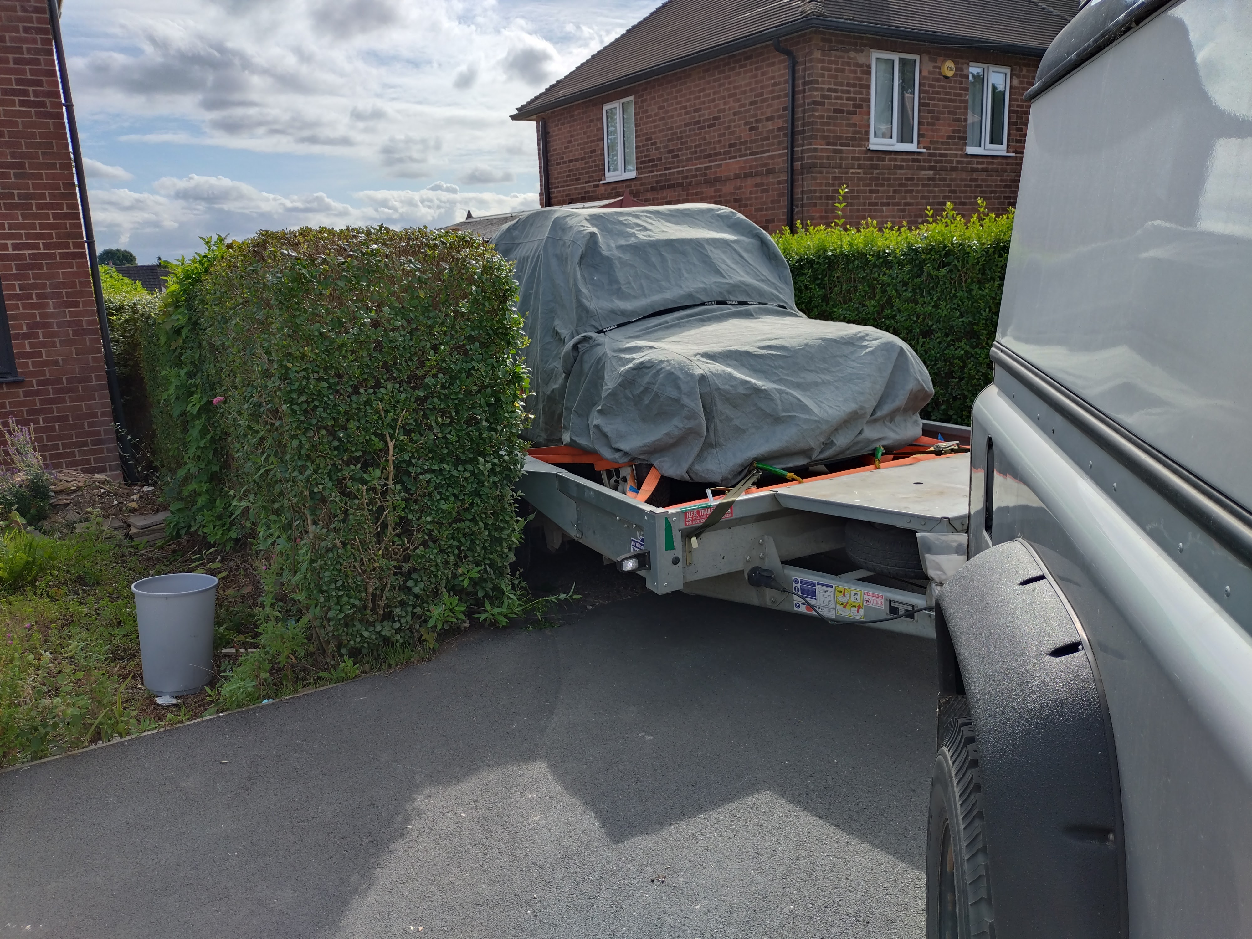 Its now August Bank holiday weekend (two weeks till we leave) and I finally managed to find a new home in a council garage of a friends parents down in Nottingham. Borrowed a flat bed trailer from the farm, and off it went to its new home for the next two years.