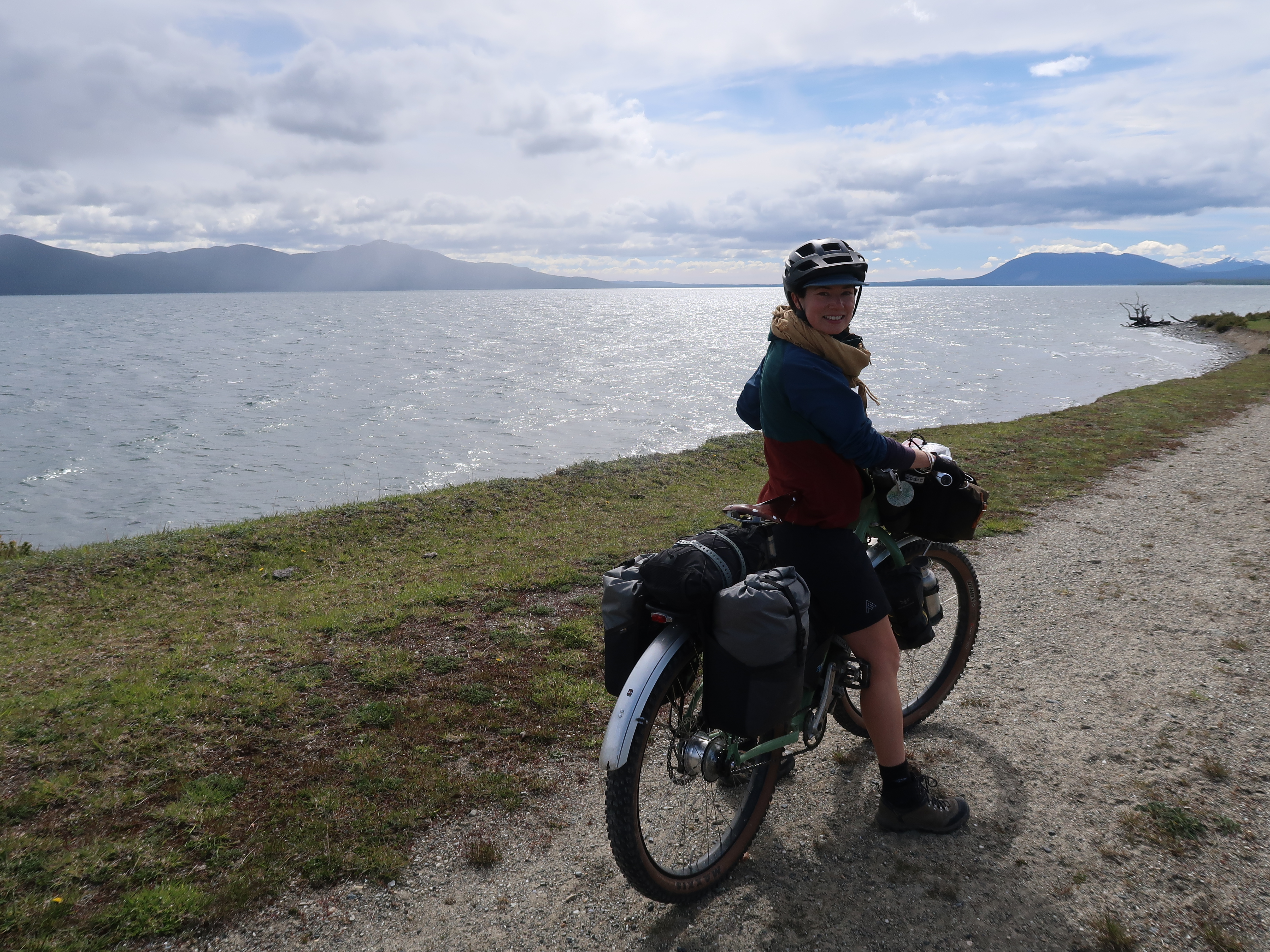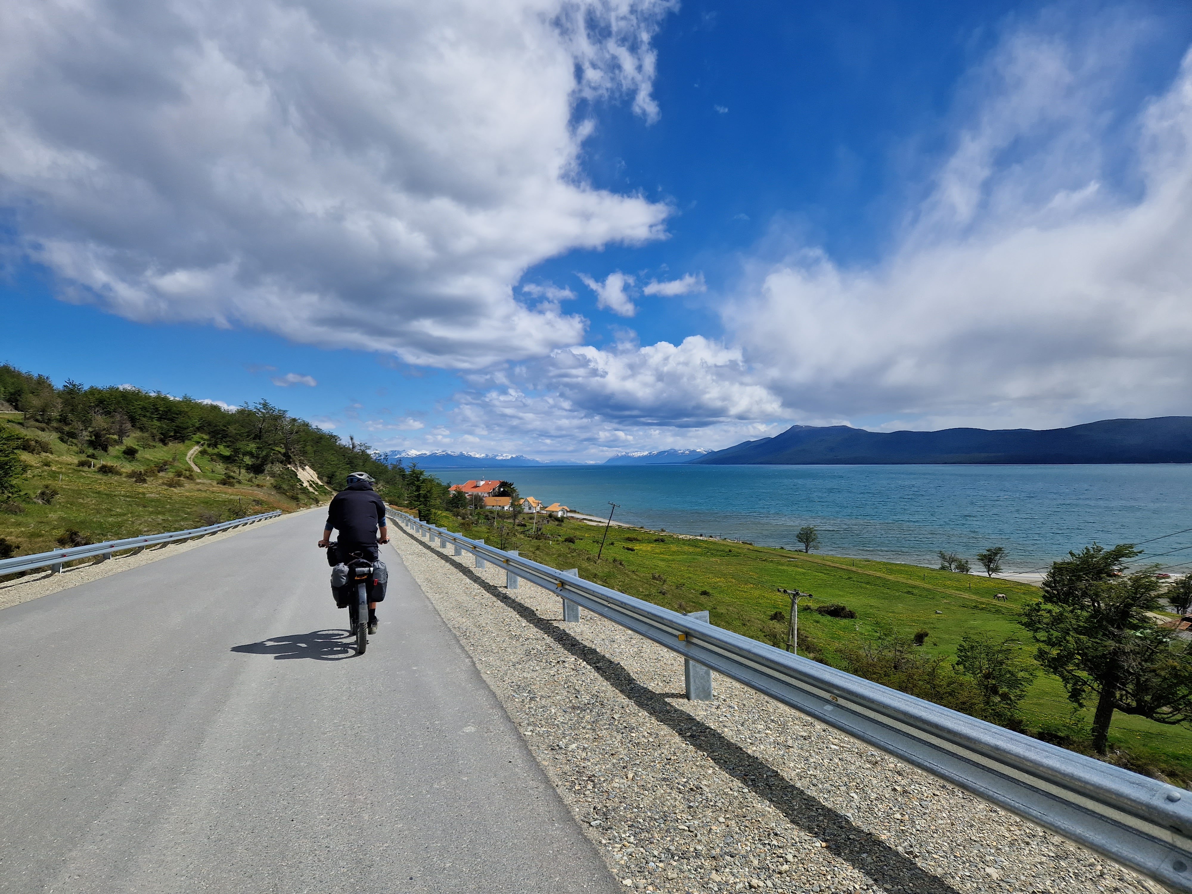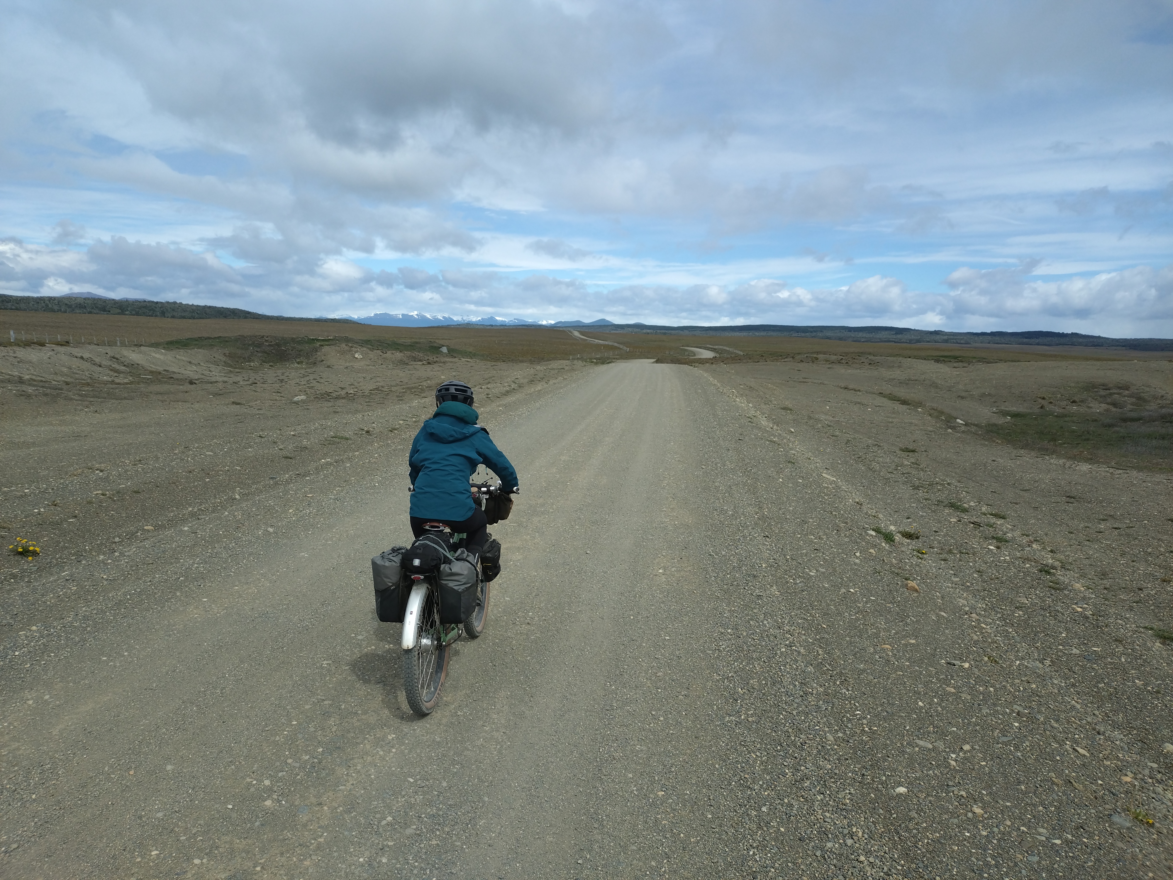 Leaving Ushuaia (on the one road in/out!) we were blessed with good weather and hardly any wind, which was needed as Ted really wasn’t feeling great. The landscape was amazing, such beautiful mountains, capped with snow, with glaciers in between the peaks. We soon got used to the trucks whizzing by. We were also really hearted to experience the encouragement and respect from the motorbikers who all seemed to wave, give you the peace sign or toot their horns as they passed in either direction (it’s not something we’ve ever experienced from the motorbike community before). It brought the hugest smile to my face every time it happened and earned them a Forrest-Gump-esk wave in return from me – it even made Ted’s frown reduce slightly on a few occasions too.
