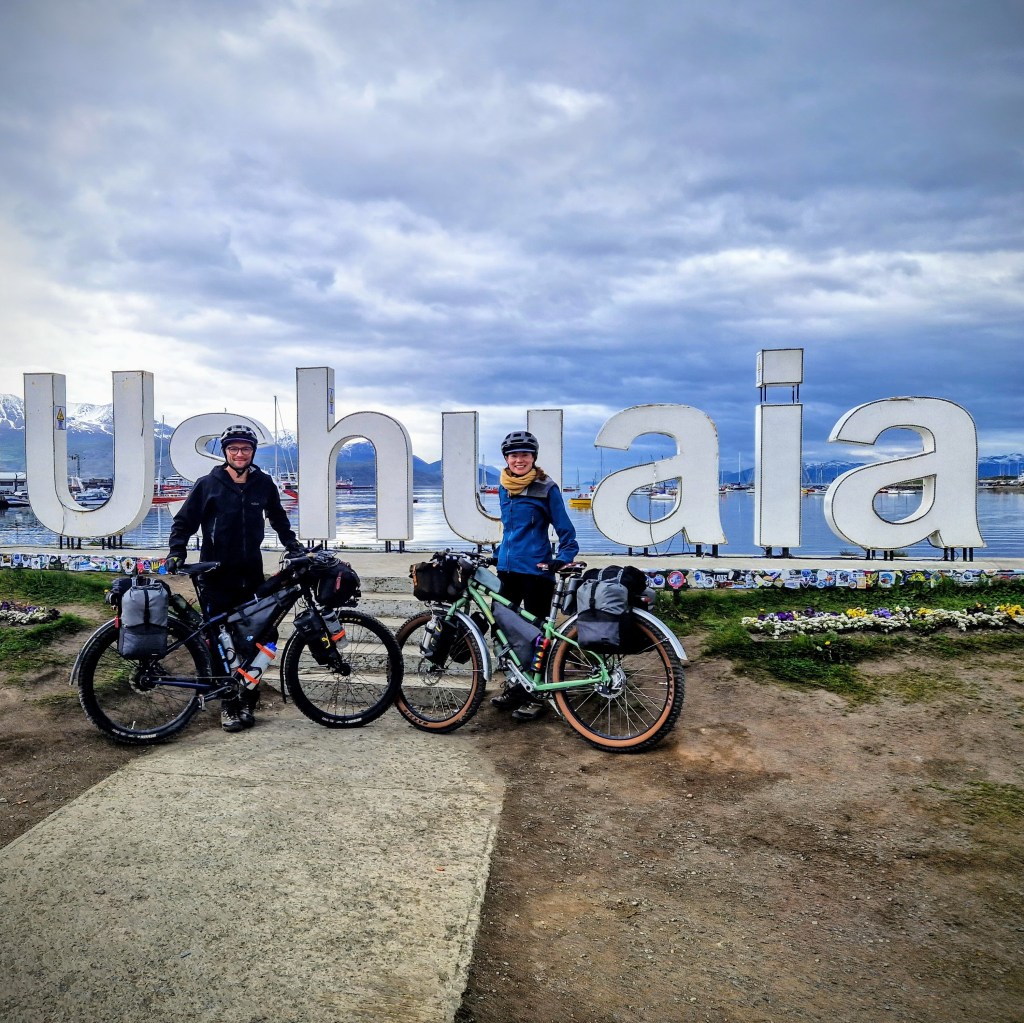 After flying to Ushuaia and miraculously arriving with all our bags and bikes intact (cudos to Aeolinas Argentina for doing what most airlines are unable to achieve!) we enjoyed a few days around Ushuaia. We were welcomed there by the warmth and hospitality of Rosendo, a fantastic local WarmShowers host (check out his YouTube channel about cycle tourists in Ushuaia where we make our debute YouTube appearance!). We mainly spent our days resting, as Ted had managed to pick up some kind of lurgy on the plane – Man flu (you know the worst kind of flu known to man, only a man!). But we did manage to squish in a short day ride and a hike to enjoy the beautiful surrounding area, the Fin del Mundo – The end of the Earth. Ted also had his first taste of Dulche de Leche, an Argentinian caramel sauce that is eaten here at breakfast, lunch and dinner – Think Nutella, but caramel instead of chocolate, and no hazelnuts, so not even containing the one ‘healthy’ ingredient! This made him feel a little better.