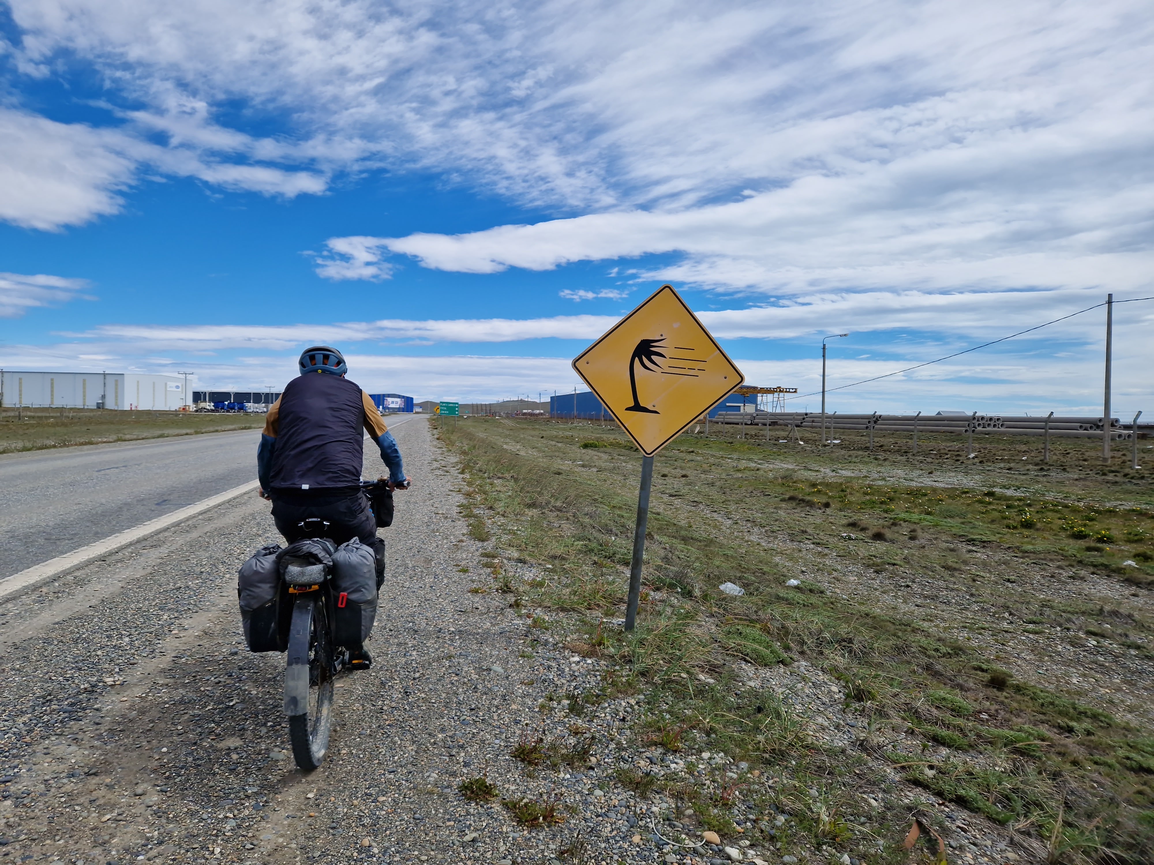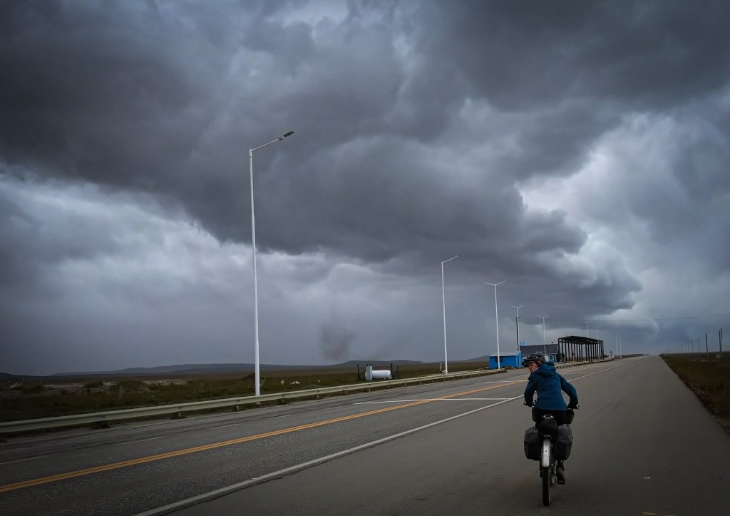 Leaving town, looking out across the South Atlantic Ocean it wasn’t too bad, but 15km along the highway we were already starting to feel it. The first thing you notice is the noise. It is so loud. Like white noise (you know, the noise they use in torture training!) And it roars. All. The. Time. There is no escaping it, even with a snood pulled up to protect your ears and face, even with a hat on, and a helmet and a hood – you still hear it roaring. Soon enough we were battling to keep moving forward. Every pedal stroke feeling like you were in treacle. Changing into an easier and easier gear in the vain hope that it would help, but it didn’t.