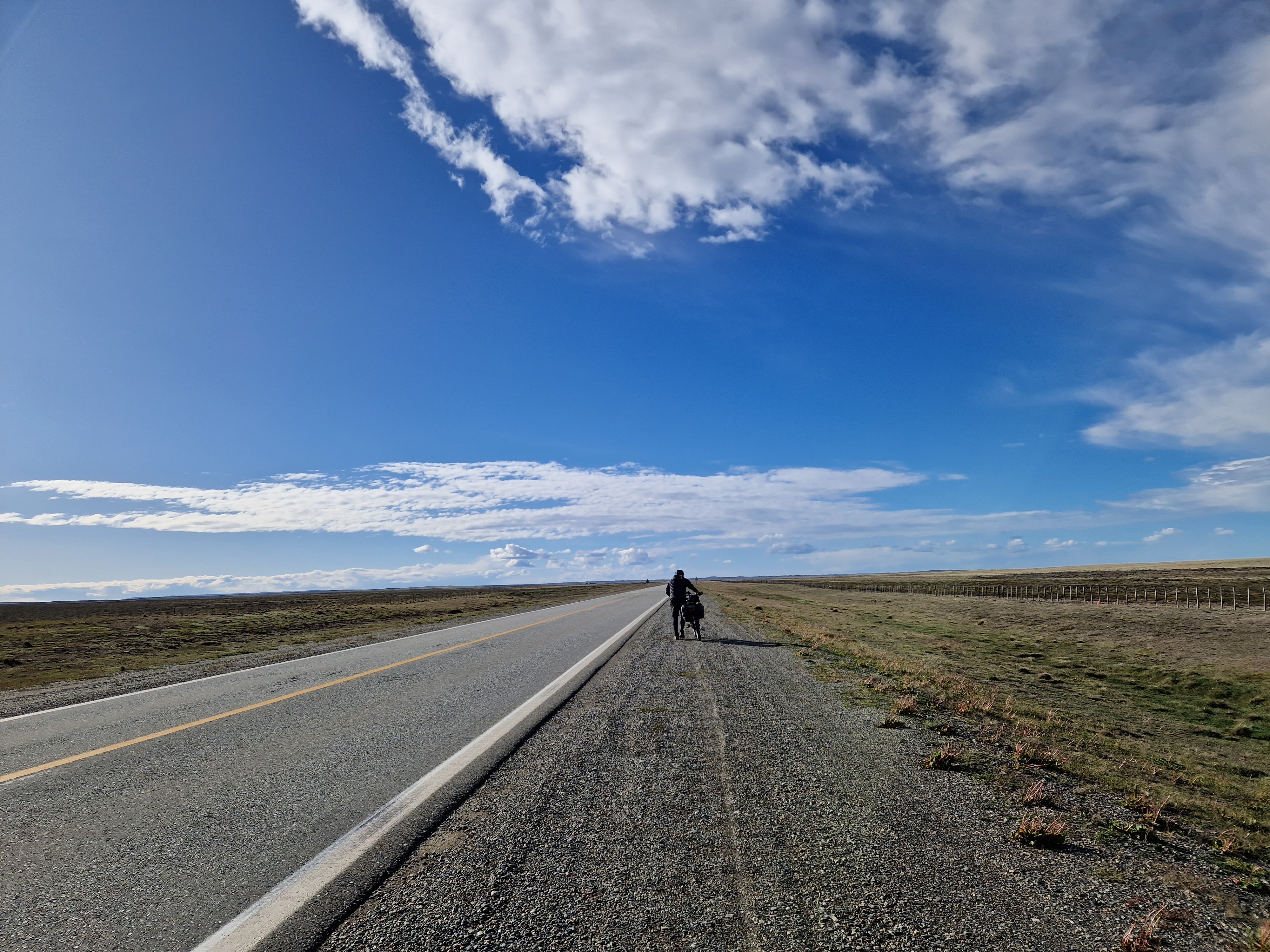 As the afternoon went on the wind became ferrocious, every gust of wind was like a punch in the face and chest, every truck that came by would create a wave of wind that would knock you off the road and require your whole body weight to brace the handlebars and counteract the force. It was brutal. It soon became quicker to walk and push the bikes, but even this was hard work. The wind kept trying to tear the bikes from our hands at every opportunity. It felt like being caught in the white horses of the sea, one barrelling wave after another, tumbling over and over.