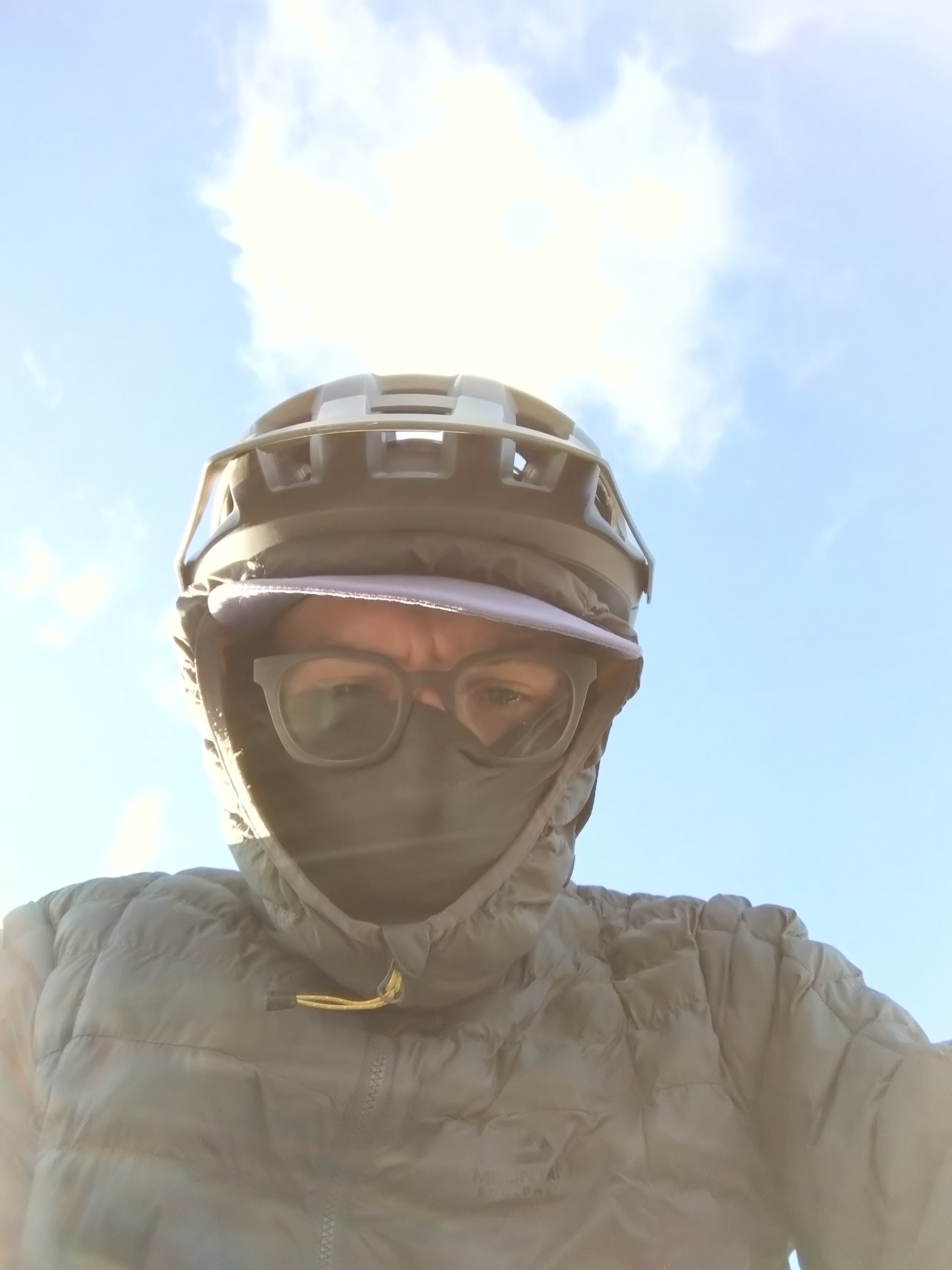 Crawling on, we could see the sky darkening in front of us, the clouds creating an ominous black pattern across an otherwise grey white sky. We could see the white haze of hail falling and heading straight towards us. Then we watched as a twist of cloud spun out of the black, creating a tornado which hit the ground. Suddenly feeling very small and vulnerable we head towards the only shelter around – a local guard weigh station for trucks. Sadly the guards explained that we weren’t allowed into their glowing, toasty warm, sofa filled, empty back room, because it would require walking through their office which was confidential – so instead we took what comfort we could in standing against the walls of the building, looking into the glowing warmth of their empty, sofa filled back room, putting on more and more layers of clothes until the storm passed.