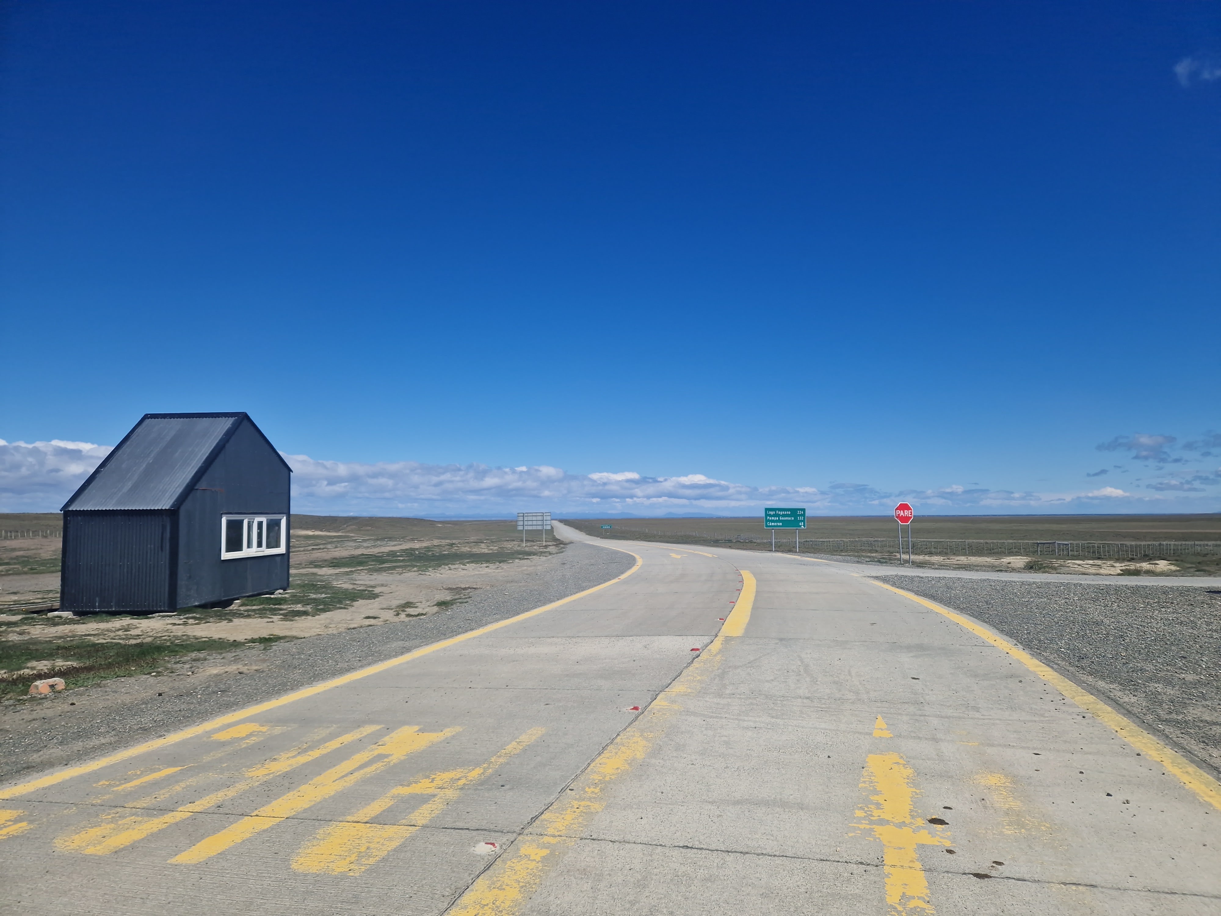 Riding out of the Chilean border post around 5pm, the wind was still howling, but less so than earlier in the day, and the more we rode, the more the wind dropped. The road became more undulating, twisting and turning. We could see a sliver of blue grey sunset over the mountains as we rode towards it and the traffic became less and less. Before we knew it the wind has disappeared all together and finally we were left to enjoy the evenings riding without it being a battle. It was just us and the heards of Guanacos and an Armadillo – a real life Armadillo – scurrying about in the fields alongside the road. As light was fading we needed shelter for the night. We knew that there was one road junction about 30km away, and that road junctions often have small refugios for bus stops (and cycle tourists!) so we aimed for there in the hope our intuition was right. But the rain rolled in and brought the wind back with it, just as the last of the daylight faded and our already cold fingers and faces became soaked too.