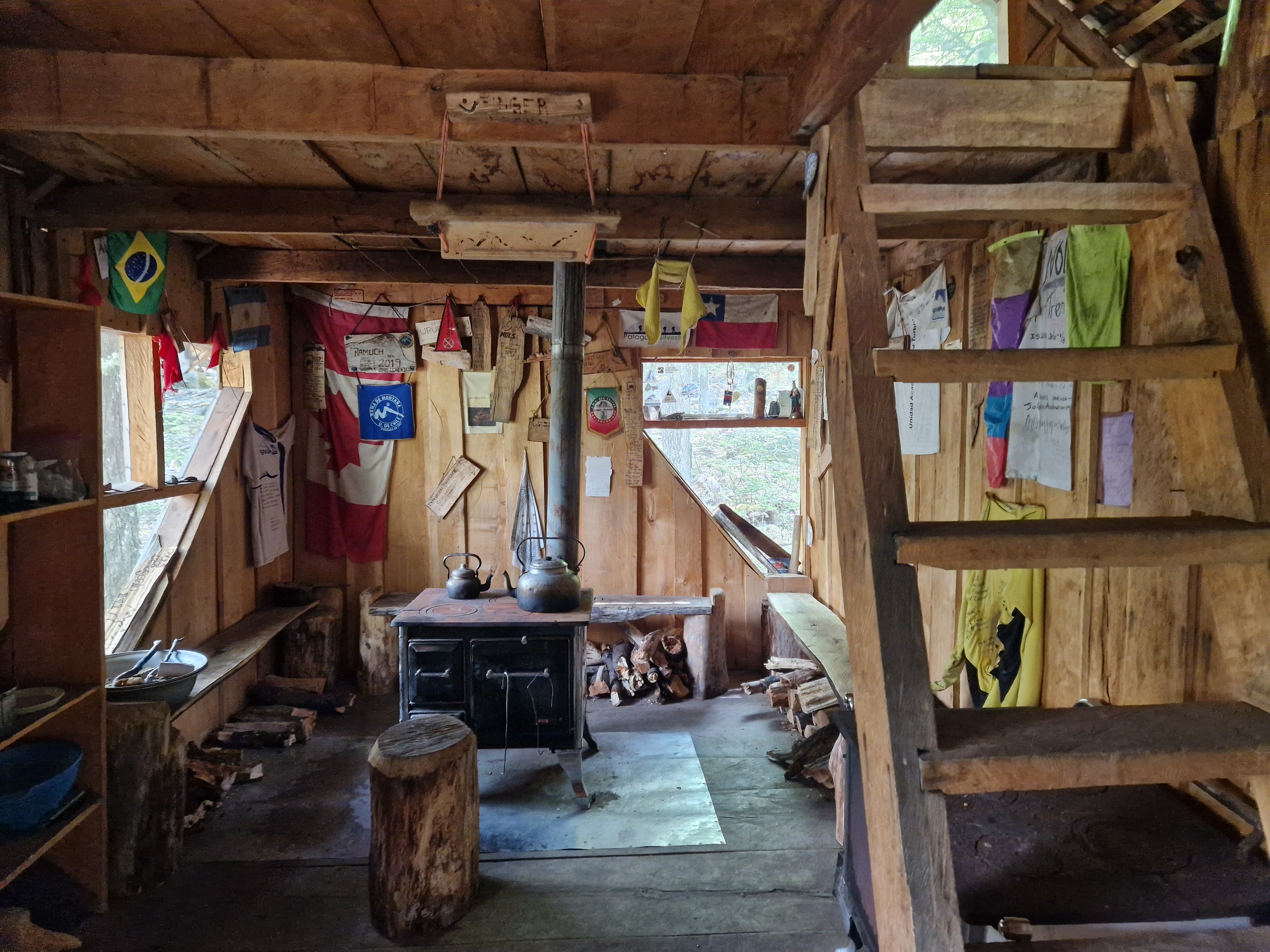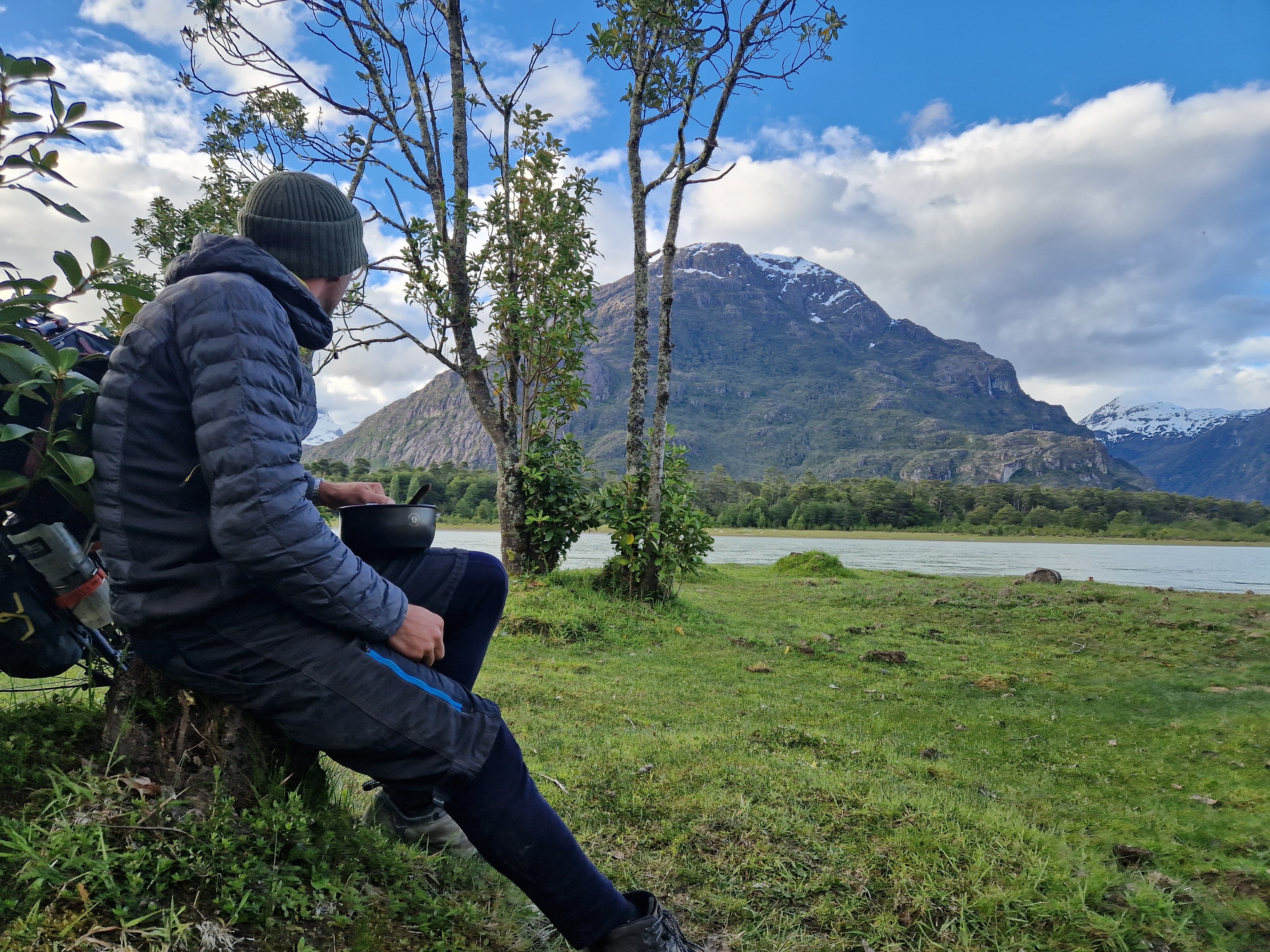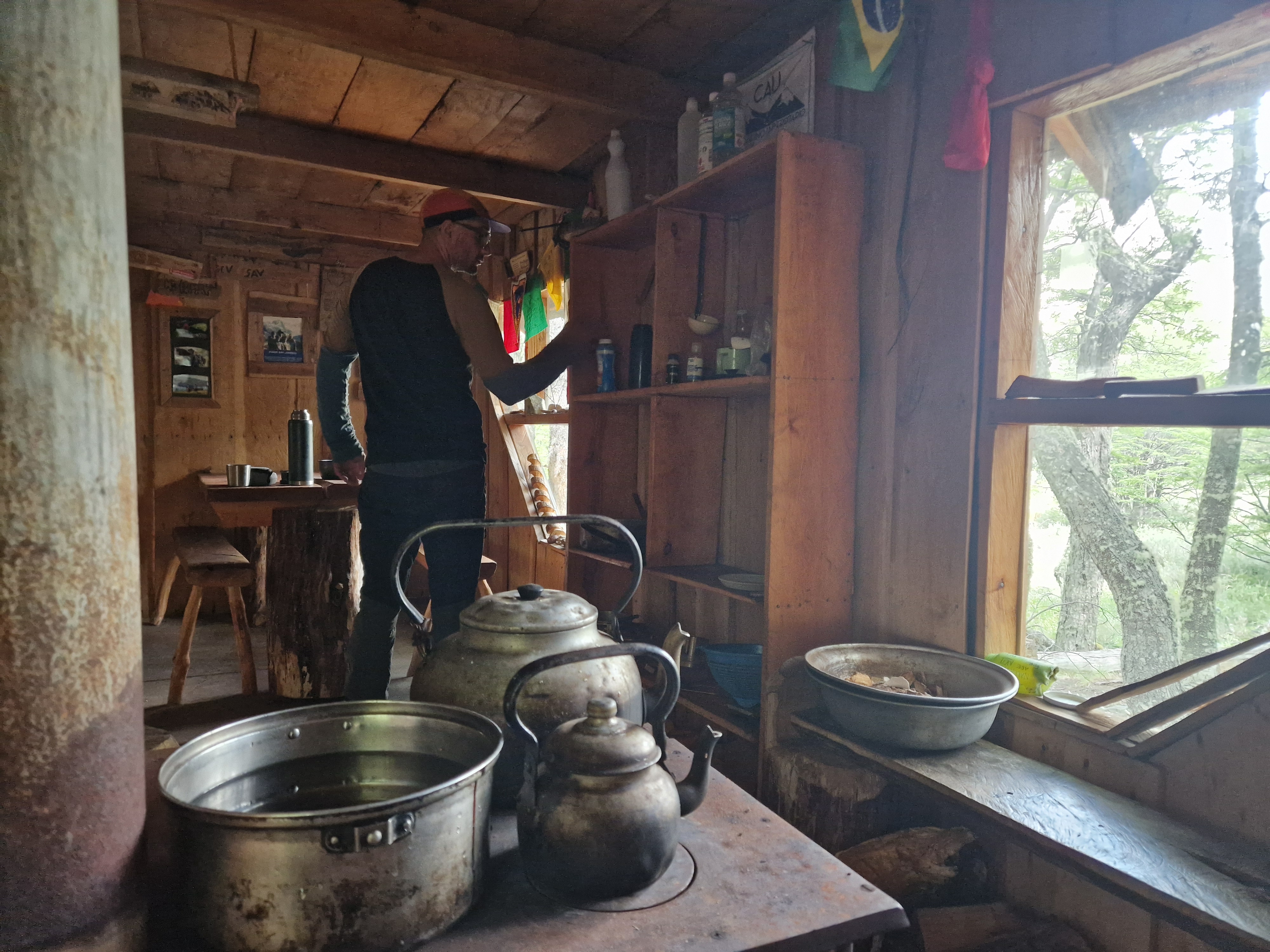 I’m writing this post from the Toni Rohrer Refugio at Campamento D’Agostini, the base camp for Monte San Lorenzo (the second highest mountain in Southern Patagonia at 3706m). Don’t worry, we aren’t going to pretend to be mountaineers and attempt the climb. But we have taken a slight detour from our route North, to enjoy a couple of days off the bikes. We are currently spending some time hiking and exploring this beautiful, remote area of San Lorenzo. And as it’s almost Christmas and we never know what day it is anyway, we’re treating this as our Christmas holiday! The mountain hut is in a sheltered wood, at the edge of the lake that pools at the bottom of the ice blue glacier, covering the mountain side. The incredible wooden refugio is hand built, full of character, with mountaineering memorabilia covering the walls, a cosy stove to keep us warm and it has one of the largest kettles I’ve ever seen – so for us, it’s perfect.