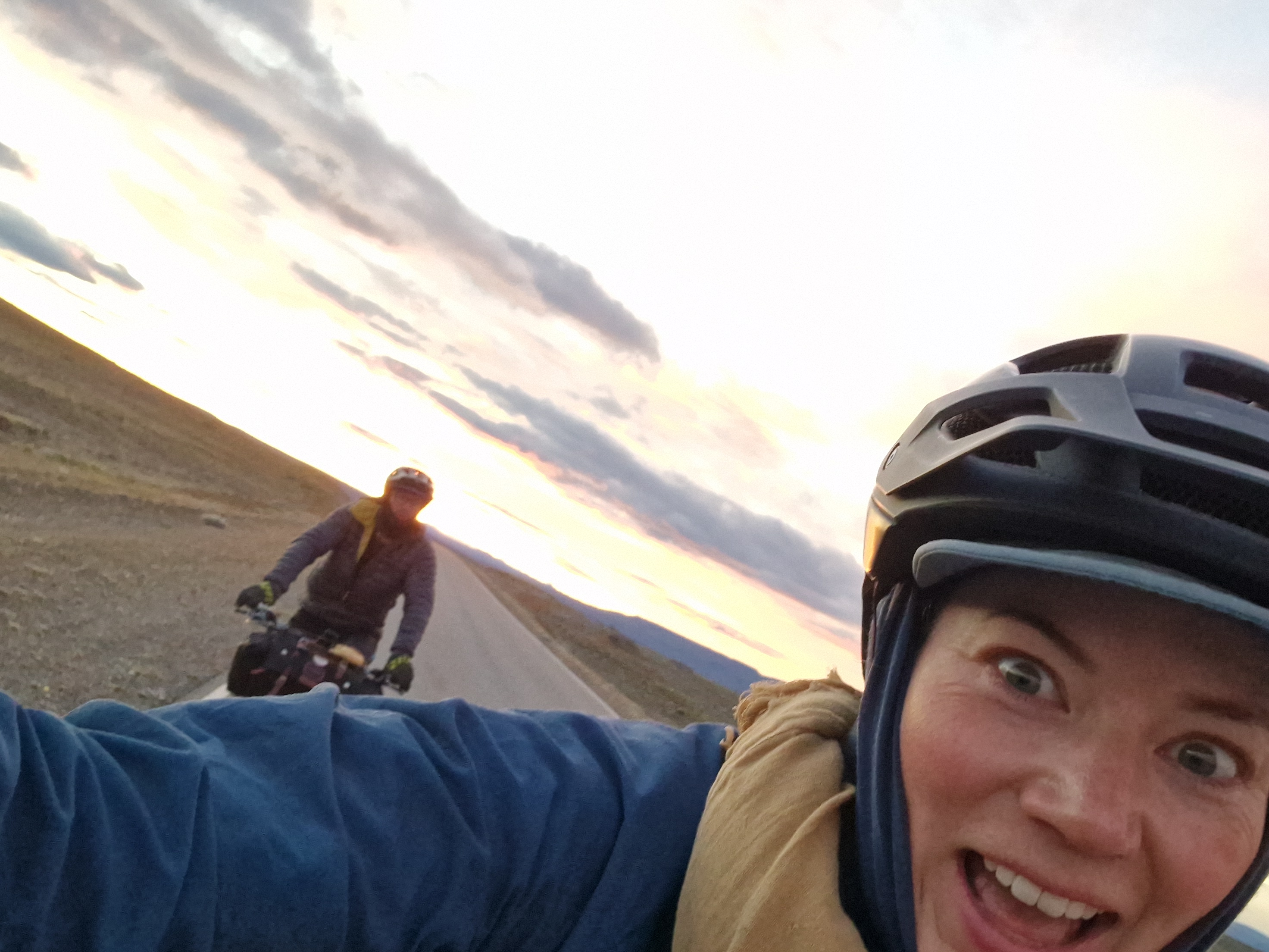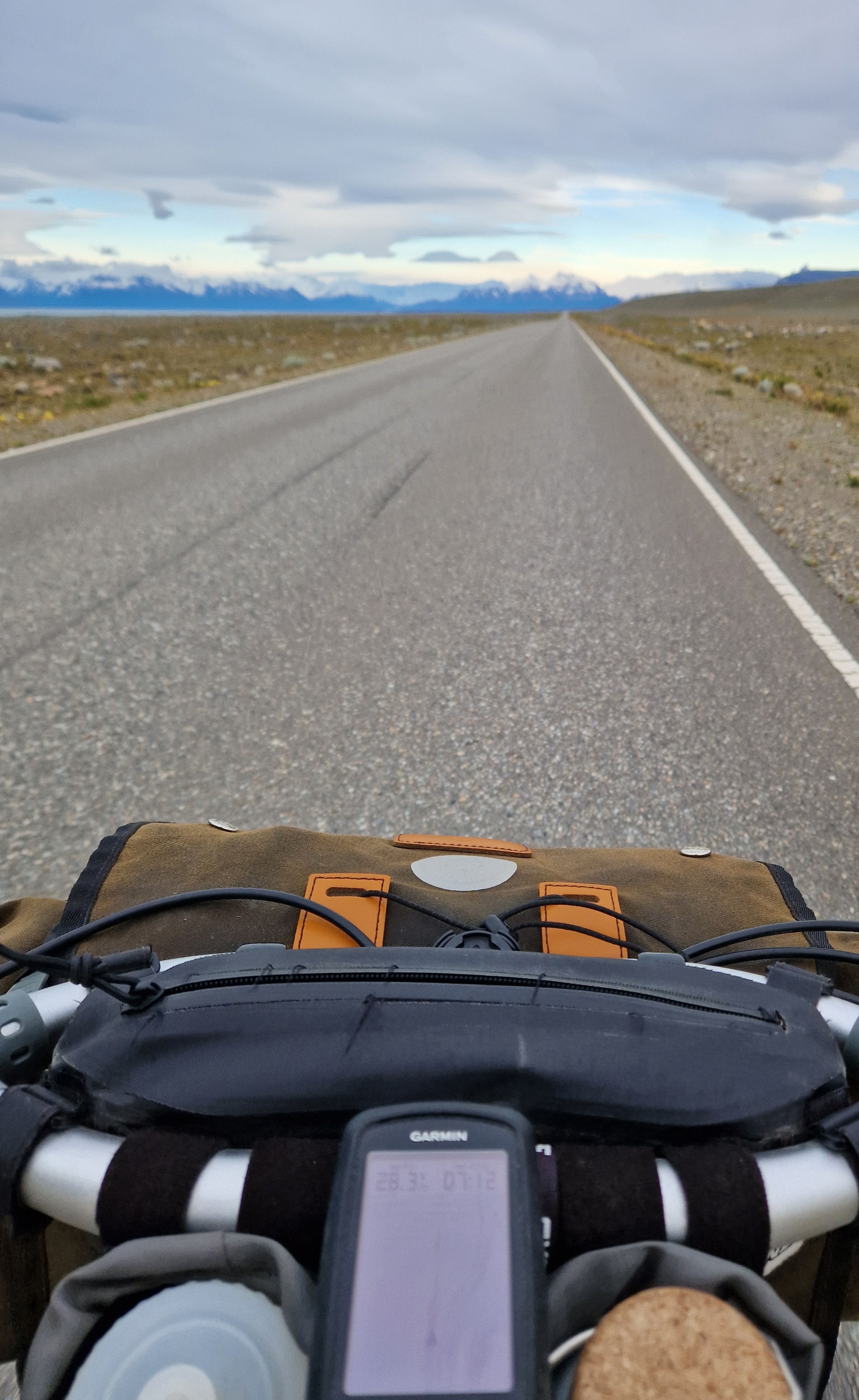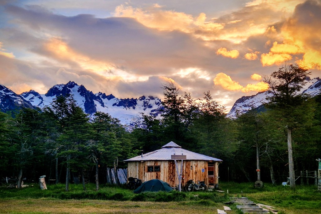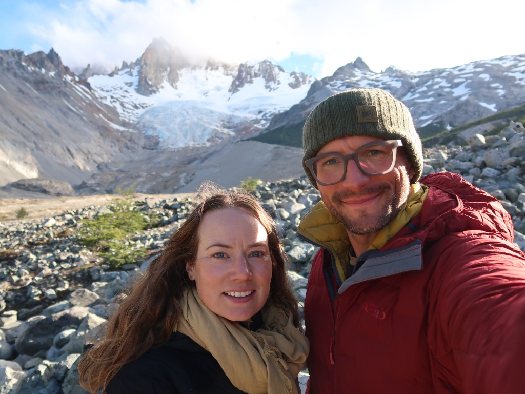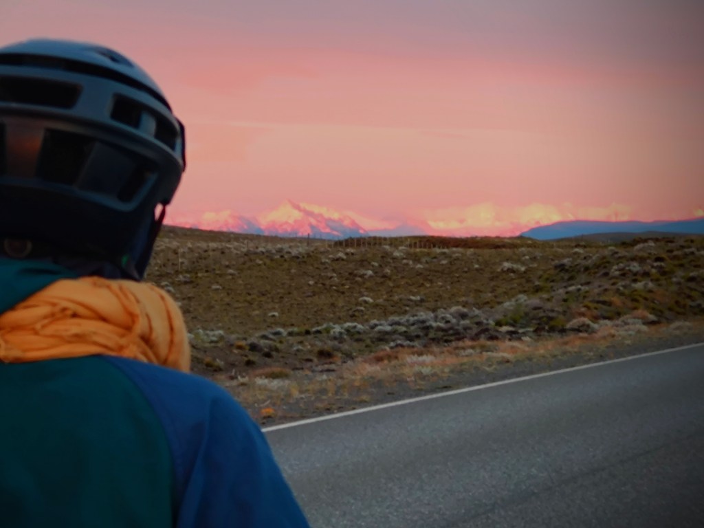 As I’ve already mentioned, we’ve had a few early starts to avoid the worst of the wind and it’s meant we’ve become acustomed to a 4:00am alarm. I mean, I love early mornings but even for me this is pushing it! That being said, once you’ve dusted the ice off your bike, put on all your layers and hit the road, watching the sun creep over the horizon and across these incredible Patagonian landscapes is a pretty special experience. The air is still and calm, everything is quiet, there’s no traffic and you often find yourself riding alongside the herds of guanaco who run with you for a little while before finally jumping the fence. One morning that will be etched in my memory forever was our approach to El Chalten and the Los Glaciers National Park. The road directly faces the famous mountain range of Fitz Roy, unusually the whole skyline was clear of low lying cloud and as the sun rose over the horizon behind us, it cast a golden pink glowing light onto the mountain top of Fitz Roy, turning it into a burning glow, the light spreading to each individual mountain top in turn and as the sun grew higher the golden light crept a little lower down each mountain side until they were all glowing golden pink. But no more than 5 minutes later it was gone, the golden dawn glow had faded to a warm white, almost as though we had imagined the whole thing. The rest of the day riding to El Chalten continued to provide incredible views of mountains and glacial lakes with icebergs. We also enjoyed the experience of watching a group of huge condors catch the thermals and soar overhead, one after another, all in line like giant planes coming in to land on a runway. But it’s the memory of that dawn pink sky on Fitz Roy that we’ve both said we’ll treasure the most, so we’ve learnt to love that 4am start just a little more.