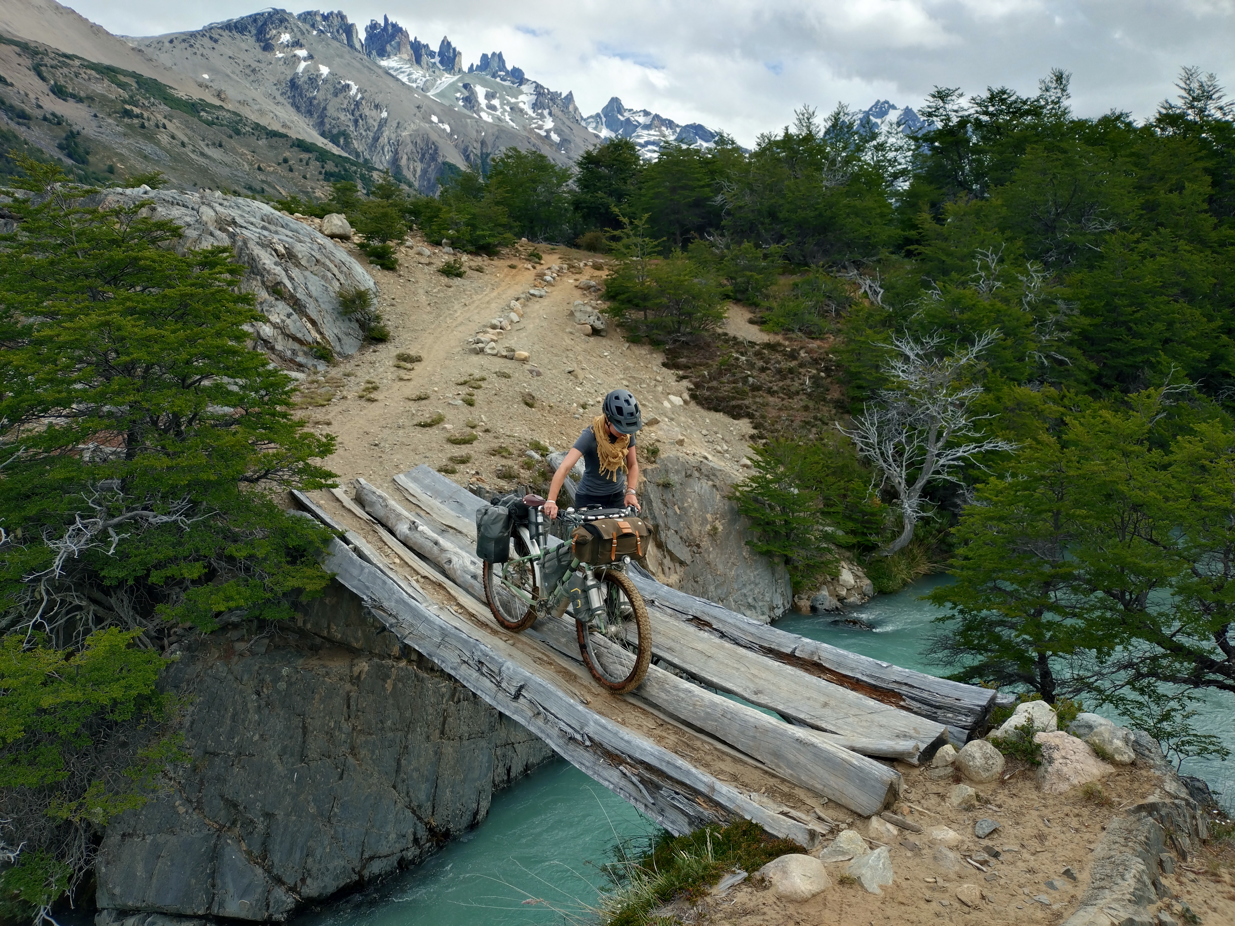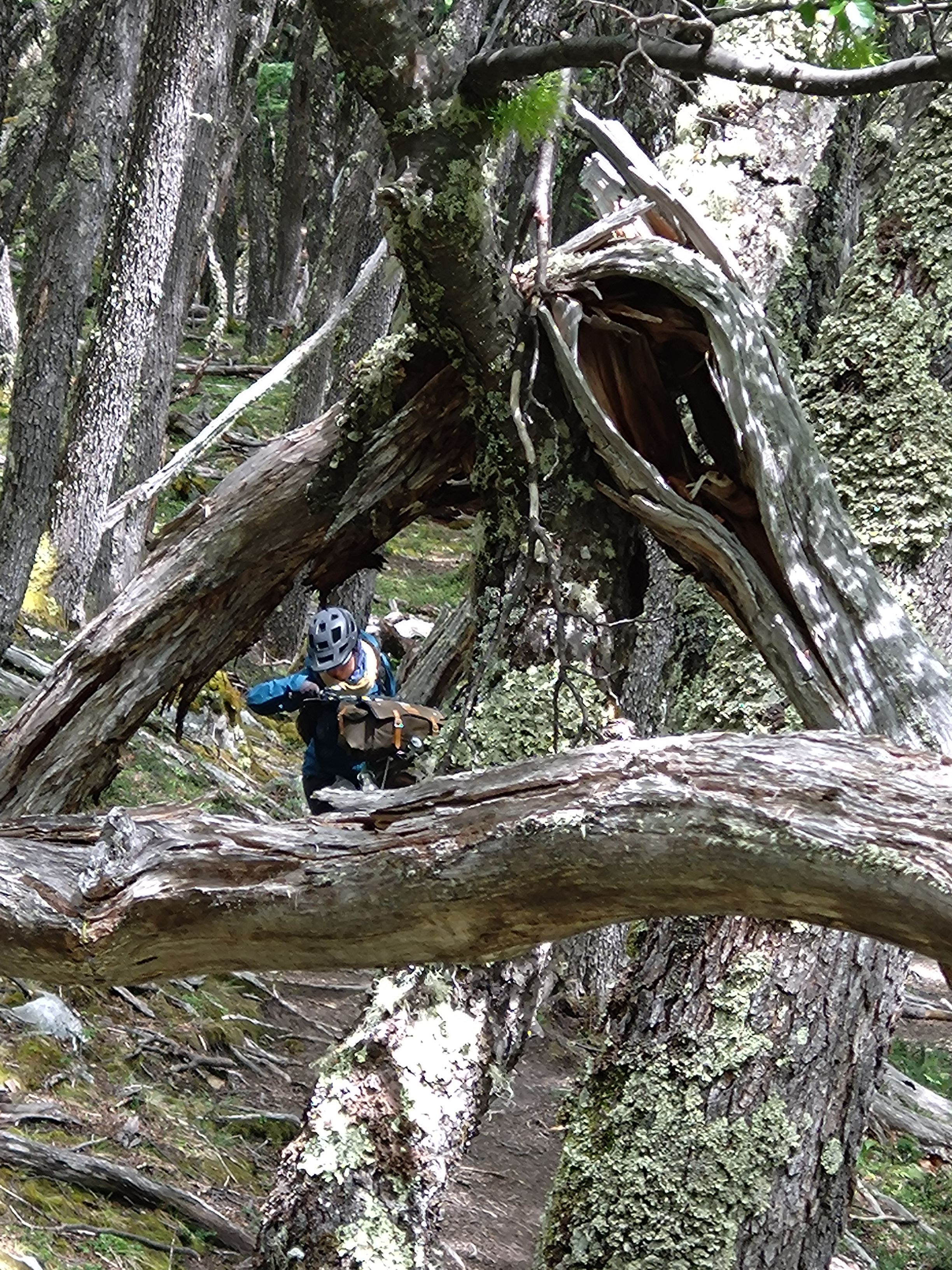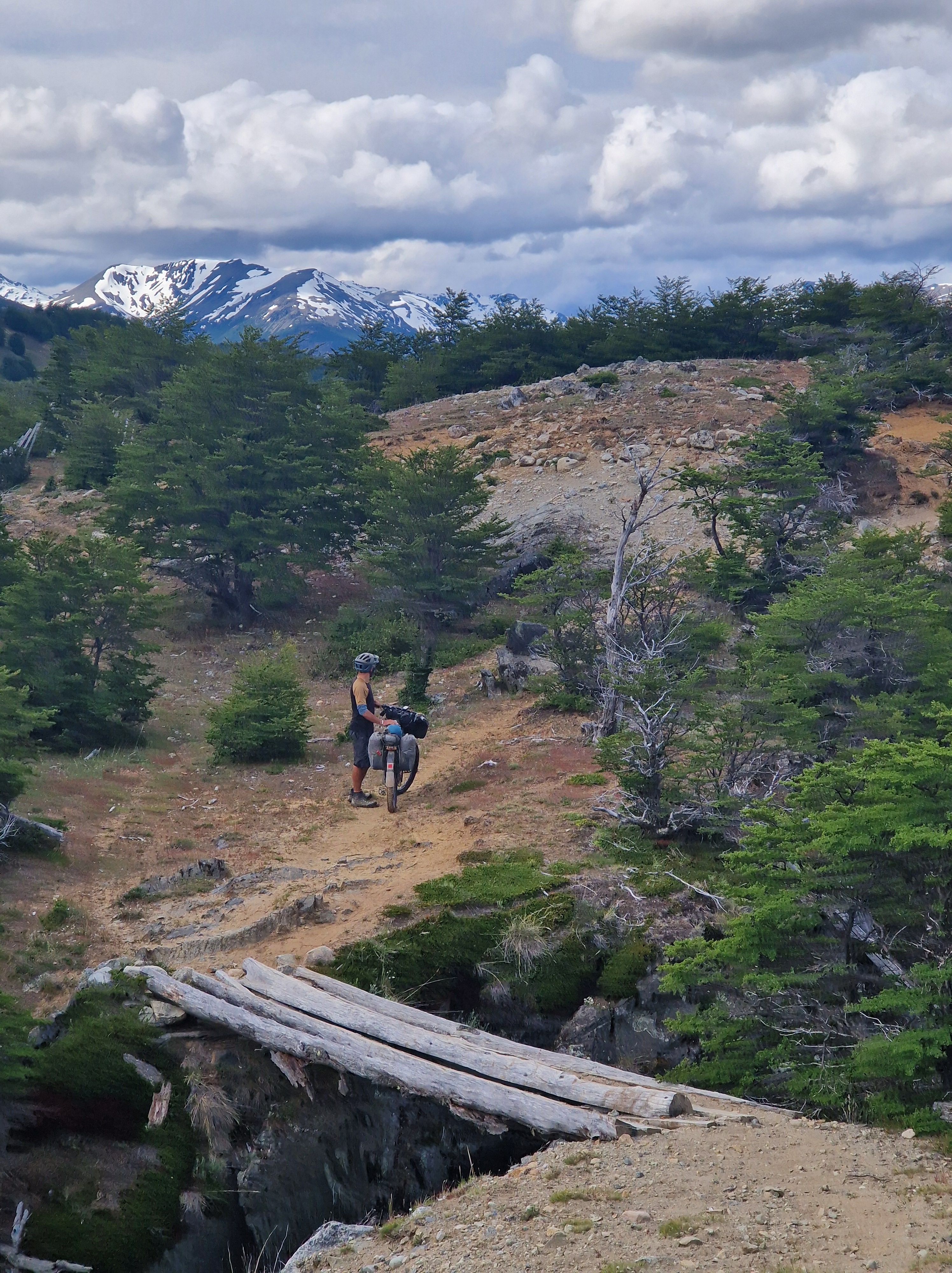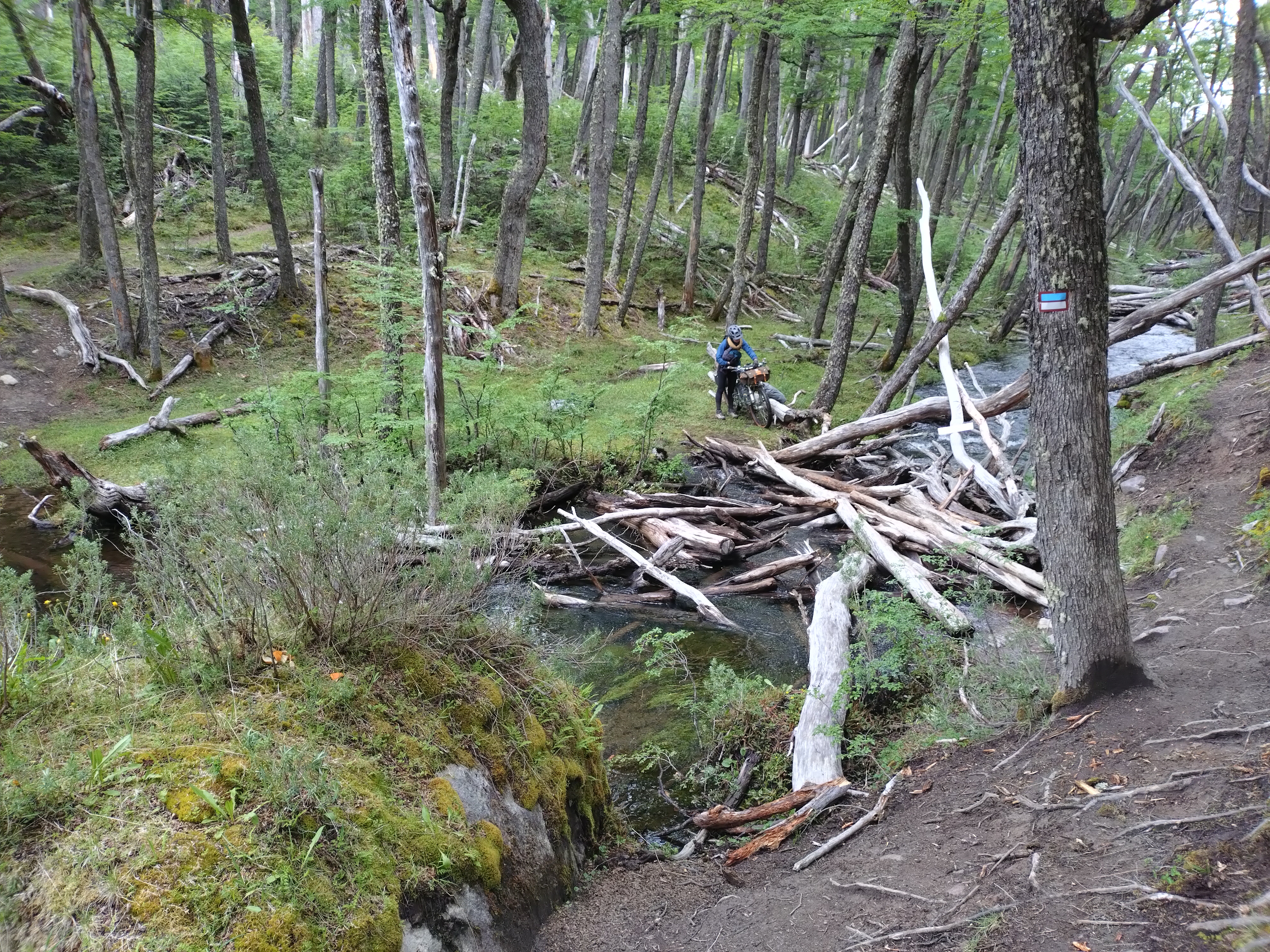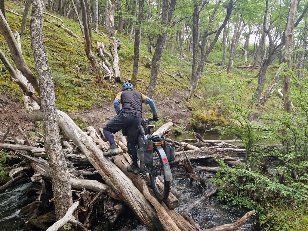 Through the other cyclists we’d met, and through our own research, we’d heard lots of tales about a small section of hike-a-bike that forms part of the route from El Chalten to Villa O’Higgins. It’s one of those stories where every time someone mentioned it, the arduous nature of the trail increased – the length became longer, the climb higher, the trail muddier, the time it takes increasing. It sounded like a trail that was right up our street and with all our previous experience of hike-a-bike on this trip, we figured it couldn’t be that bad. Again, we’d been warned that heading North made things more difficult as we would be climbing uphill for the 6km of trail. But we were keen to see how we would fare on bikes that are made for off-road riding and Ted reminded me of all our ‘training’ for this type of terrain from the European Divide. It was definitely the case that we had to push, carry and drag our bikes through narrow twisty, turny, rooty woods, over streams and across precarious log jams. As with all hike-a-bike it was physically demanding. Not easy. But in all honesty, despite being tired from our early start and sprint to the boat, we actually enjoy it. We took our time, there was no rush and we loved being in the beautiful untouched forest. We also took the opportunity to re-building some of the stream crossings where the logs had been washed downstream by the spring melt water. How on earth those with heavily loaded touring bikes manage it though, I do not know.