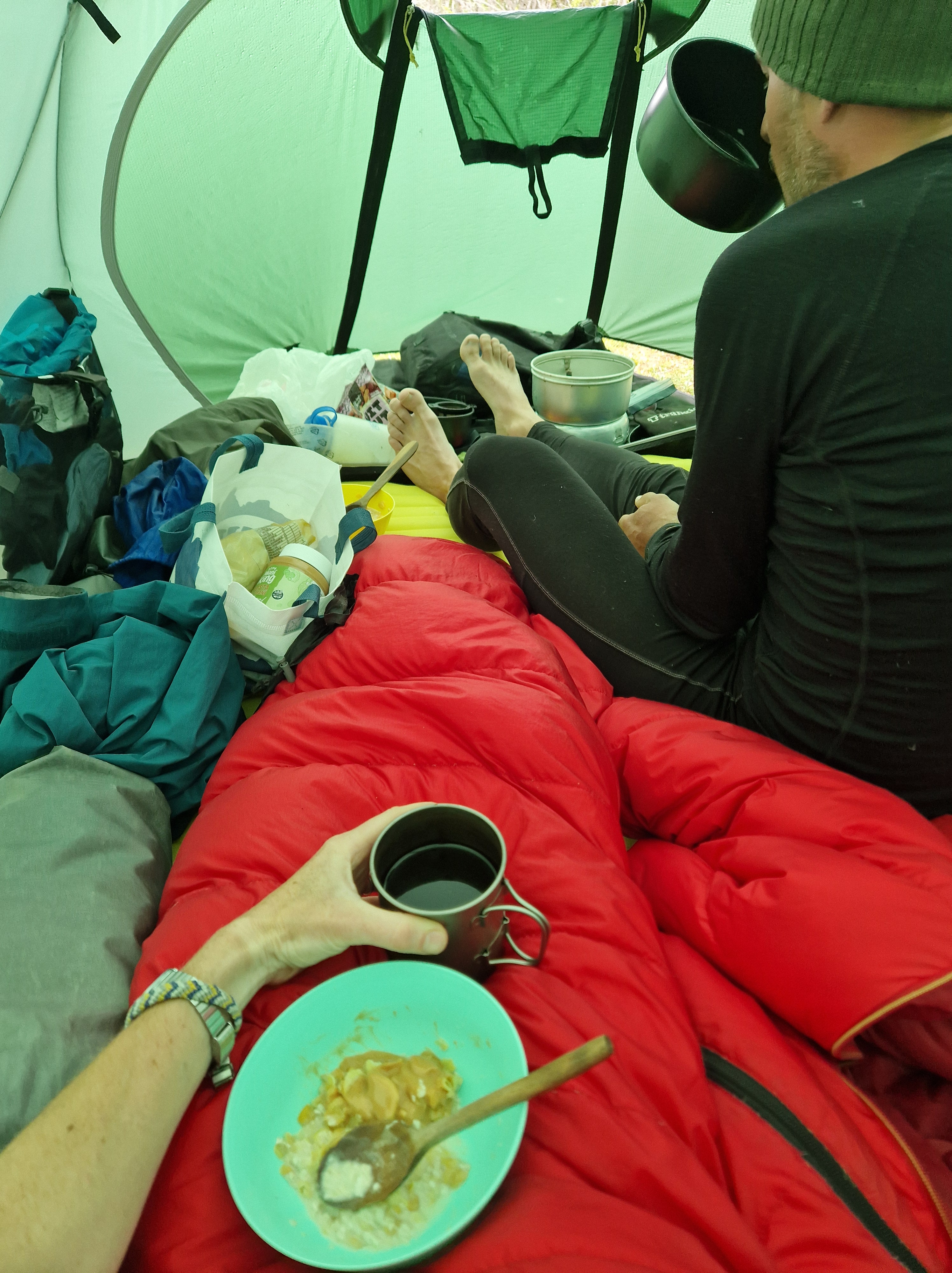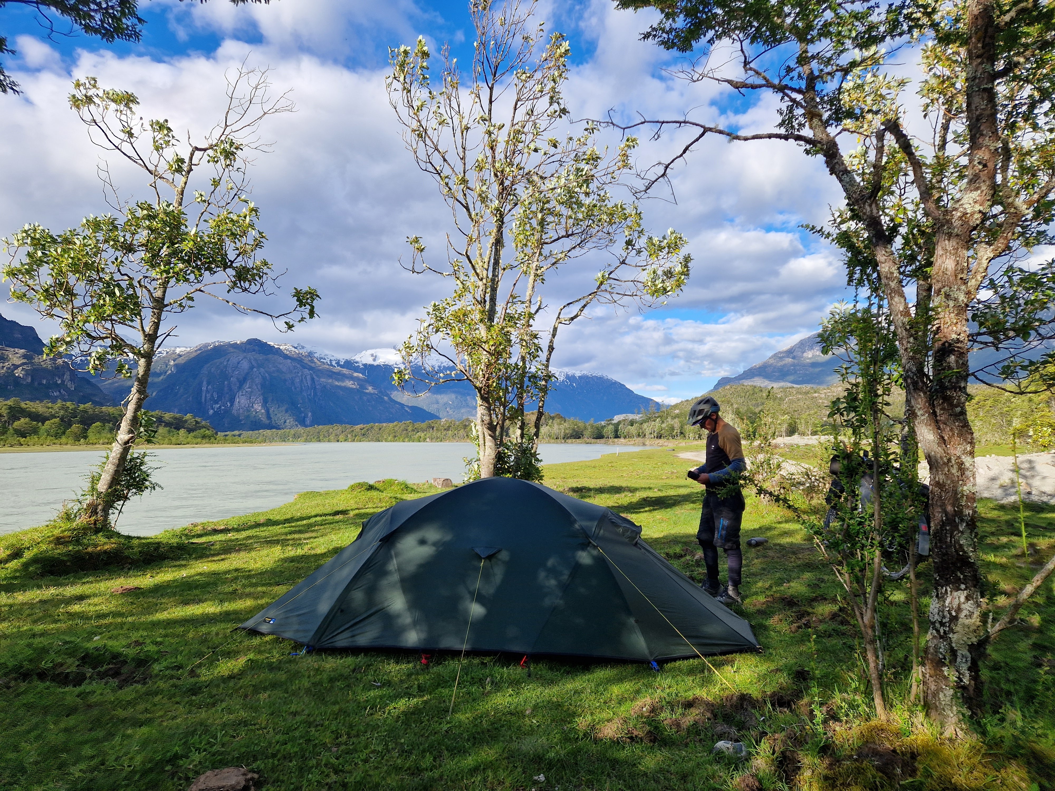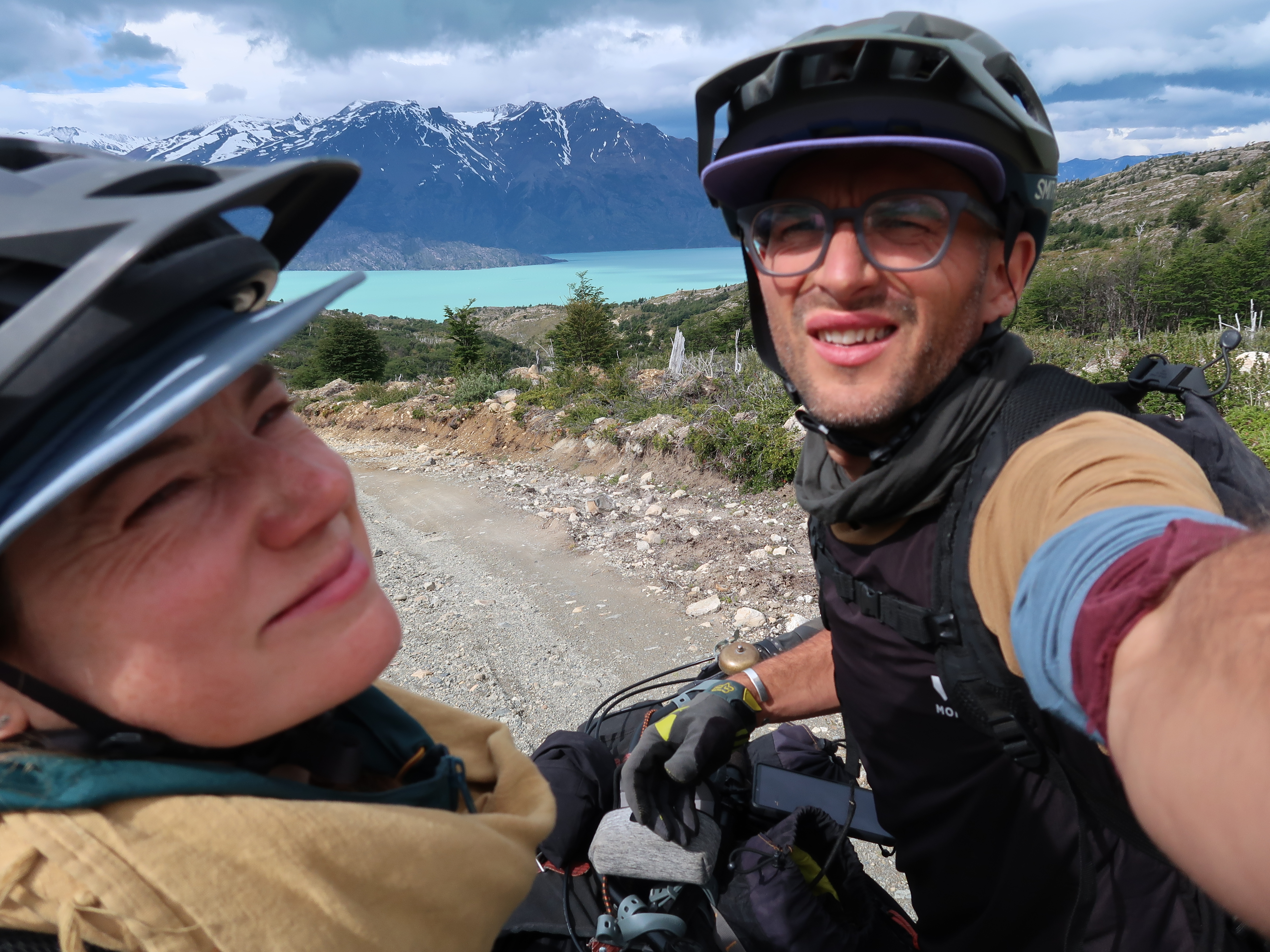 By 4pm we’d made it to the Chilean border where the trail ends and becomes a rideable, loose downhill doubletrack. By this point I was so tired. All I kept thinking about was being able to crawl into my sleeping bag and not getting out of it for more than 12 hours, not even to eat – the thought of eating breakfast at lunchtime tomorrow wrapped in cosy down became my dream! As we turned the final corner of the descent the glacial lake came into view, pure azure blue and surrounded by snow capped peaks – so unbelievably beautiful. And nestled just above it was a basic campsite, sheltered from the winds, only accessible to those on bike or foot, with this vista as it’s view – It was such a perfect place to spend a rest day and I couldn’t wait!
