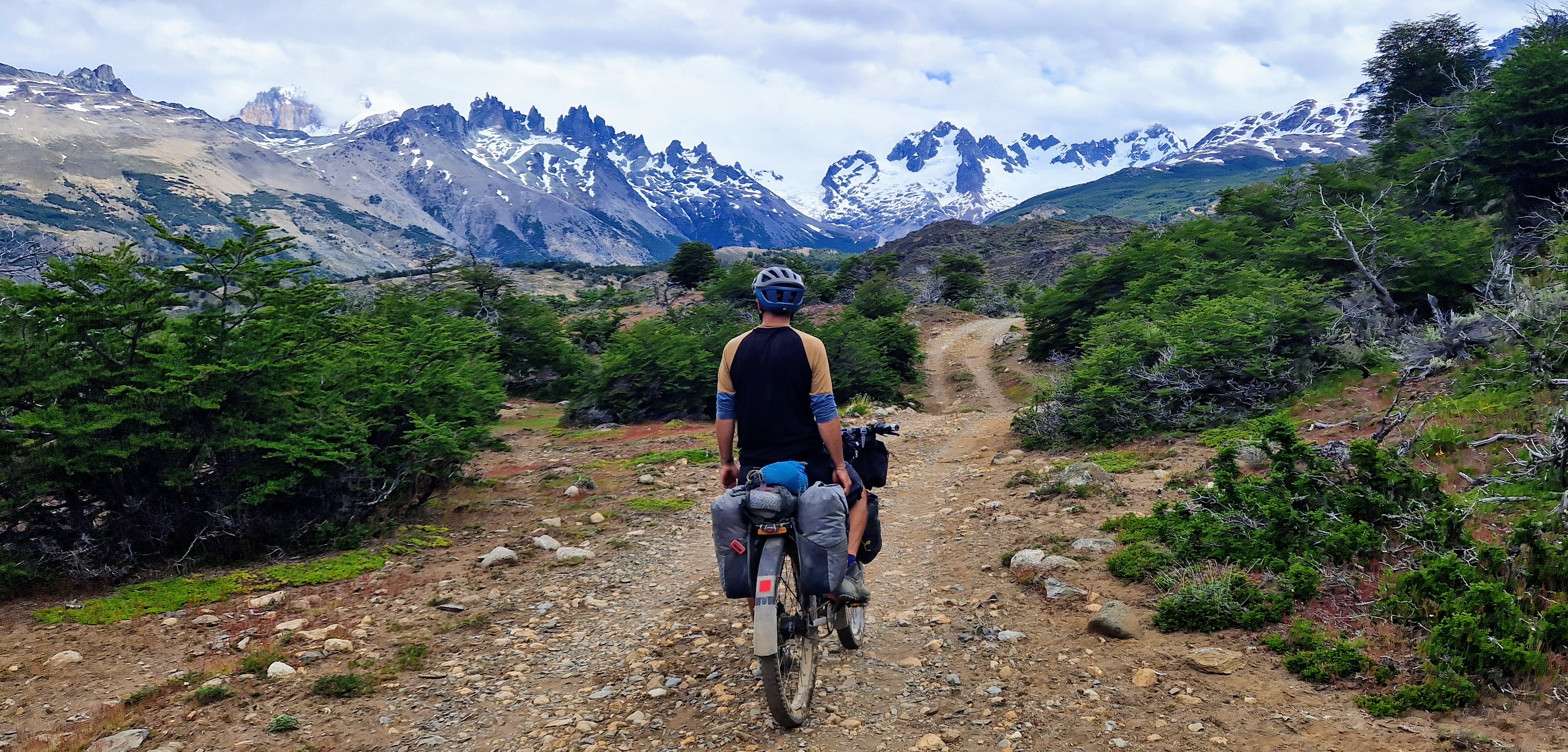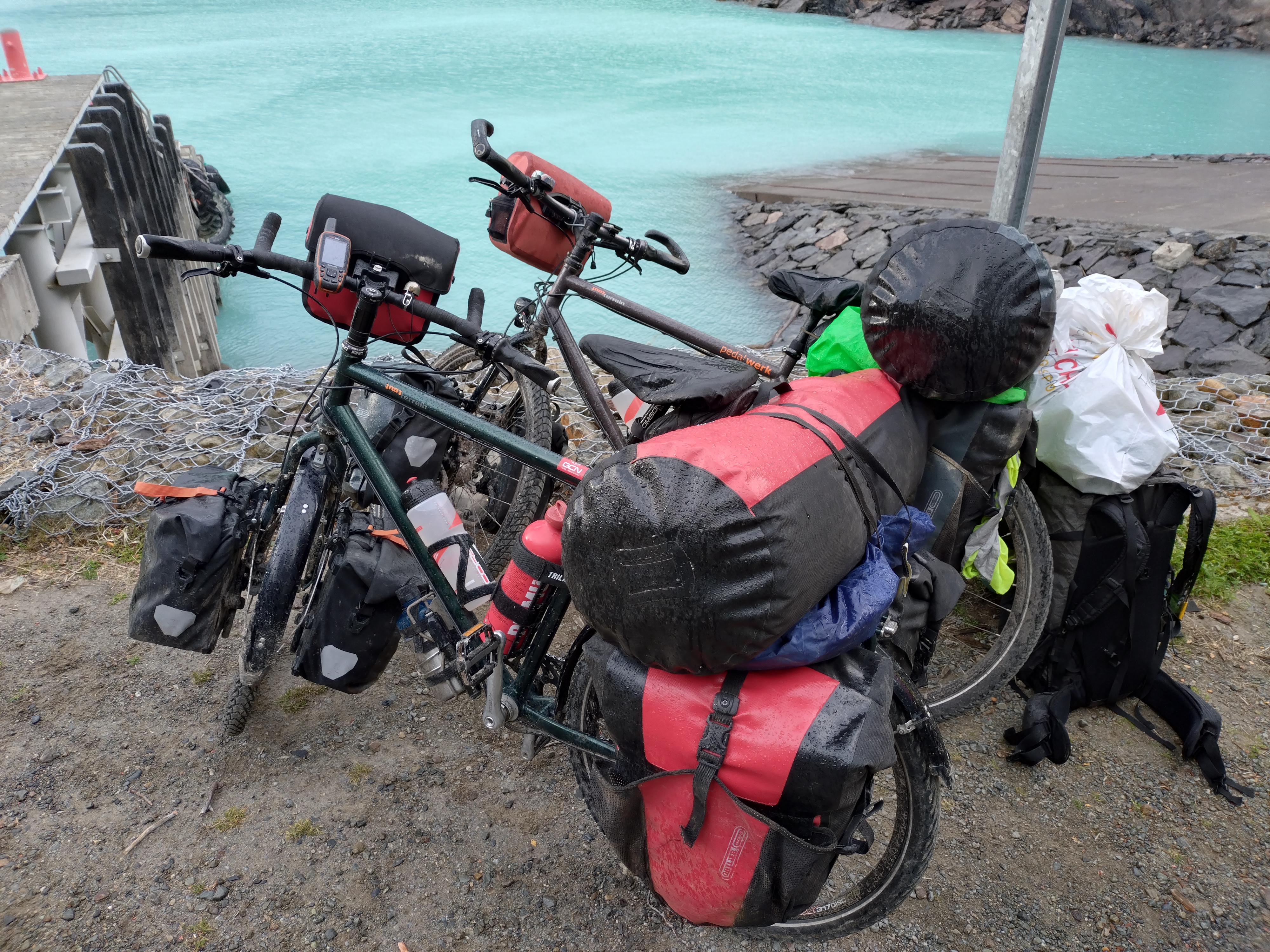 Despite our incredible approach to El Chalten that I’ve just mentioned, our time in the town definitely falls into the ‘ugly’ category of the good, the bad and the ugly. About 12 hours after having watched the sunrise over Fitz Roy we finally made it to the town (a long ol’ day) and we were shattered, and probably more hangry than we cared to admit. We had planned to stay a couple of nights and have a rest day to catch up on some much needed sleep, but on arriving in town we struggled to find any accommodation that was within our budget and had availability. After 2 hours of cycling around town, we managed to find a very grotty hostel that had a room free within our price range so we reluctantly took it. The next stop for us was the cash machine – as the hostel wanted paying in cash – but after a couple of attempts to get money out, and speaking to some other tourists, it became clear the one cash machine in town had run out of money! (Apparently it’s a pretty frequent occurrence due to the towns remote location, huge number of tourists, and crazy Argentinian inflation!) We did, however, have some money we could exchange, and on our way to do that we passed by the ferry boat office so stopped in to enquire about ferry times. The next section of our journey would involve a ferry over Lago Desertio, then crossing the Argentinan border, then a hike-a-bike, then a gravel track, then entering Chile and finally another ferry to Villa O’Higgins in Chile. We knew the second boat crossing didn’t run everyday, but having worked out timings we were still optimistic we could fit in a much needed rest day in El Chalten. Sadly this wasn’t to be. The first ferry wasn’t running on the day we thought, which meant we had to catch it the following morning. This will work, Ted optimistically said to me in the ferry ticket office. Then the guy mentioned that the ferry leaves at 10am from the dock 40km out of town (uphill, along an unpaved gravel road) we still optimistically looked at one another and said we can do it – its only 40km, right!?! So we bought our tickets and then set about thinking about food, water, route for the next few days (that we were planning to do on our rest day). A quick stop at the supermarket, including the obligatory worry that we were buying way too much, and we were back at the grotty hostel to try and repack the bikes with a few days supplies (which always feels like a struggle). By 9pm we still hadn’t eaten or taken a shower and I think we finally got to bed around midnight – by which point the hostel had become loud with the noise of other guests and resetting the alarm for 4am again really wasn’t fun any more!