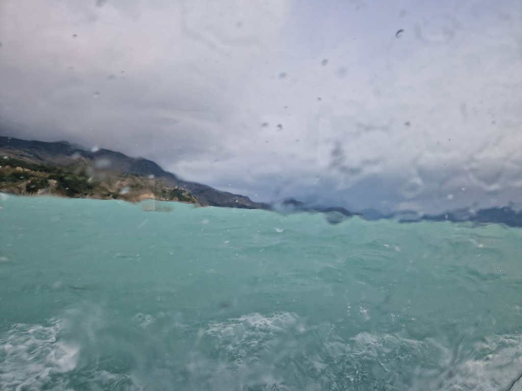 After our much needed rest day at the picture perfect campsite, we had our final boat ride that would take us to Villa O’Higgins. At 7am we were waiting at the dockside with the other 10 or so passengers when a small boat, the size of an inshore lifeboat rig (but with a roof) arrived. This was it. It was tiny. We’d heard that crossing the lake (which is huge), can be pretty dicey as there are various different winds that all converge on its surface but I still wasn’t expecting waves as big as they were – it was hard to believe we were on a lake and not in the sea. Safe to say, Ted did not enjoy the crossing! He spent most of the three hour journey looking as white as a ghost at the back of the boat, losing his breakfast overboard. For me, I enjoyed the rollercoaster with great views, there were only a couple of nerve-wracking moments when even the boat captain made a few alarmed noises. But after 3 hours we made it to Villa O’Higgins and hot footed it through the rain to a laidback, cosy hostel (El Mosco) so Ted could recouperate by the warmth of the toasty warm kitchen stove.