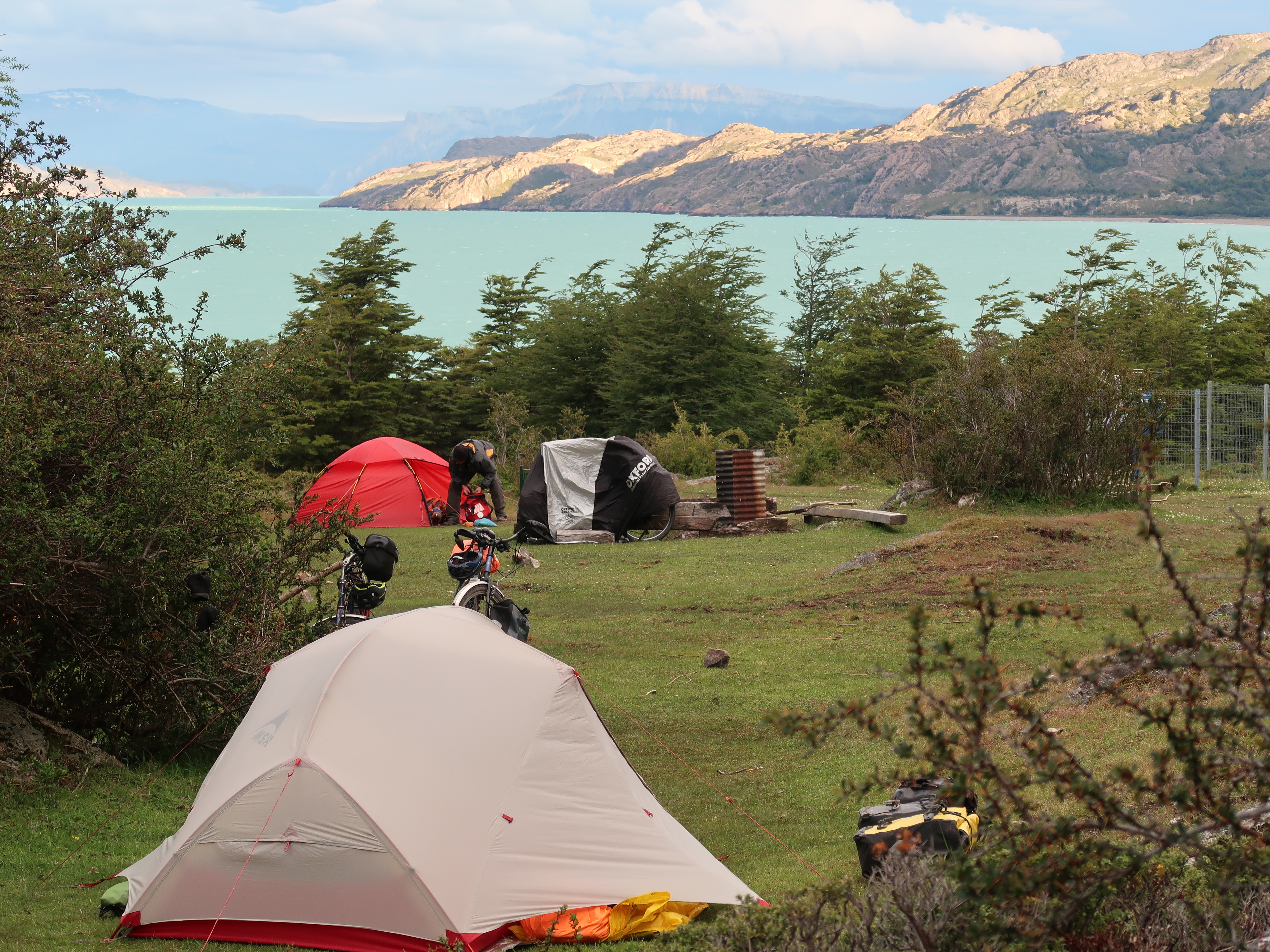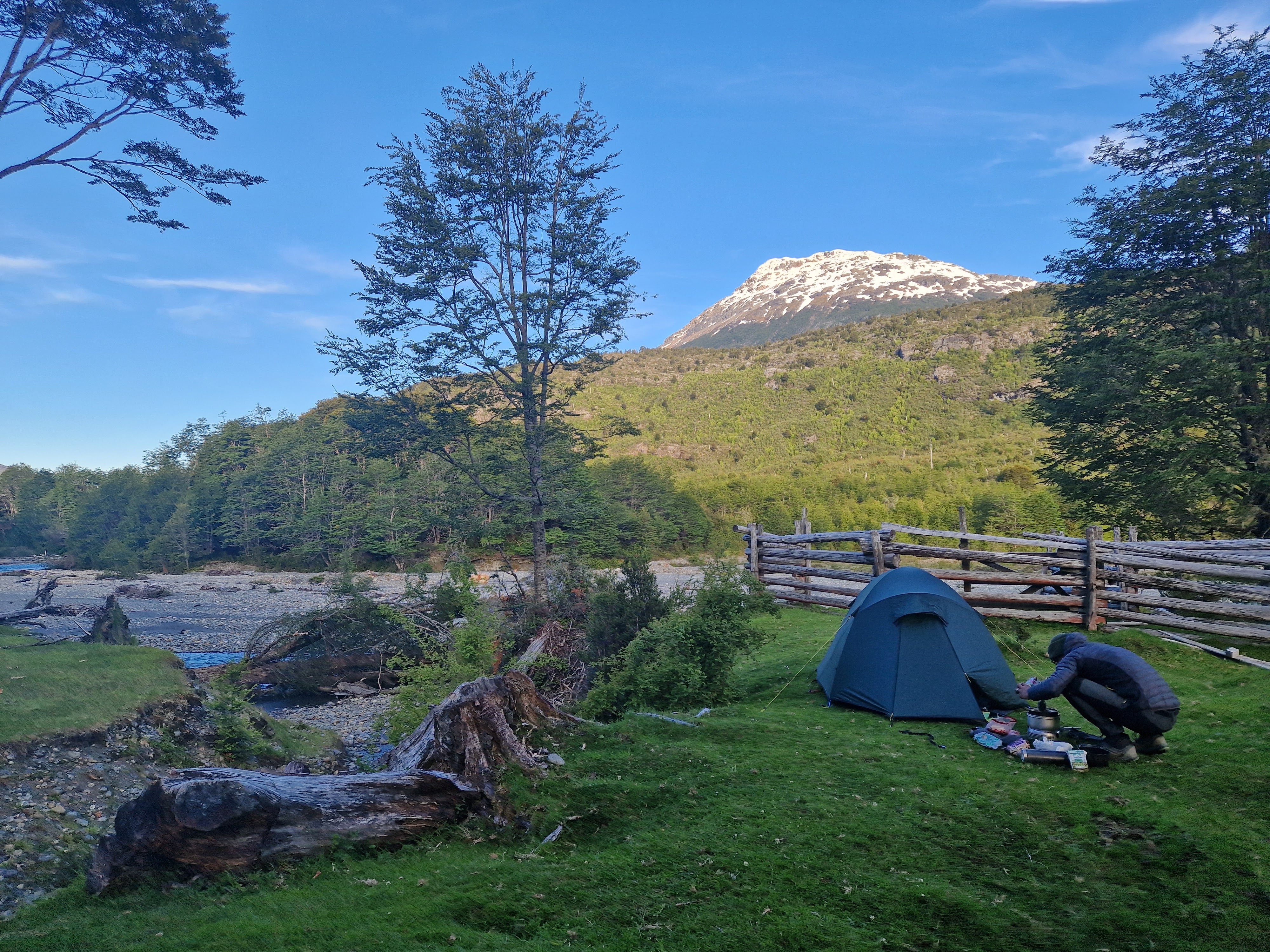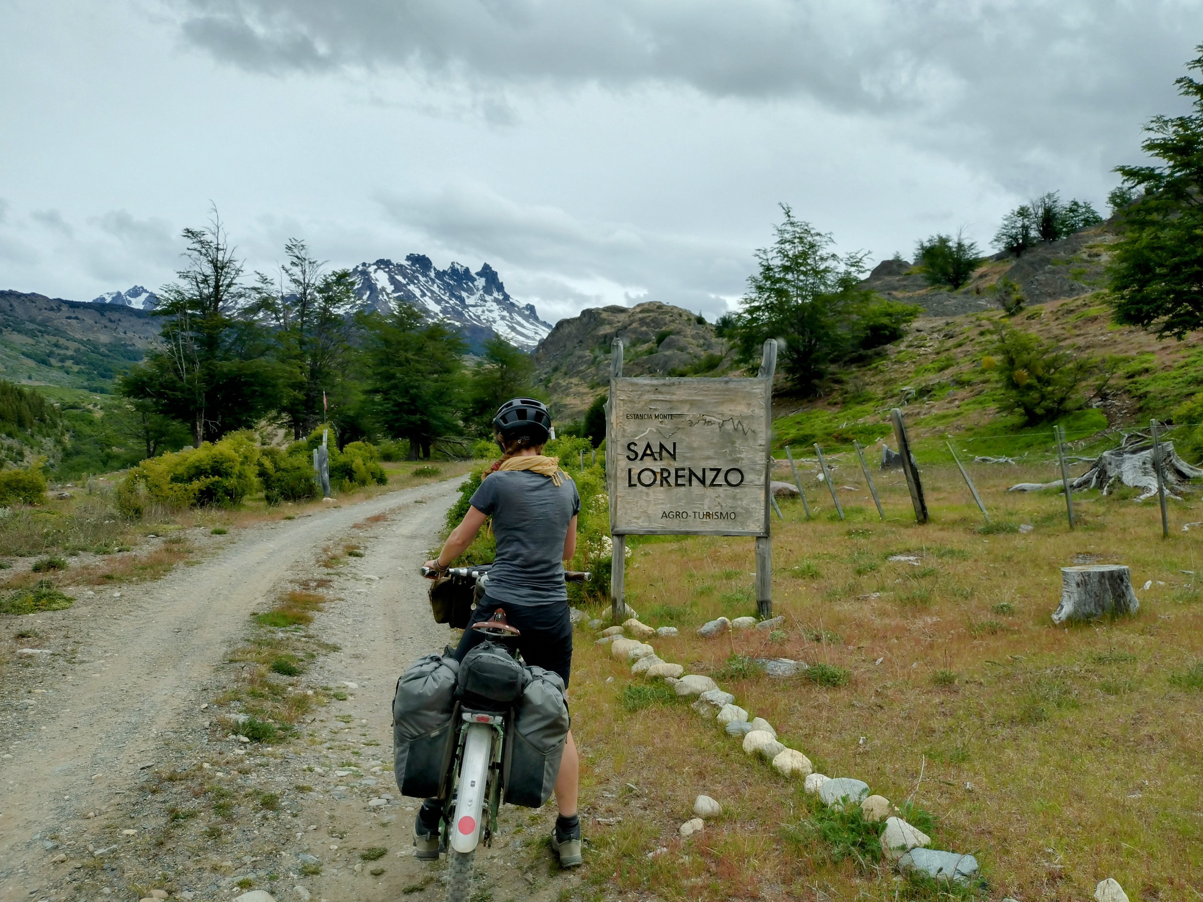 We hiked to the refugio this morning (unintentionally accompanied by Kiera, a gentle, calm, well-behaved but super stinky golden retriever from the farm!) having camped last night at Fundo San Lorenzo, an Estancia that owns the land around here and makes some additional income from mountaineers who come to climb the mountain and the occasional tourist who leaves the beaten track for something a little different (like us!). We spent the whole day yesterday cycling to the Estancia – firstly along a very bumpy, bone rattling gravel road, and then along the farm ‘driveway’ which is 10km of off-road riding, and involves fording two rivers and climbing 300m. We didn’t see any traffic after our first hour of riding yesterday and to say that the farm feels remote is a bit of an understatement, but it was well worth the effort to experience both the Estancia and the mountain refugio. It’s a pretty special place and we feel privileged that the family at the Estancia are happy to share it with the likes of us – if only for a few days!
