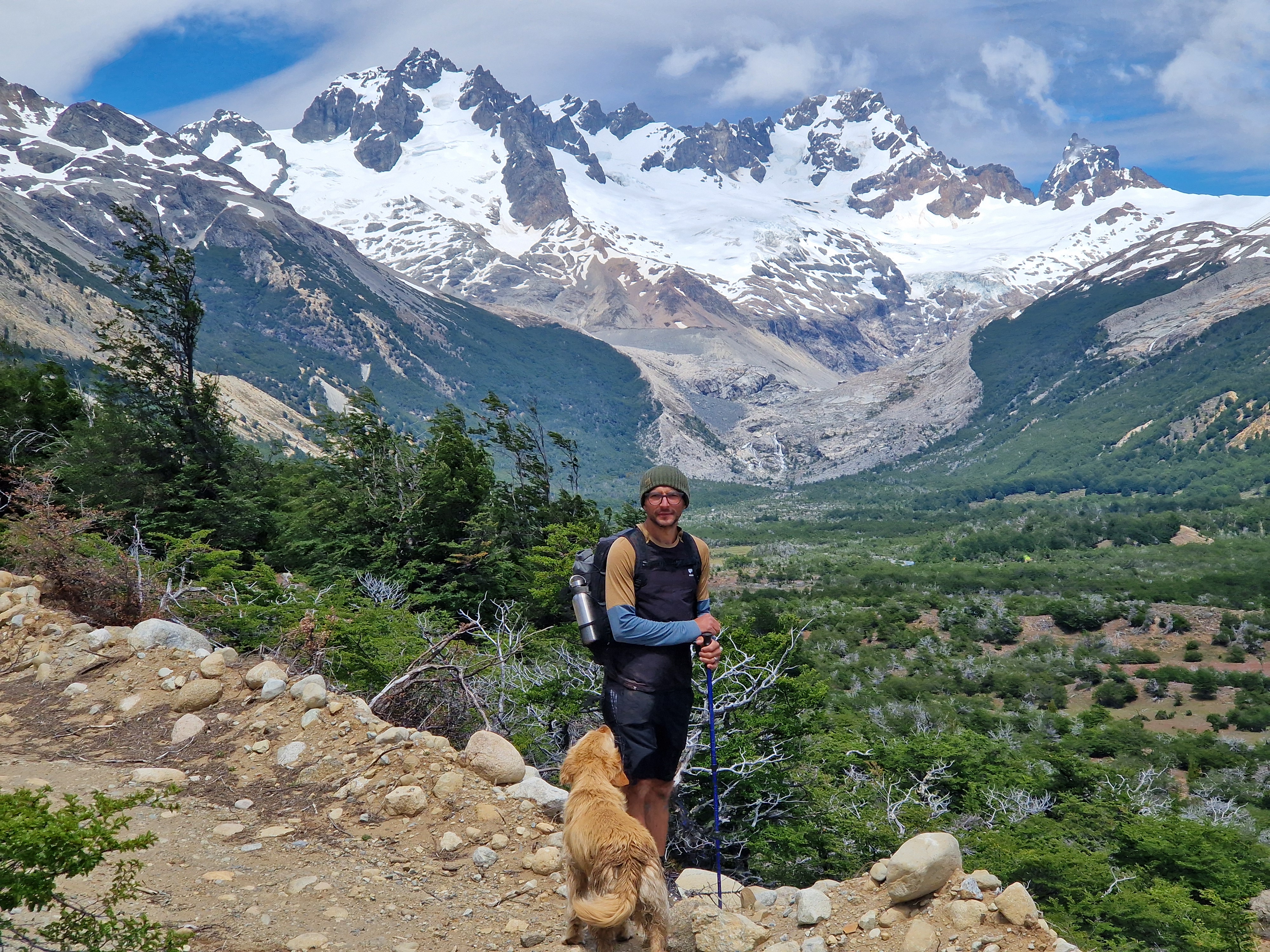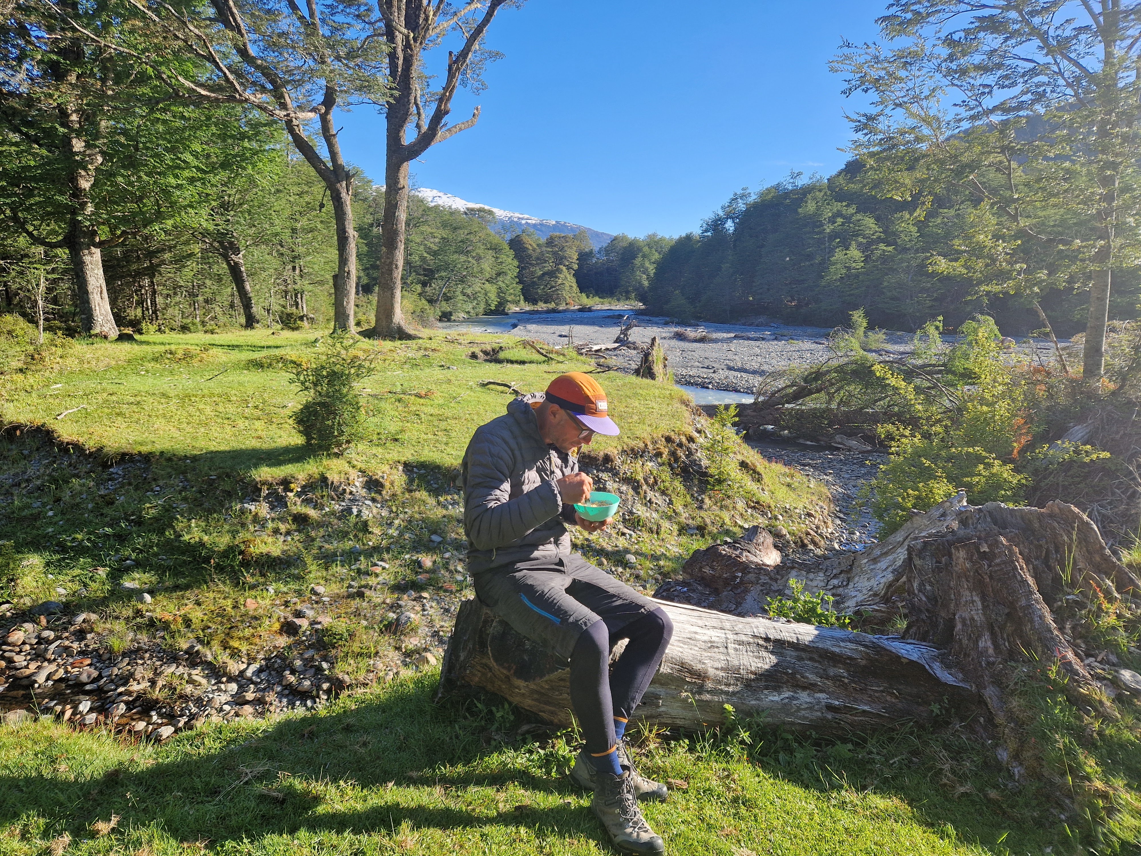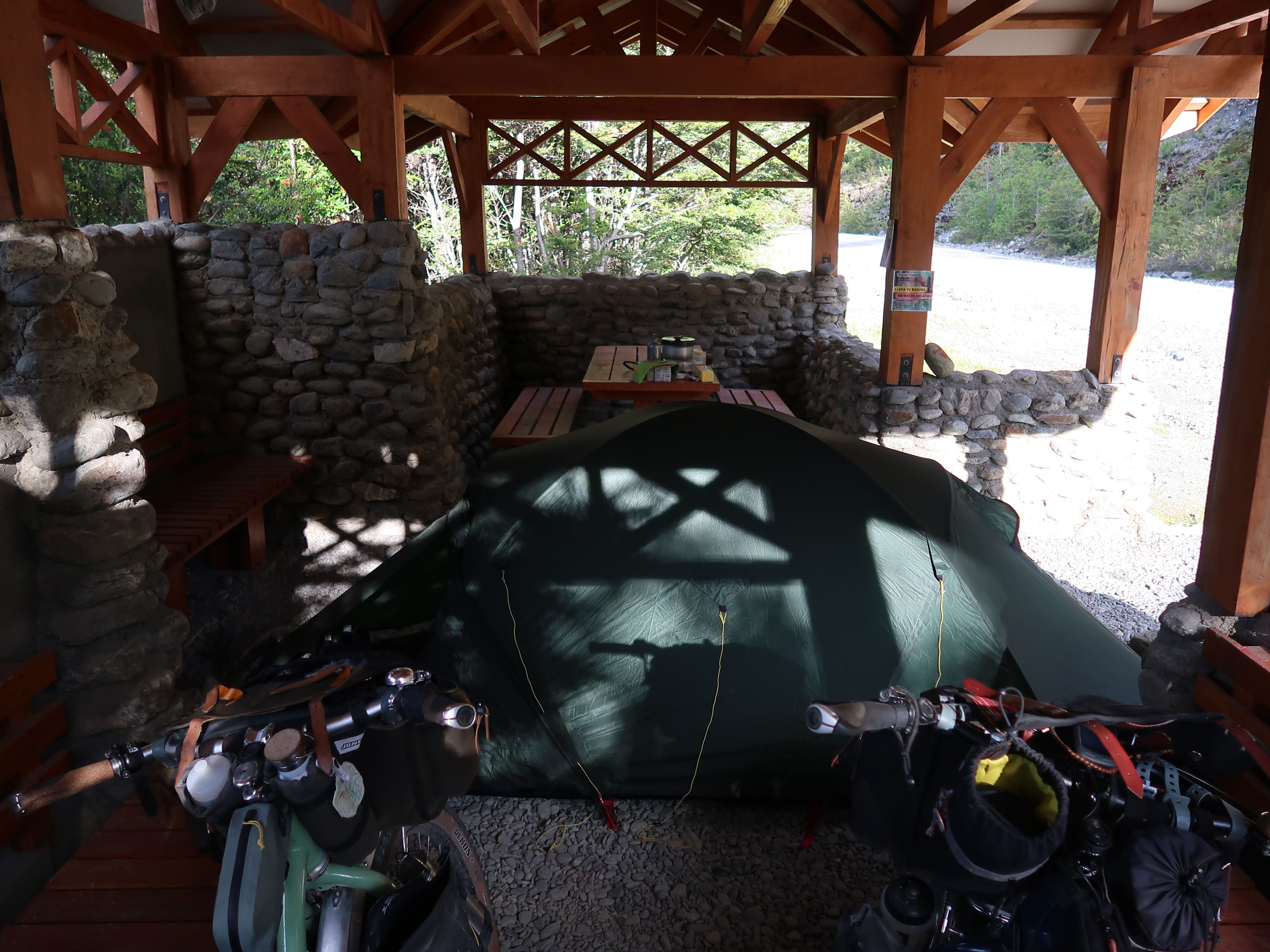 We hiked to the refugio this morning (unintentionally accompanied by Kiera, a gentle, calm, well-behaved but super stinky golden retriever from the farm!) having camped last night at Fundo San Lorenzo, an Estancia that owns the land around here and makes some additional income from mountaineers who come to climb the mountain and the occasional tourist who leaves the beaten track for something a little different (like us!). We spent the whole day yesterday cycling to the Estancia – firstly along a very bumpy, bone rattling gravel road, and then along the farm ‘driveway’ which is 10km of off-road riding, and involves fording two rivers and climbing 300m. We didn’t see any traffic after our first hour of riding yesterday and to say that the farm feels remote is a bit of an understatement, but it was well worth the effort to experience both the Estancia and the mountain refugio. It’s a pretty special place and we feel privileged that the family at the Estancia are happy to share it with the likes of us – if only for a few days!
