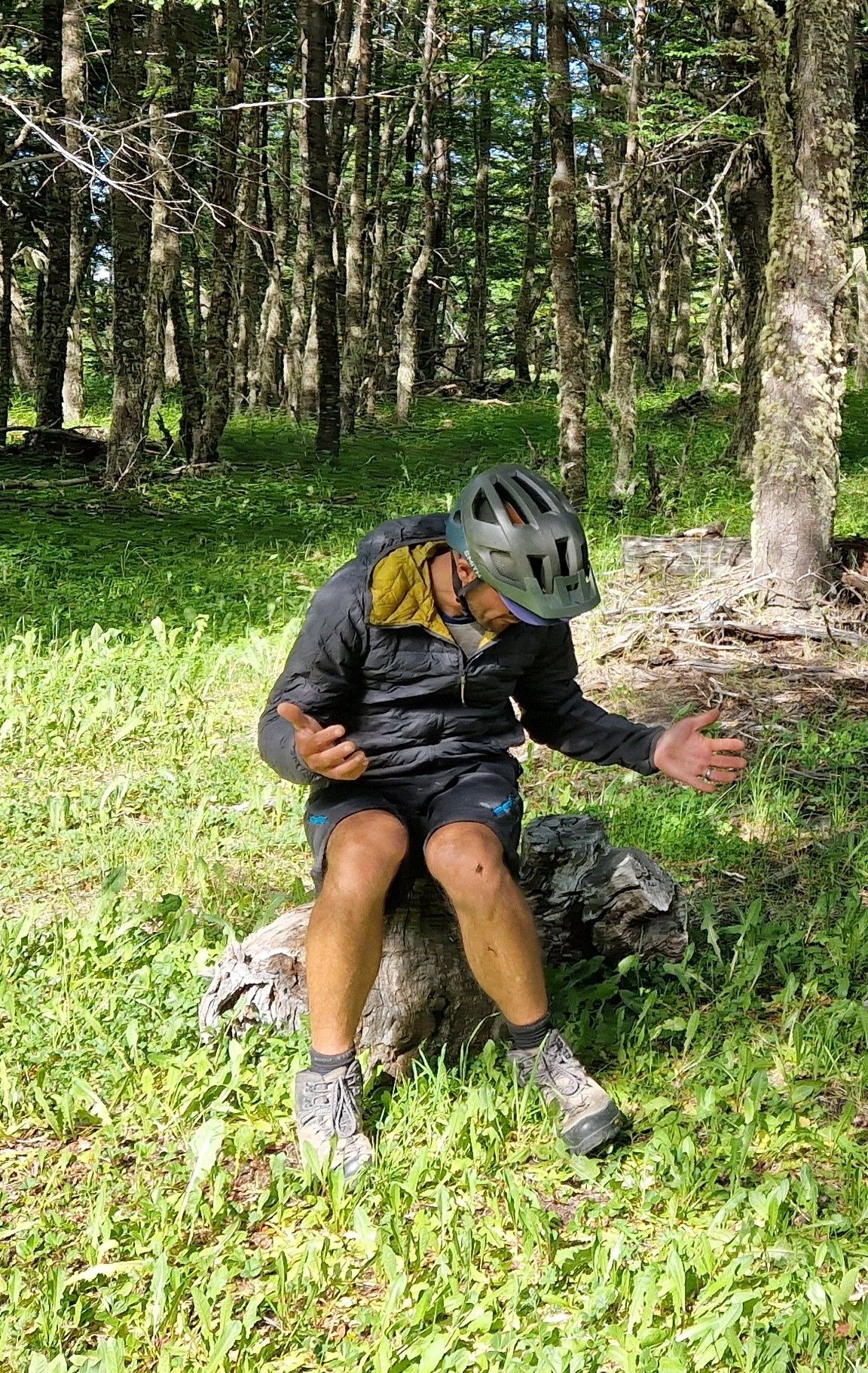 A little later on, mid-way up our first (of many) hike-a-bike sections, we looked up to see another cyclist pushing his bike down the hill. We couldn’t quite believe our eyes – Ted’s first words to him were ‘Are you real!?’. I think it was the shock of seeing another human in such a remote place, and not only that, but one of our tribe. Andrey was cycling the same route as us, but in the opposite direction. Bumping into each other at this point in the trail was pretty uplifting for all of us – it meant that the trail and rivers were passable in each direction. We took the time to share stories and advice about the trail – the tips about the frequency of the river crossings we were yet to endure, and which fork in the trail to take to avoid lots of tree fall we’re priceless advice from Andrey. But most of all we loved seeing his tyre prints in the dust. They were a reassuring presence that we were on the right track and that no matter how hard, the route was possible. Our positivity and enthusiasm recharged by our chance encounter, we pushed on enjoying the high mountain plateaus and incredible views, now with the added bonus of the most up to date knowledge of the trail to come.
