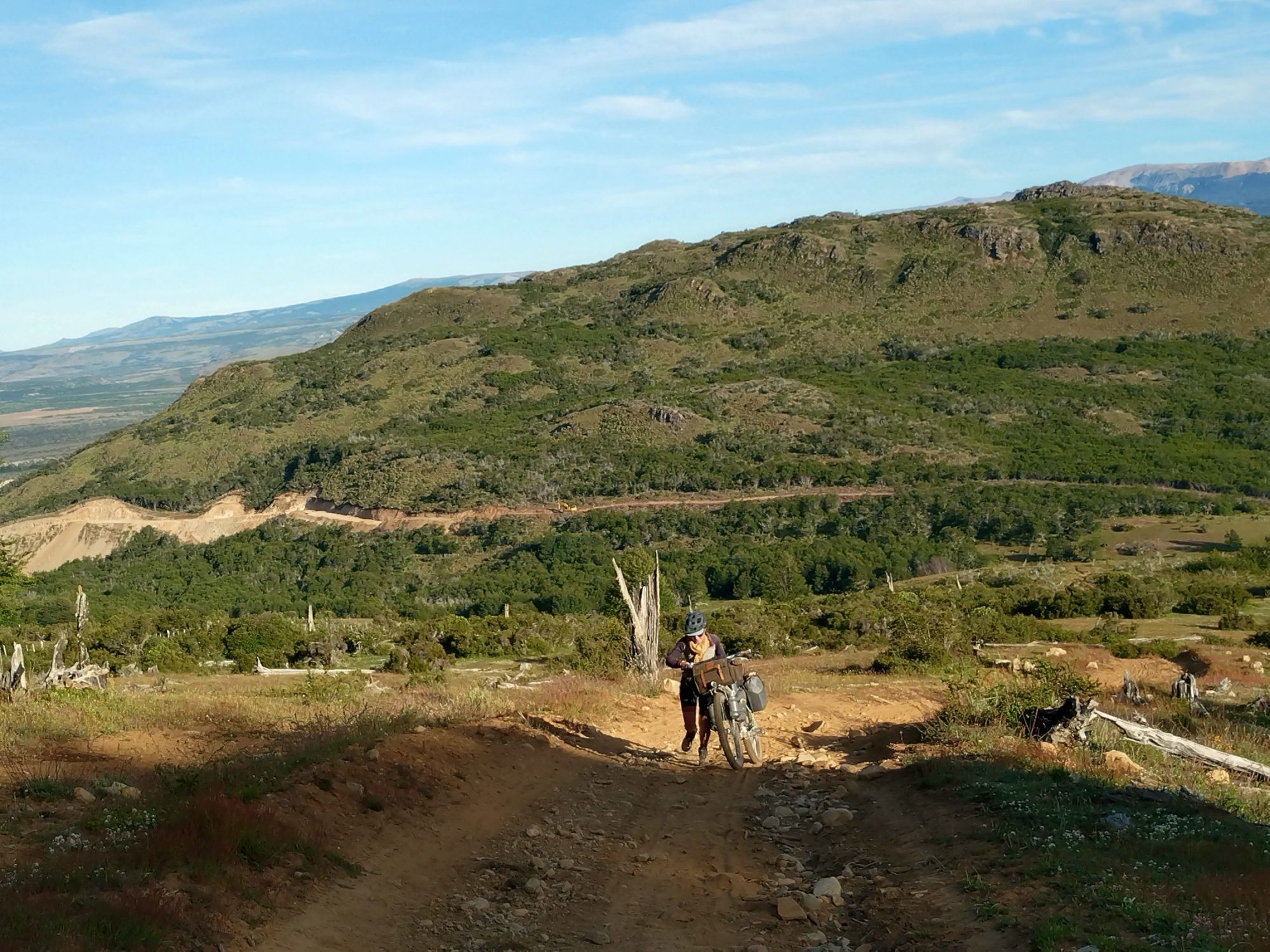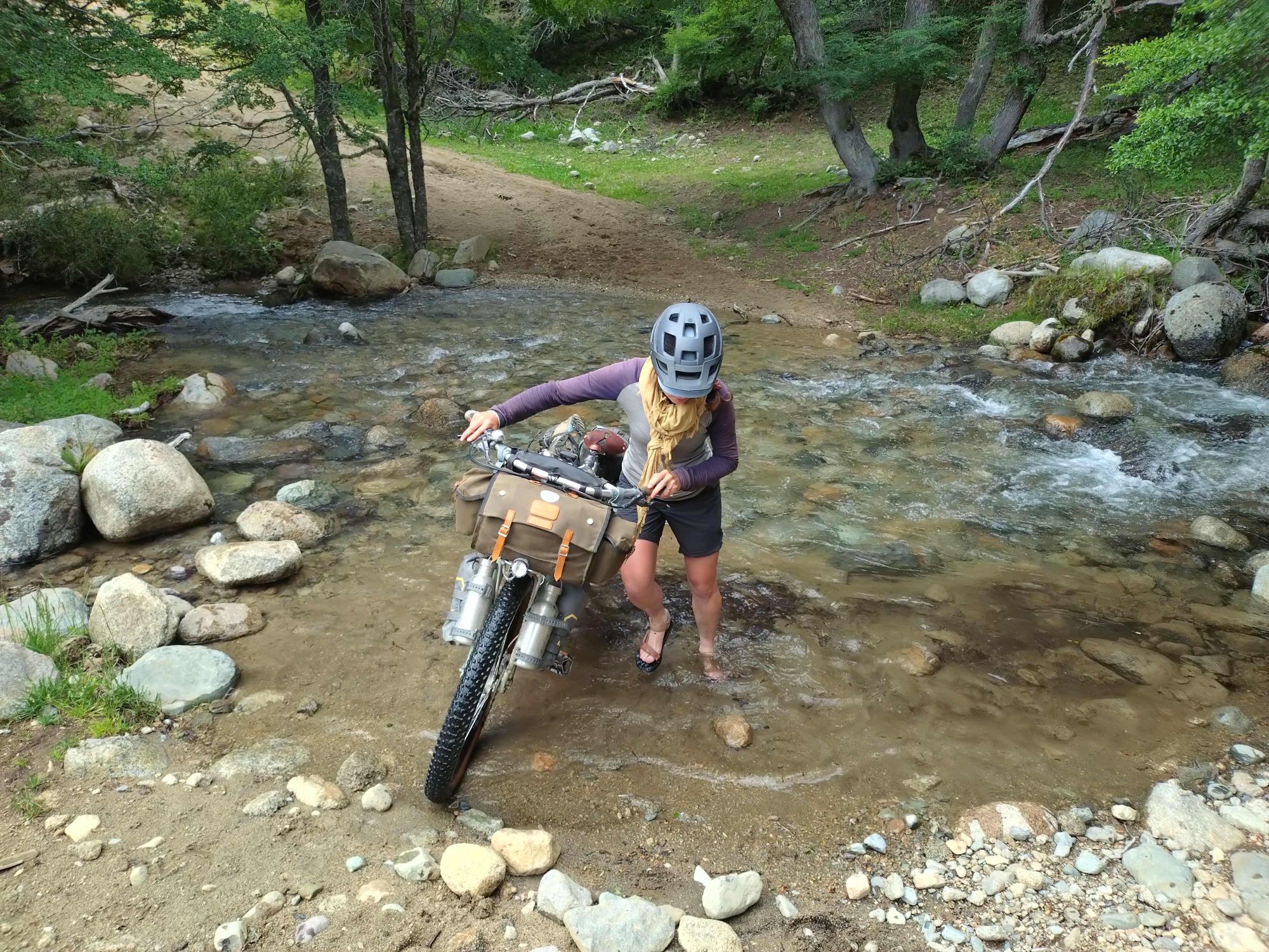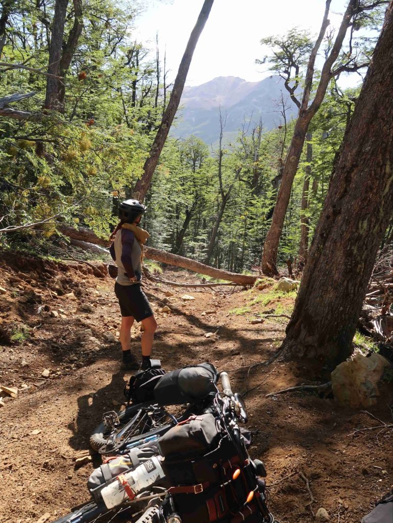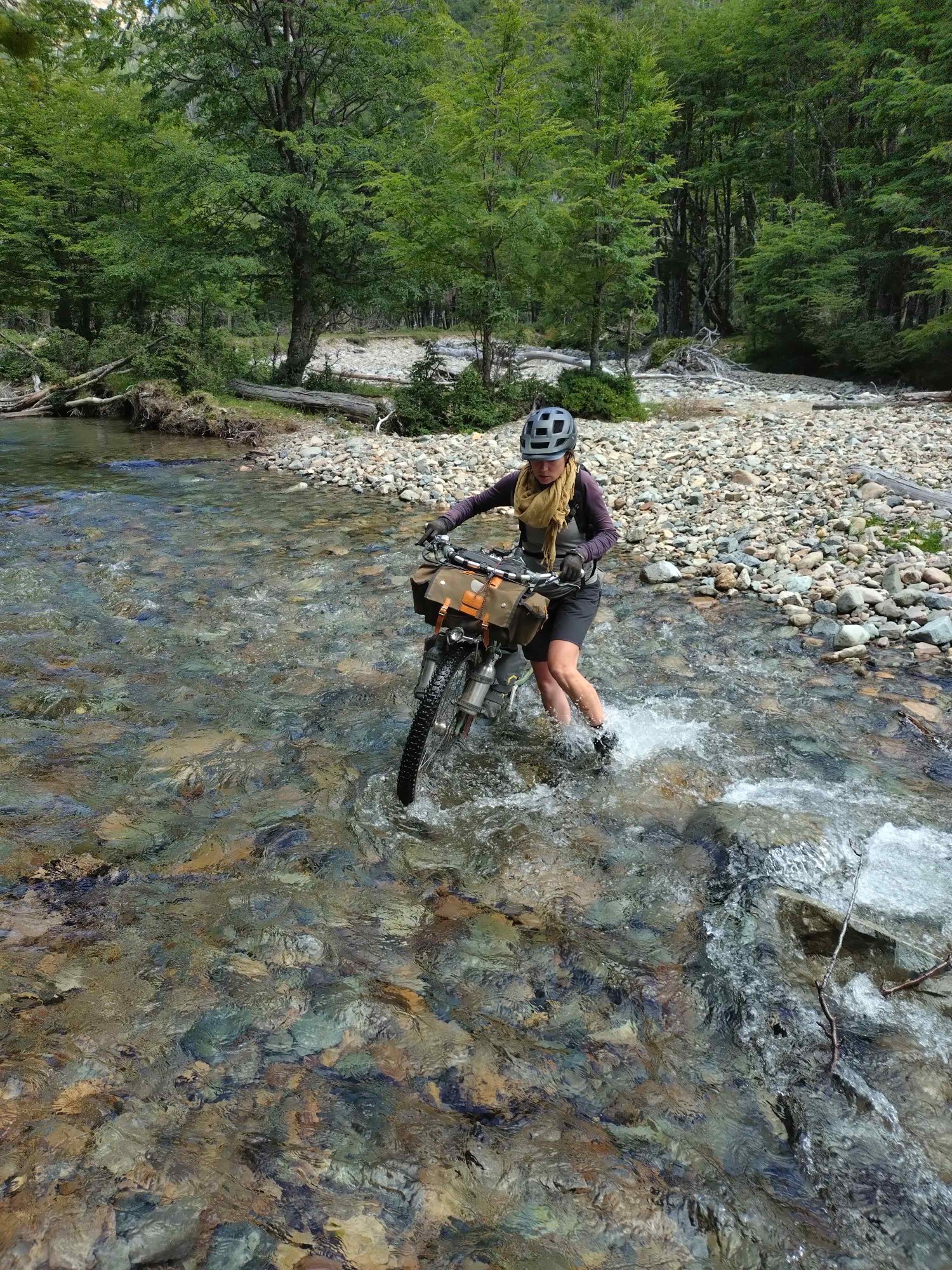 The following morning, we head out enjoying the trail that wound its way through beautiful, silent old woodland and although we climbed a lot, it was mainly rideable. We passed the re-entrant we had seen on the map when looking for water the night before and splashed through the stream that ran over the trail there (smug face!). The trail felt ancient, like we were following the footsteps (or more accurately hoof prints!) of generations of gouchos for whom this track was a lifeline. We immediately felt immersed in nature, just as we had been dreaming about for all those hours on the Carretera Austral. It was magical. But all the while we were a little apprehensive. We knew we had another big river crossing coming up, and we just had to keep our fingers crossed that this one was passable.
