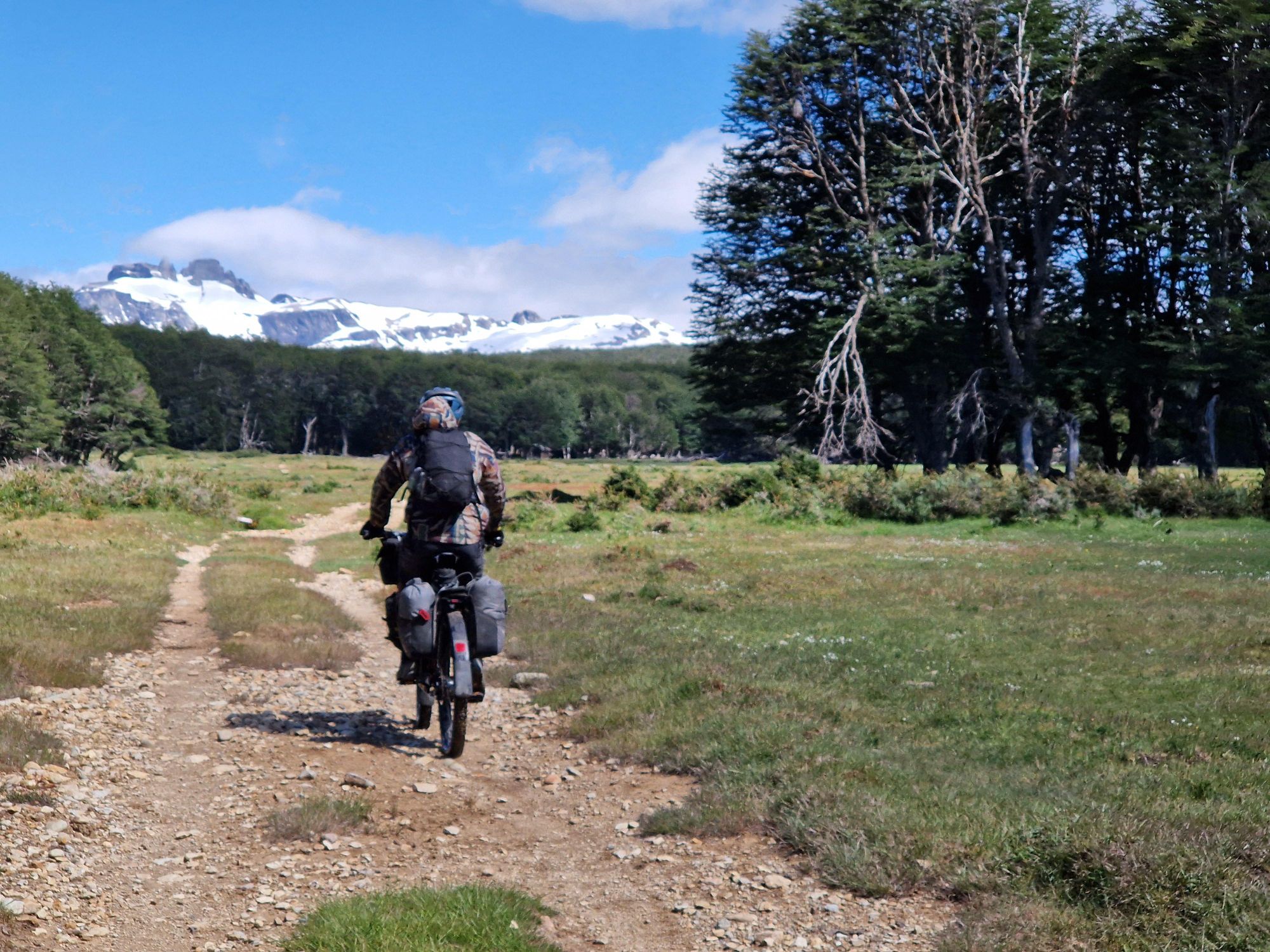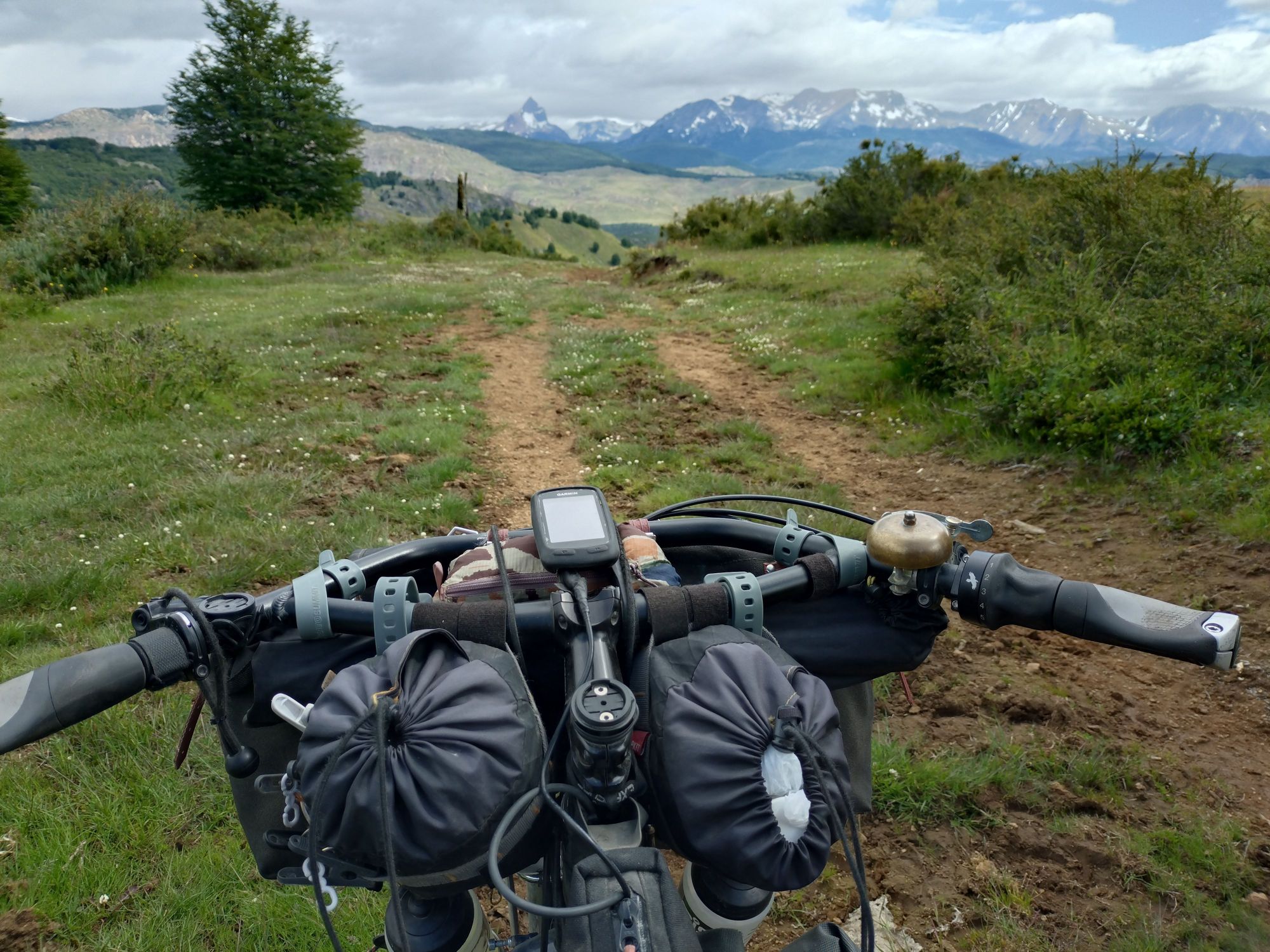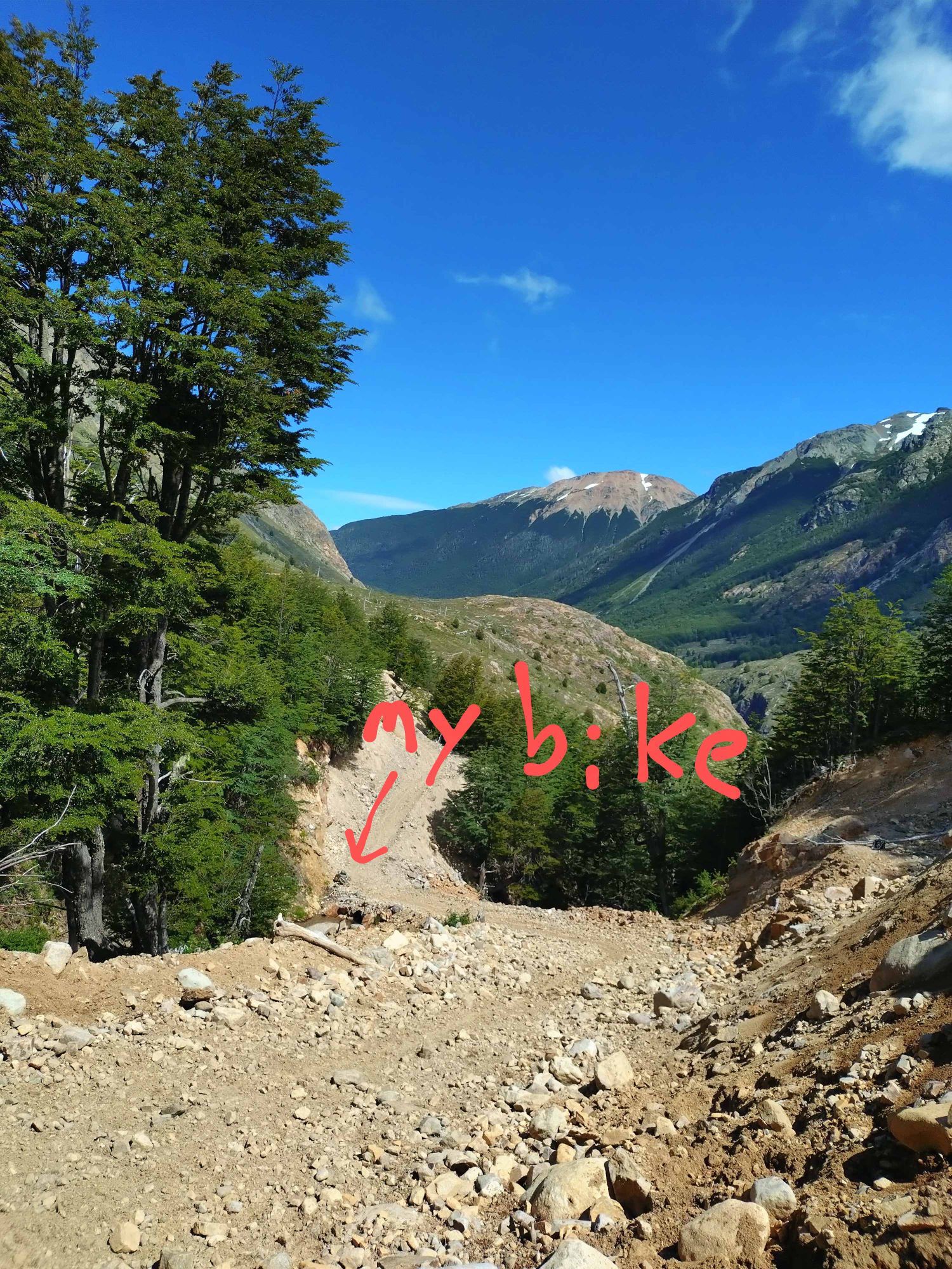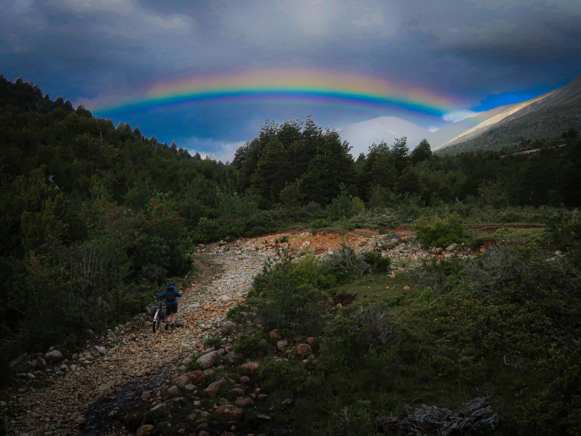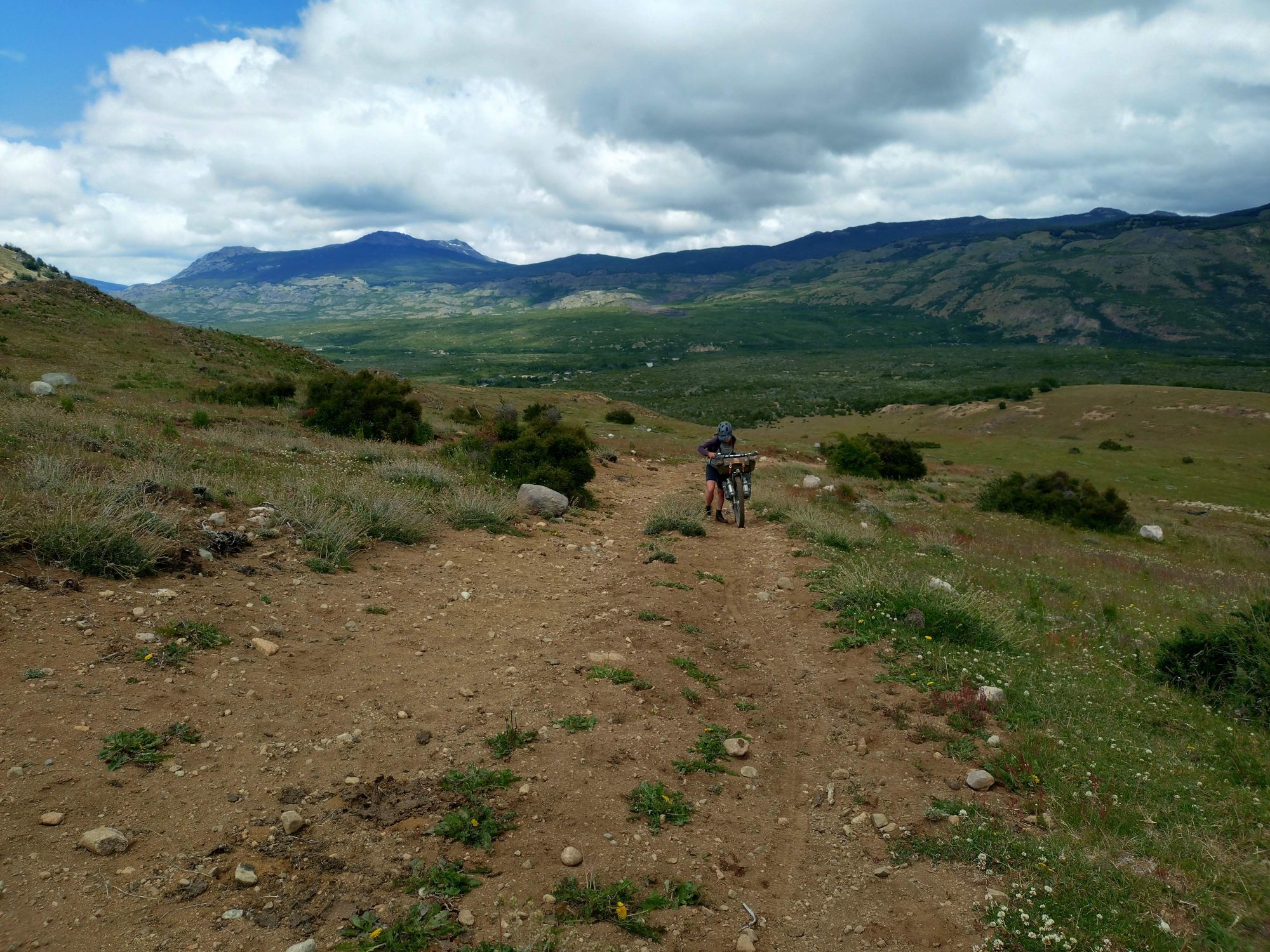 The following morning, we head out enjoying the trail that wound its way through beautiful, silent old woodland and although we climbed a lot, it was mainly rideable. We passed the re-entrant we had seen on the map when looking for water the night before and splashed through the stream that ran over the trail there (smug face!). The trail felt ancient, like we were following the footsteps (or more accurately hoof prints!) of generations of gouchos for whom this track was a lifeline. We immediately felt immersed in nature, just as we had been dreaming about for all those hours on the Carretera Austral. It was magical. But all the while we were a little apprehensive. We knew we had another big river crossing coming up, and we just had to keep our fingers crossed that this one was passable.