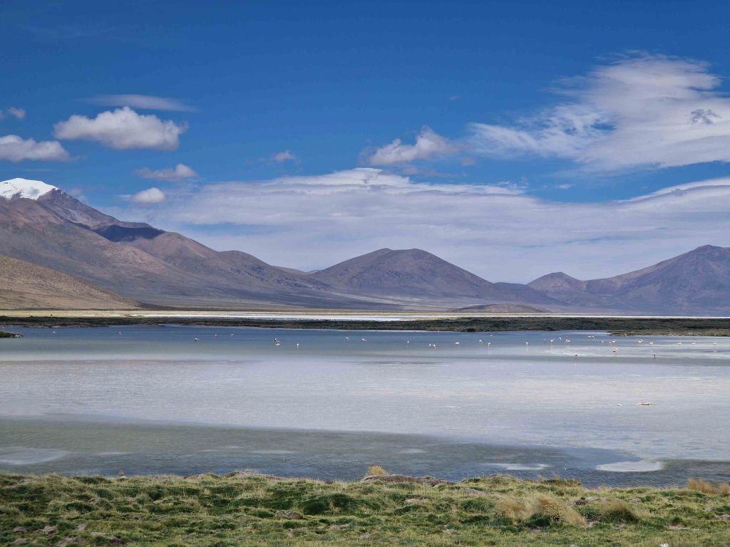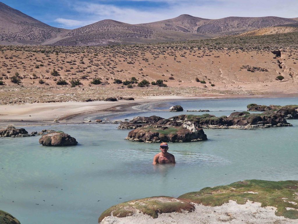 Unsurprisingly, we managed to hot foot it over the 3km unnoticed. My heart rate calming the moment we reached the saddle and were officially back in Chile (although again there was nothing to suggest we’d crossed a border!). On the other side, we whizzed down the rocky descent and headed straight to some thermal pools that we’d been looking forward to as a highlight of this route. The thermal pools were a perfect temperature, had incredible views of the snow capped mountains and the Salar de Surire surrounding them and we had them all to ourselves – except the couple of Vicunas on the shores. Despite the sulphur smell, it’s still quite possibly the best bath I’ve ever had – thanks Pachamama.
