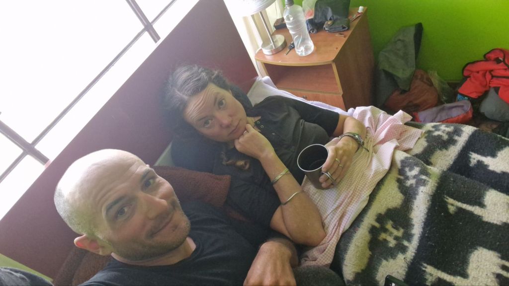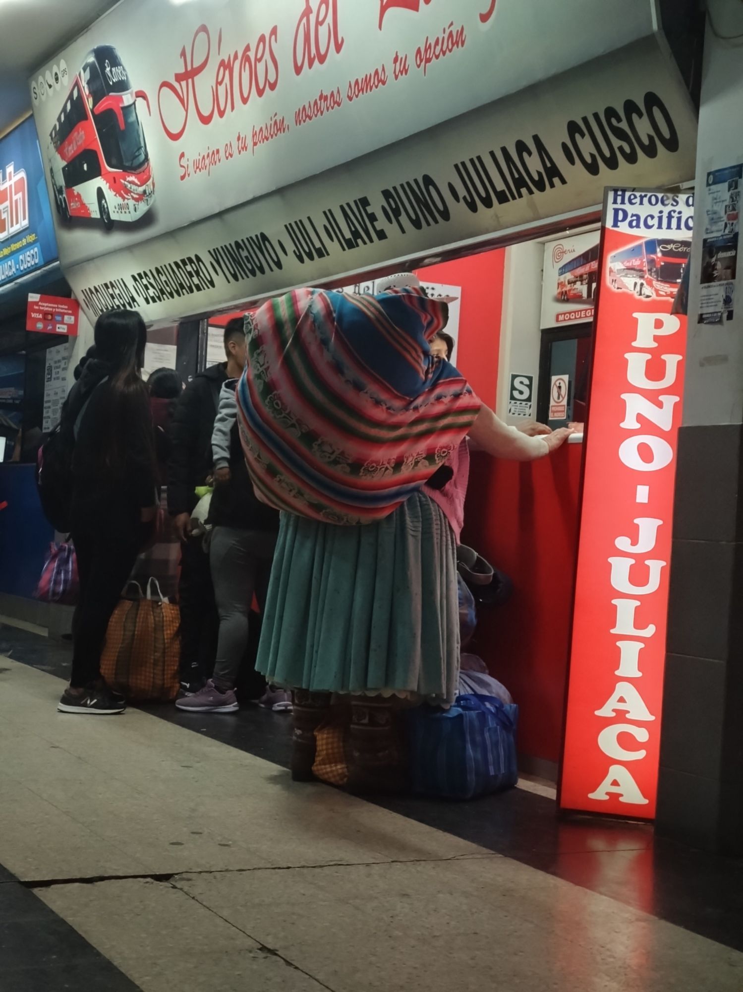 We were heading to Tacna, a larger town further North, from where Ted would receive his true birthday gift – A night bus to Juliaca. Ted’s never been on a night bus before so had dreams of large reclining bed-like seats, an eye mask and a fluffy blanket where you fall asleep in one place and awake refreshed and rested in your destination. Sadly the reality was somewhat different. After taking the bags and front wheels off the bikes in a busy, bustling bus station, where people where milling about carrying huge bundles of goods wrapped in patterned blankets and the shouts of the ticket sellers were loud and relentless, we were relieved to finally just get on board. We settled in for a good 8 hour stint of catching up on sleep. But the bus, which we had been told was ‘directo’ stopped a number of times – definitely not so directo after all – each time letting ladies on selling hot drinks and food, which involved them walking up and down the aisle shouting, regardless of the time. The bus was also freezing. We had seen many old ladies board the bus with three or four blankets each, and I just kept thinking it was a little excessive, but they were clearly the pros at this. By midnight, we were both numb, cuddling together for warmth under the only extra layer we had – my trusty yellow Shemagh scarf – trying not to fight over it too much. Ted managed to at least wrap one corner around one knee, the other knee he gave up as being lost to the freezing aircon. Ted also had a justified panic thinking he had lost his only pair of glasses (which he really can’t ride a bike without!) and convinced himself that the old lady in front had bundled them up in her many many blankets when she got off the bus in the middle of the night – only to then find said glasses under his seat (one year older, still not mastered loosing things yet!). So we emerged from the bus in Juliaca, bleary-eyed, a little dazed and feeling as though we were hungover from the lack of sleep – Just how you should feel the morning after a birthday, right!?!