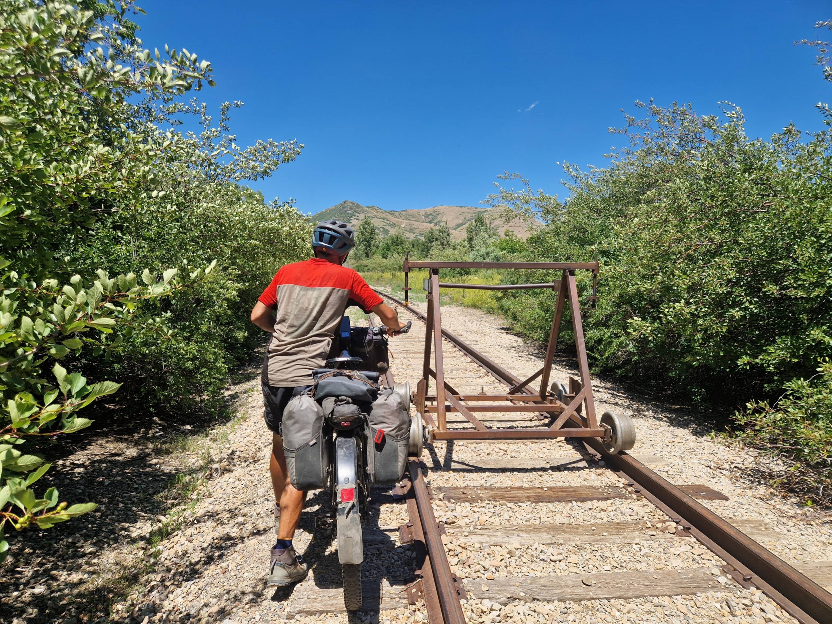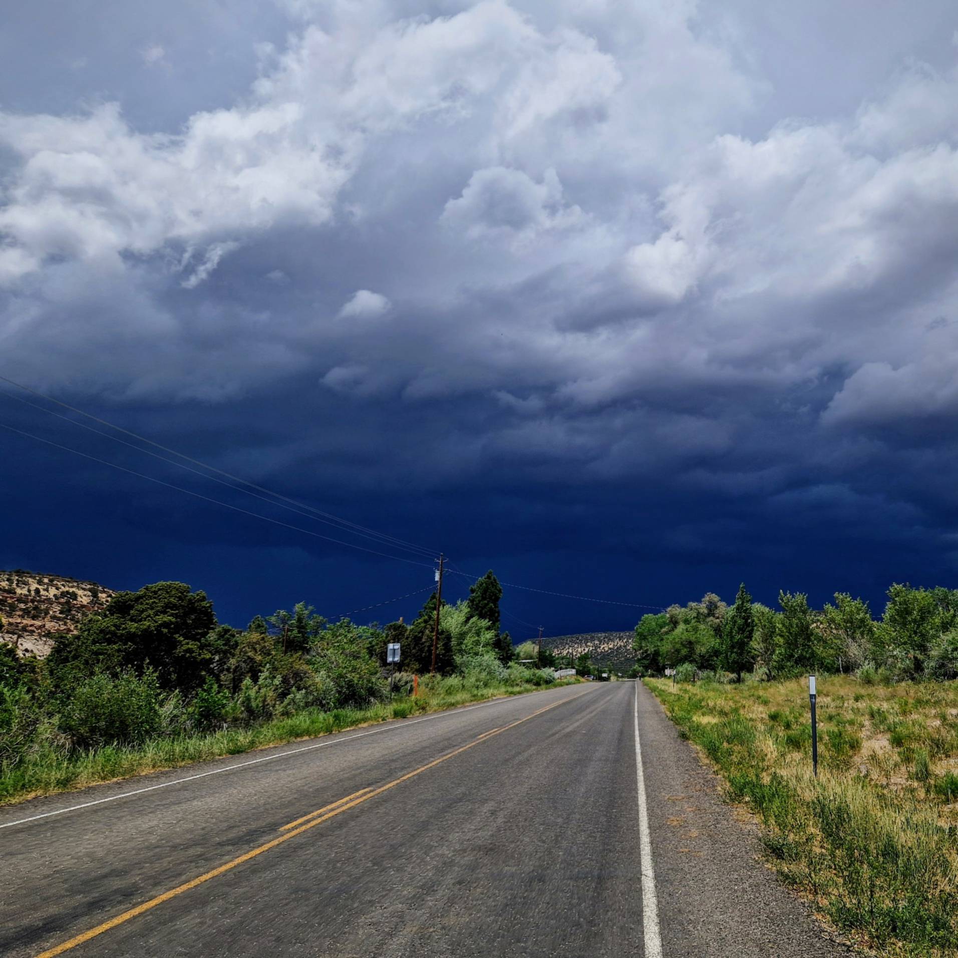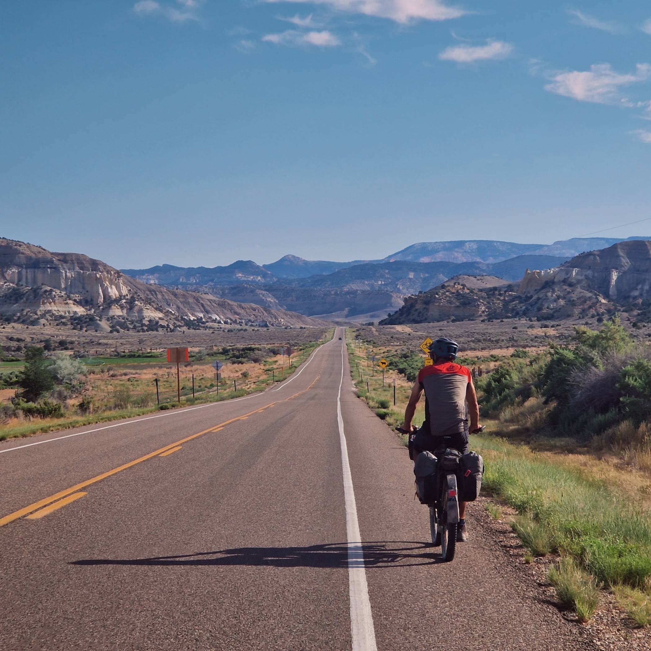 The drop in temperature was very welcome, but it indicated that the series of storms we had seen in the forecast were heading our way, so we had some decisions to make. The route itself headed off-road, up over a large climb and a high plateau of chunky, cut-up dirt road for over 100kms which we knew was impossible when wet, due to the peanut butter mud. The advice is always to stop riding and wait until the ground has dried out. But this felt so impractical given the series of storms predicted, and the lack of fresh water or resupply along the whole ridgeline. We had already experienced a small amount of the mud on a section of the route earlier that day with some peanut butter mud creating large sticky patches, which then stuck to our tyres and flicked all over our bikes and bags. Things got worse when the trail started switching between mud and dry, dusty, pebbled gravel, it created a mud and pebbled layer cake effect on our tyres and bikes. This then dried in the baking heat into a perfect clay, concrete consistency – not great! So we had some thinking to do about our route options and spent a night at the Butch Cassidy Campsite (great name!) in Salina to enjoy a shower, the luxury of laundry and some time to re-route before heading out the following day – well that was the plan anyway.