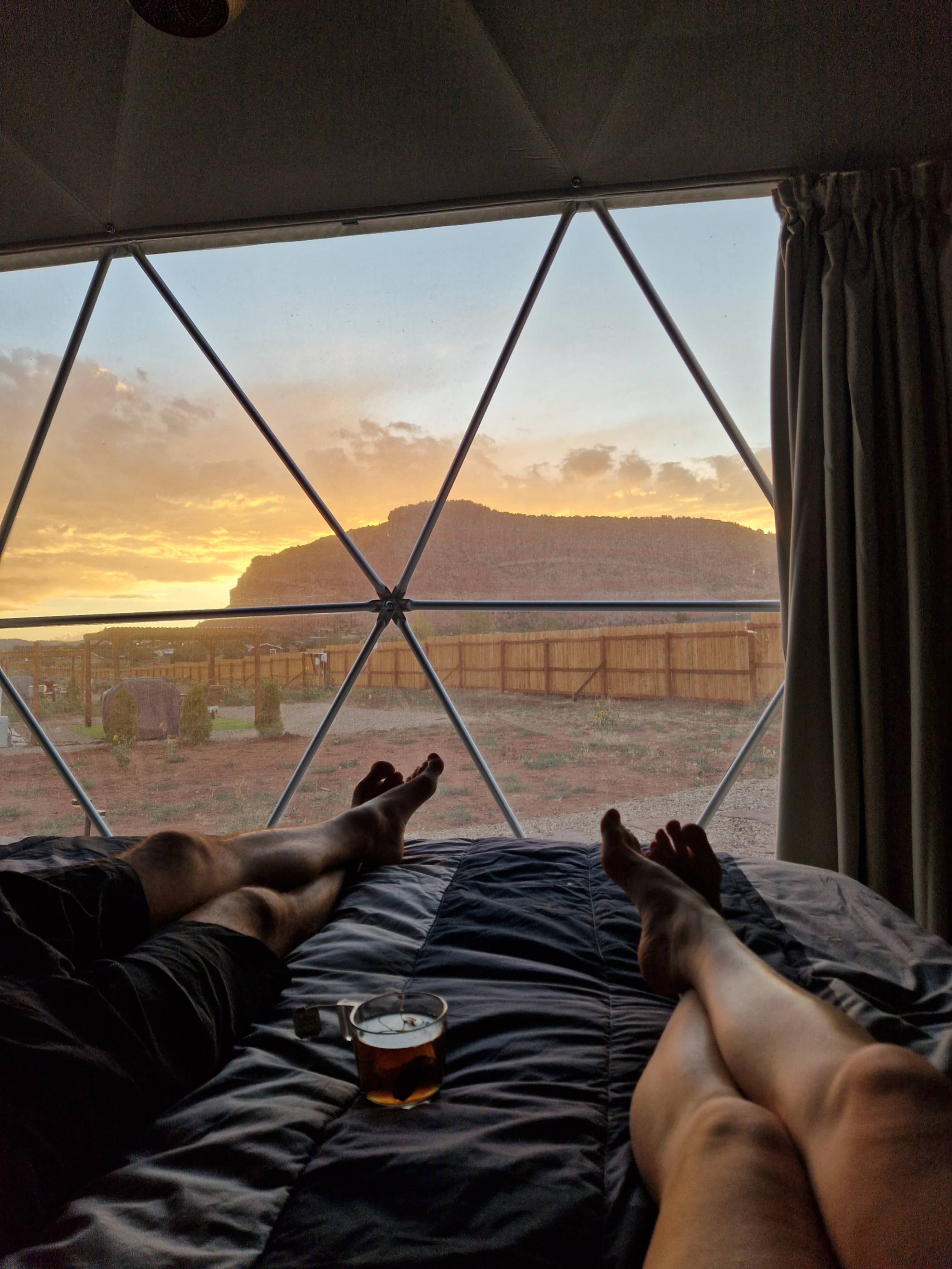 The following day was Sunday, and having eaten up all our food supplies, we hoped to decide on our route, then swing by the one grocery store in town to restock. But we’d forgotten that everything closes on Sunday here in Utah, with it being a largely a Mormon state. And by 3pm we still hadn’t finalised our route, so with little other option, we unpacked all our bags, that we had only loaded up a couple of hours earlier, set up the tent (again!) and decided to stay for a second night. At around 8pm, the amazing host at the campsite appeared with a small hamper full of food for us – A homemade stew and some freshly baked scones still warm from the oven – delicious. We couldn’t believe the kindness and generosity. We spent the rest of the evening filling out bellies and sharing travelling tales. Like many other Americans she had never left the USA, but had used the freedoms she had even without a passport to travel to all states of the USA by the age of 27, amazing.