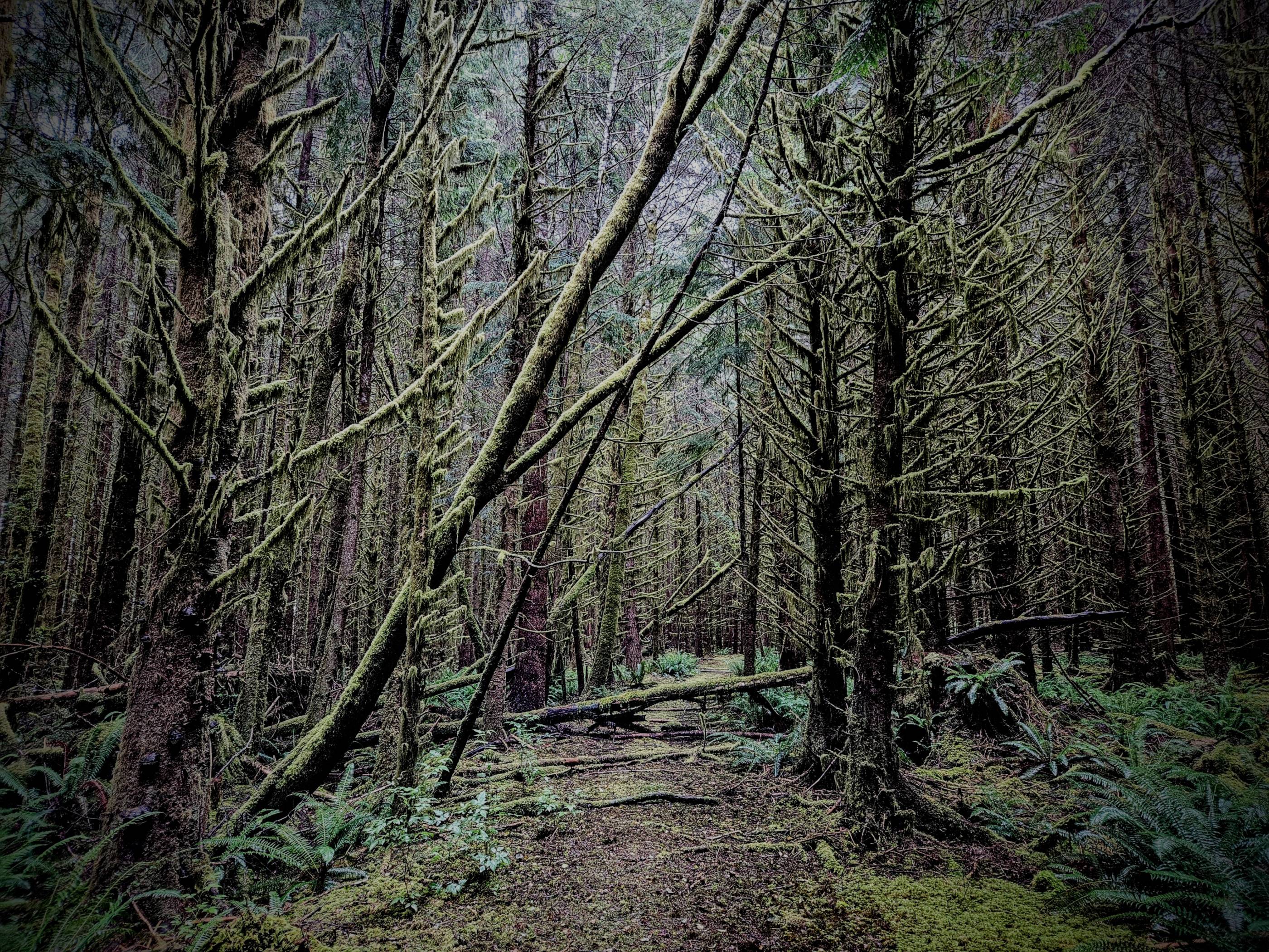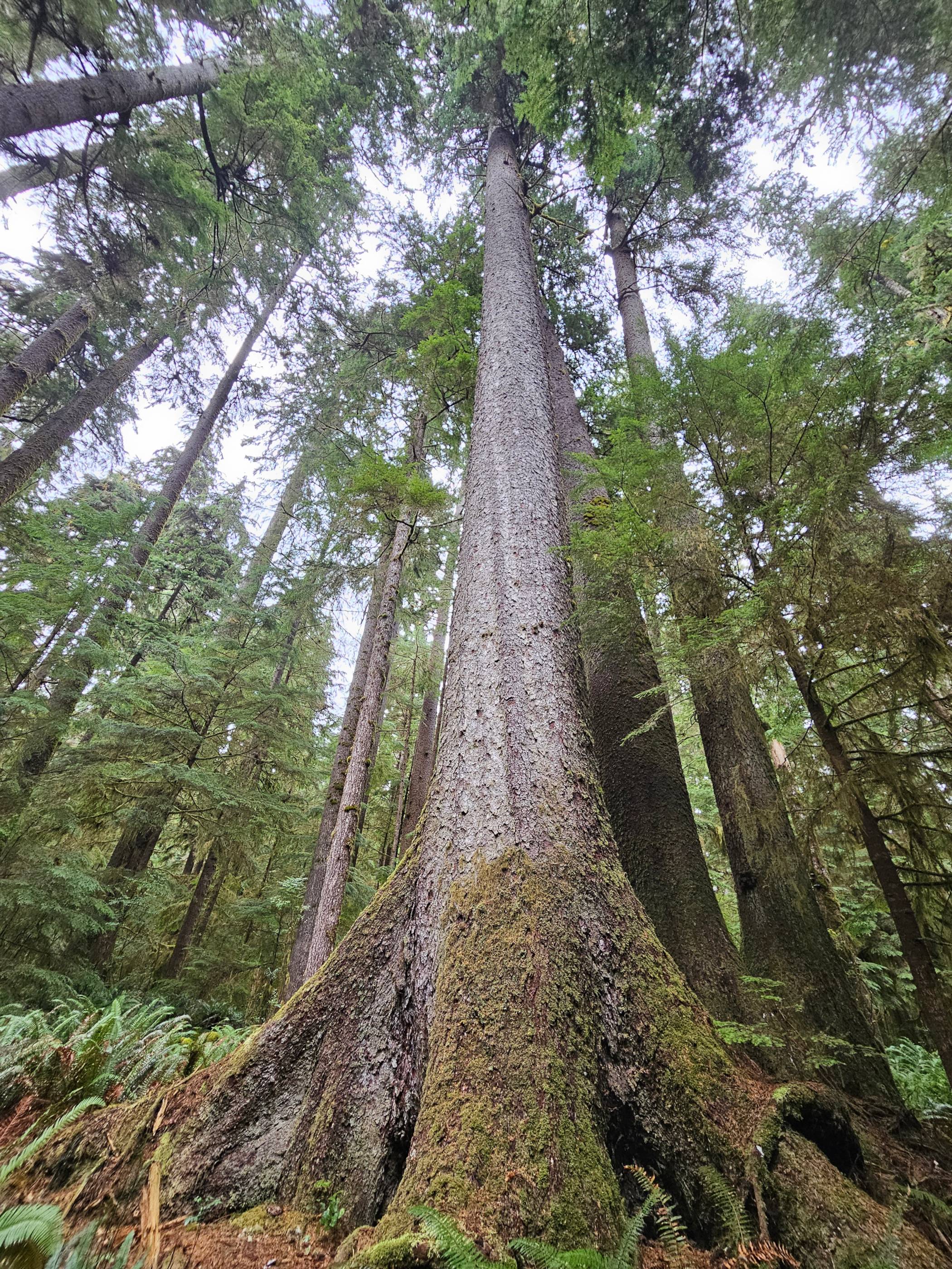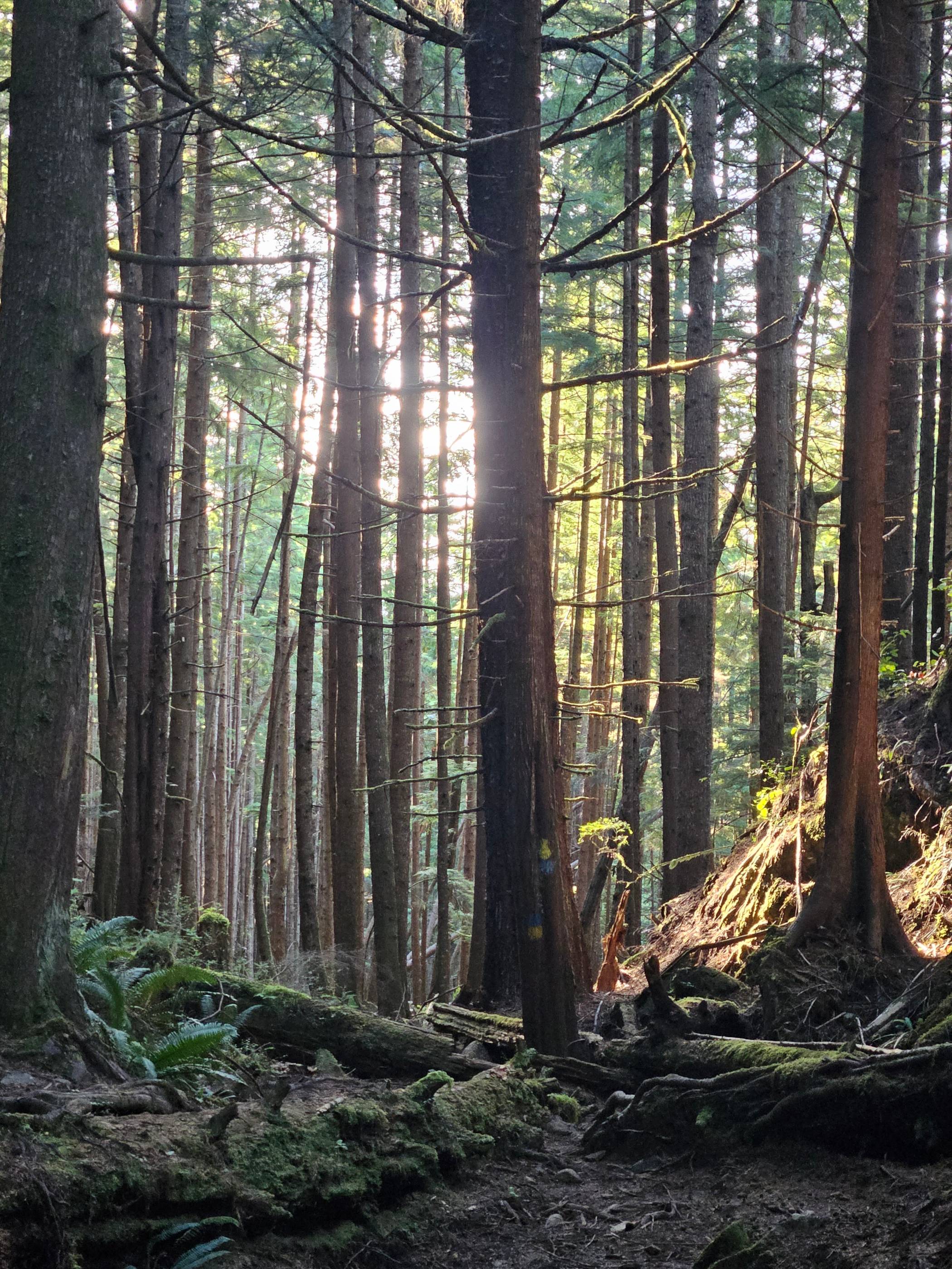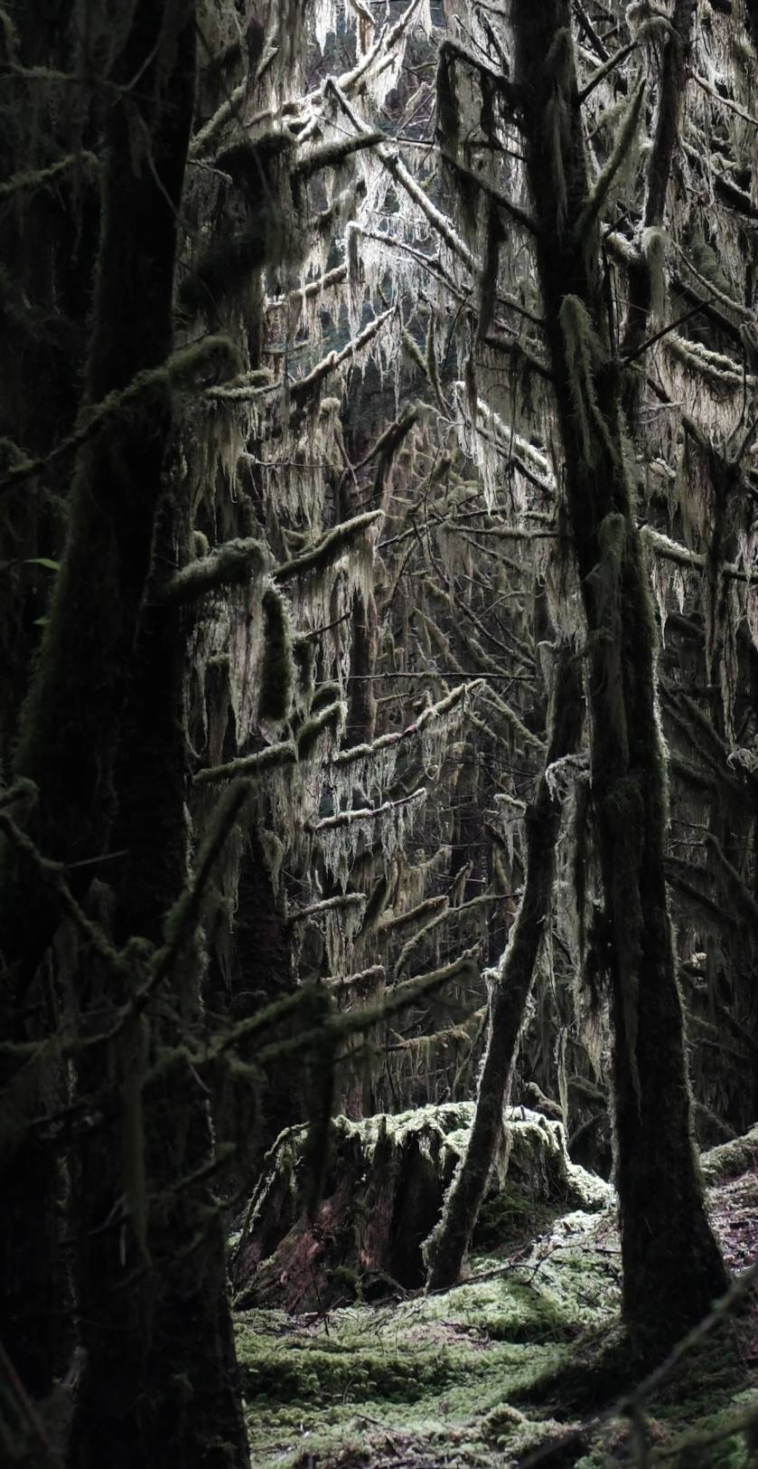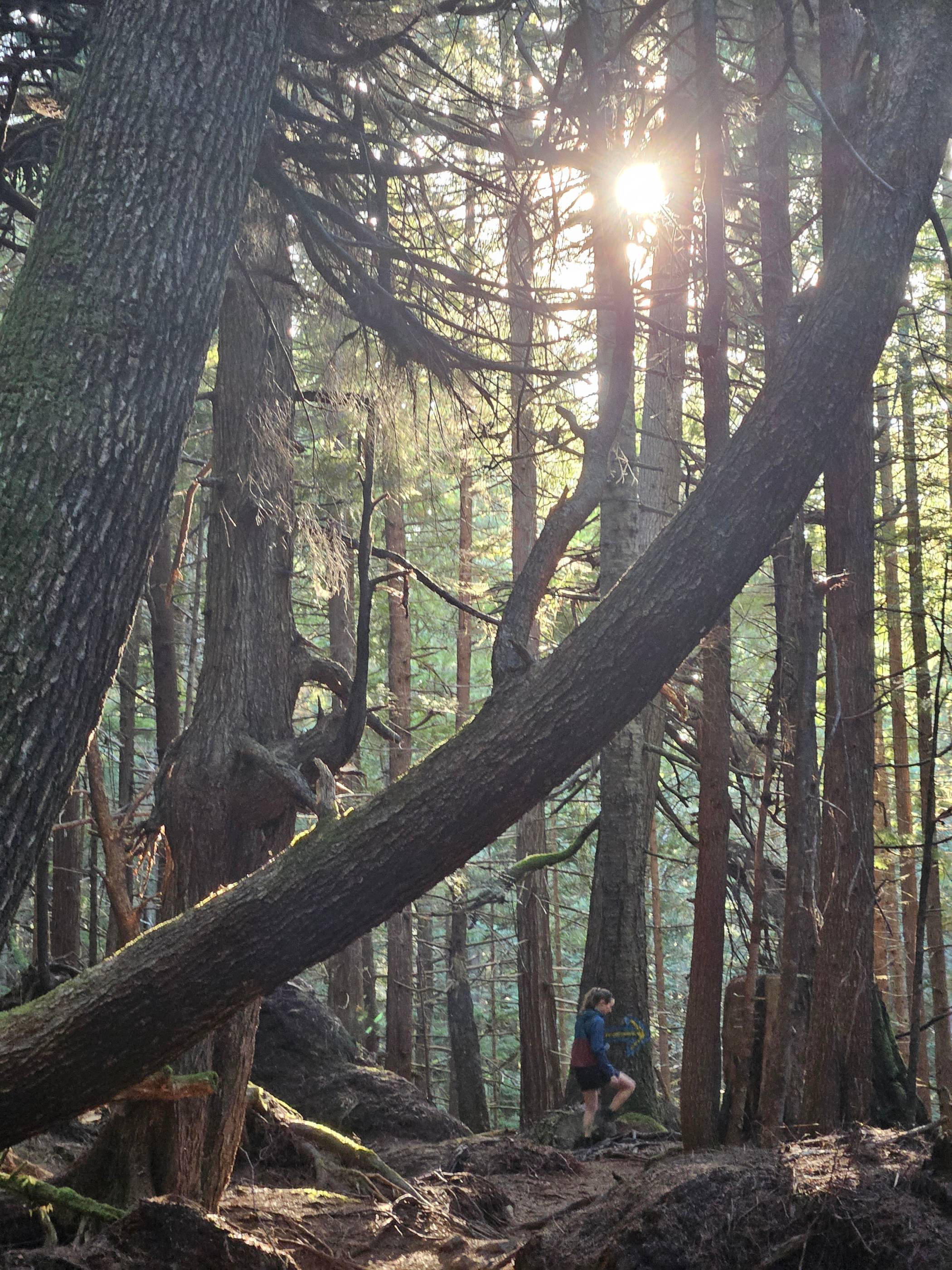 Our love of the sea soon became equal to our love, and time, spent among the trees of Vancouver Island. Every time we found ourselves in the deep, dark, dense undergrowth of the forests we were reminded of the multiple layers of life supported by just one patch of this temperate rainforest. The huge towering Redcedar, Douglas Fir and Spruce creating a tangled canopy above the sheltered, cooler climes enjoyed by those living underneath. The carpets of moss clinging to the broad trunks and hanging delicately from branches, made us feel enveloped in a cosy blanket of green. The beams of light breaking through the canopy above would shine light on one branch, one fern, one leaf at a time, like spotlights on a stage, focusing our attention on the smaller players of this green world. Tangled knots of roots and fallen, crumbling boughs formed the forest floor where secondary mini-forests of mosses and lichen grew, creating the feeling that we could forever keep zooming in to layer-upon-layer of forest, one layer being a slightly smaller version of the one before, like Russian Dolls of green worlds, one stacked inside another. We made a point of taking the time to appreciate these incredible worlds.