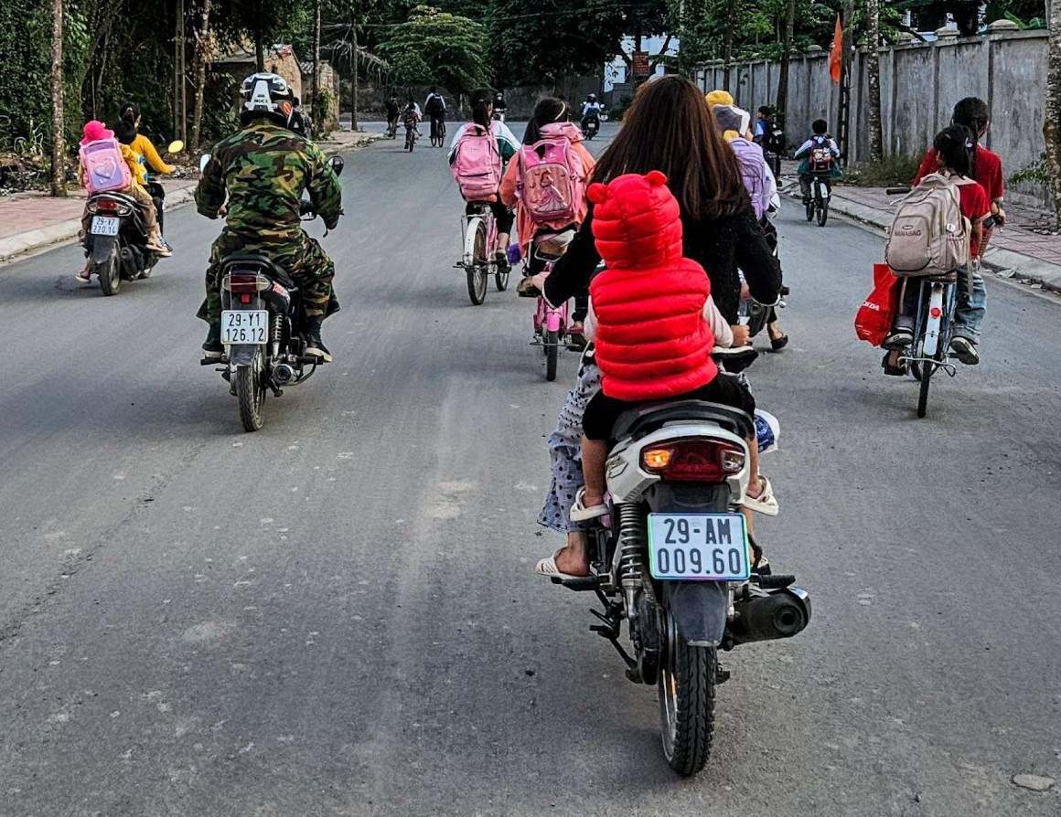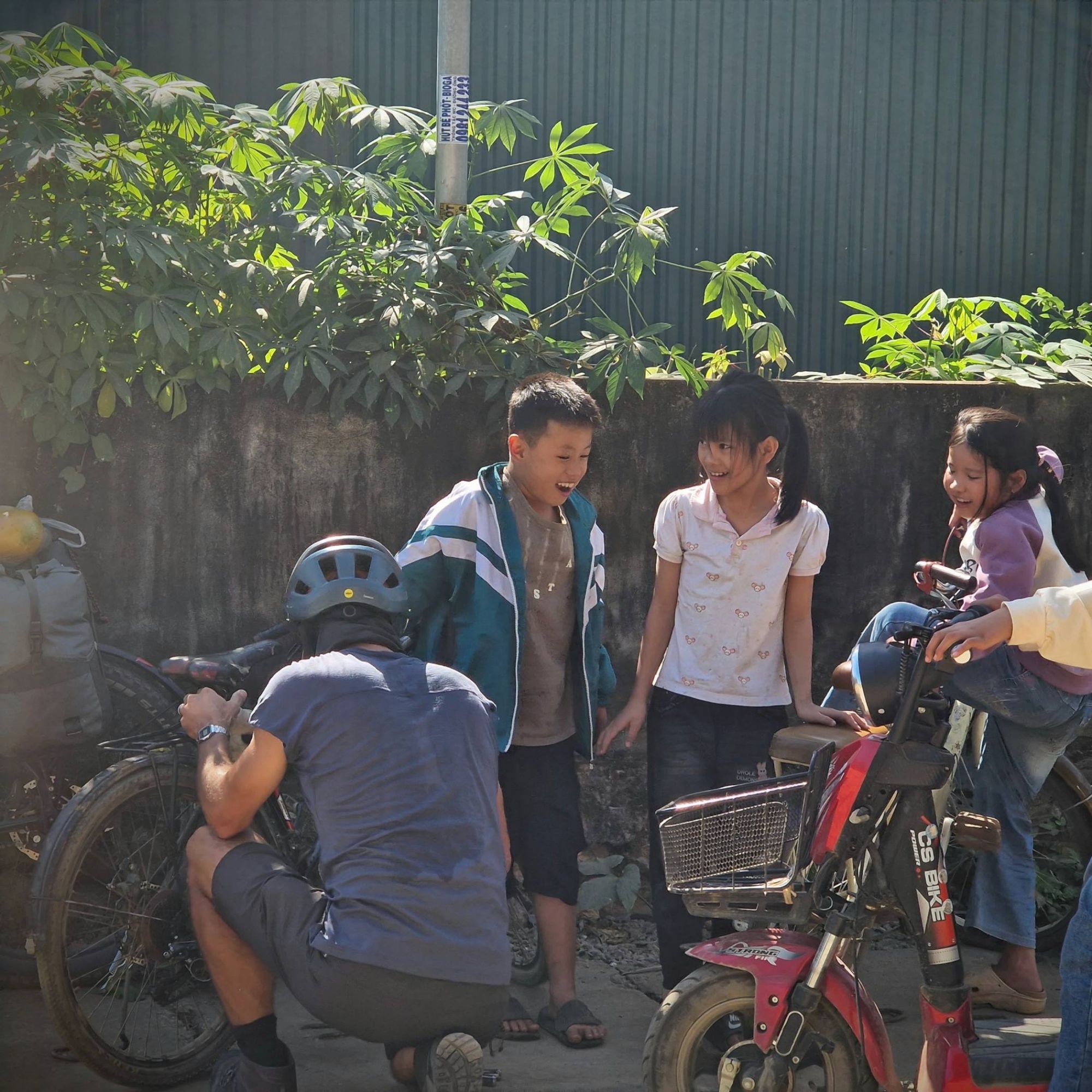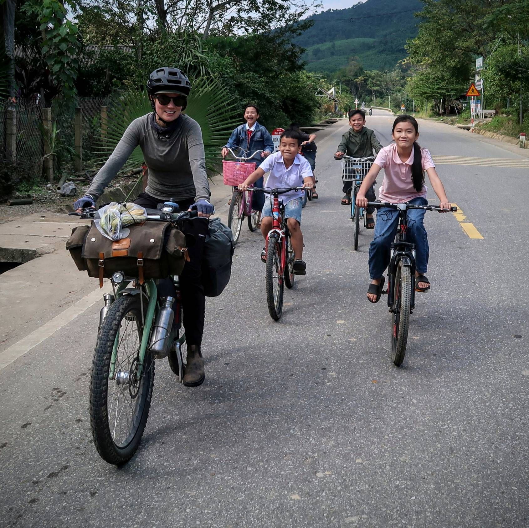 The whole experience meant that looking up and appreciating the beauty of the thick jungle blanketed hills, or the peachy golden tones of the setting sun became harder and harder to do. But the people of Vietnam somehow managed to pull us out of this with every interaction, like microdoses of joy that kept our heads above water everyday. Their smiles and waves were so cheerful. Such a contradiction to the environment within which they were living. Our favourite time of day quickly became the beginning or the end of the school day, when the children would all jump on their bikes to and from home. For a few minutes of each day we would be joined by a cheering, laughing gang with an accompanying soundtrack of ‘hello’ [giggle] ‘what is your name’ [giggle] ‘goodbye’ [giggle]. It seemed that this bright, cheery, disposition wasn’t even something that diminished with age, instead the adults faces also lit up with smiles, accompanied by big waves as we passed by.
