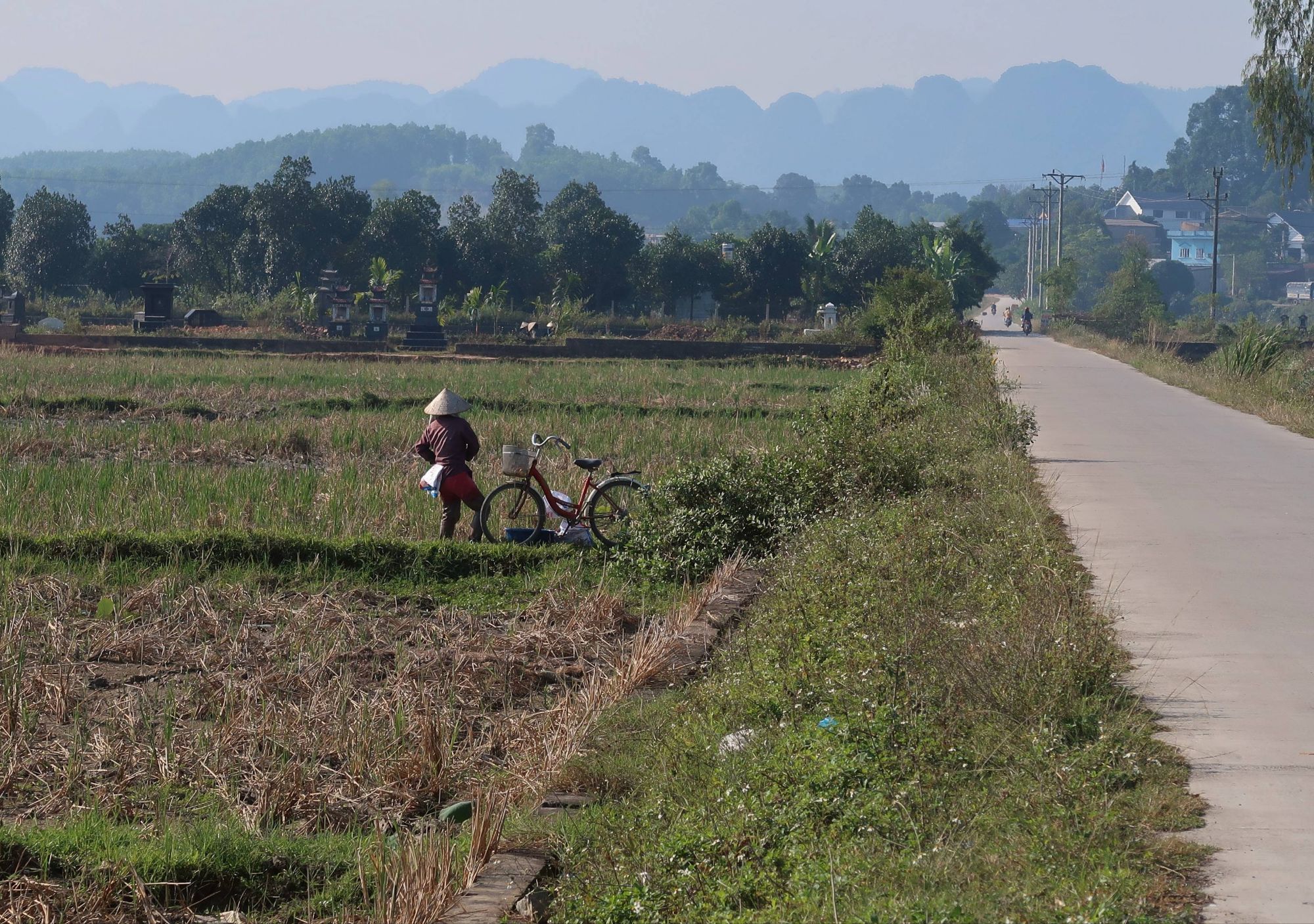 As is always the case with cities, the route out of the centre of Hanoi was a filthy, polluted, noisy, toxic, smelly, unpleasant experience. Each waterway, no matter the size, was black, thick with pollution, full of rubbish with a stench that turned our stomachs even through our buffs pulled up over our faces. The further we cycled out of the city, the more the landscape opened up into smaller towns and then villages between rice paddy fields. But whereas we would usually reach a distance far enough away from the city to leave the pollution behind us, this wasn’t the case with Vietnam. Day-after-day, despite taking the smaller roads, despite trying to find the most traffic-free options, the noise and pollution remained. Every roadside was covered in rubbish, mainly discarded plastic bottles, beer or soda cans thrown from car windows or plastic bags blown in from who knows where. Every inch of roadside. Everywhere. And when the rubbish piled up high, the locals would burn it. Huge plumes of blue/black smoke to add to the already thick air polluted by old engines driving by. The smell was so toxic and acrid it burnt out throats as we cycled through it. We would try and hold our breath for as long as possible, but it was, dare I say it, better than the gag-inducing smell of the rotting rubbish itself.