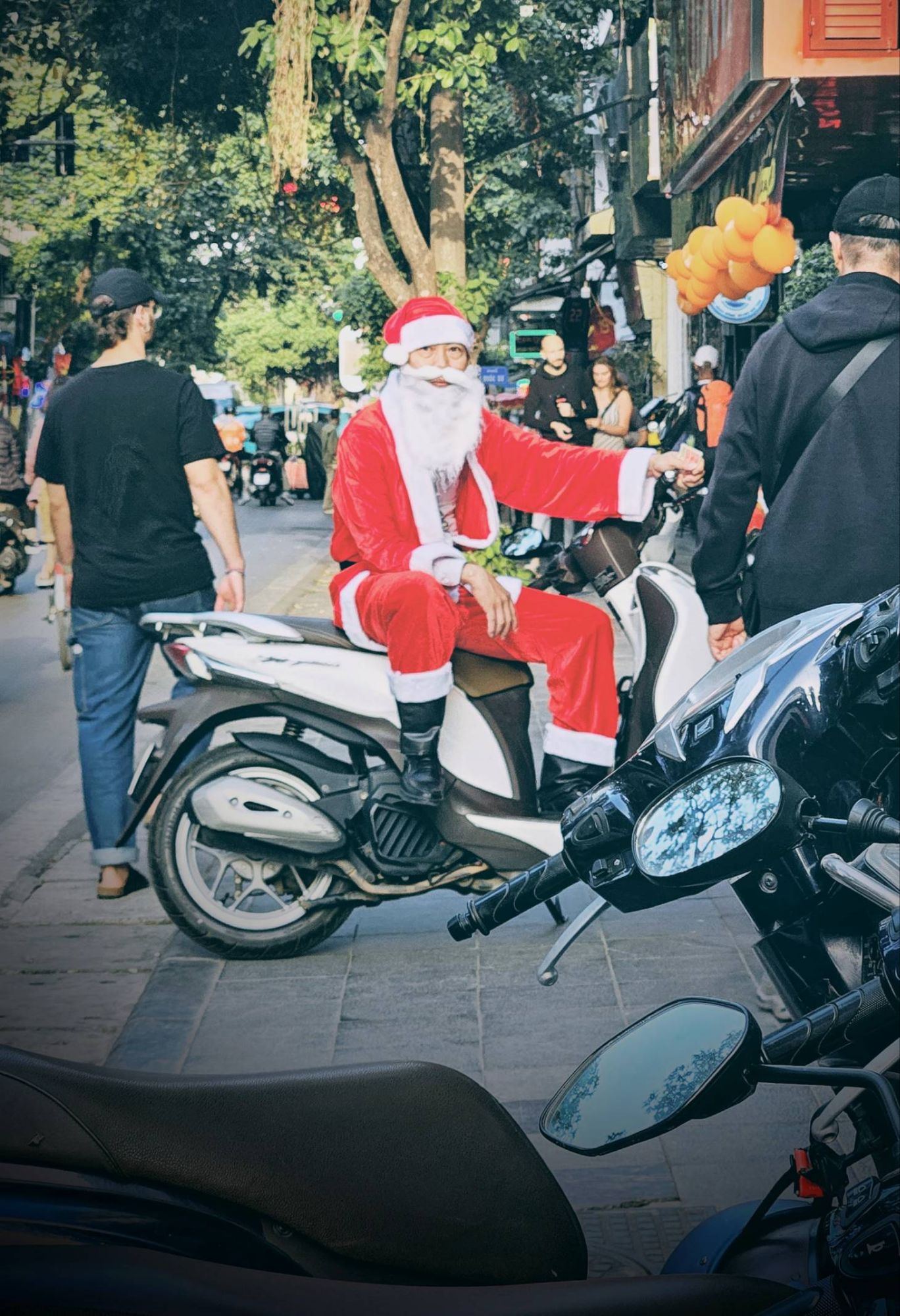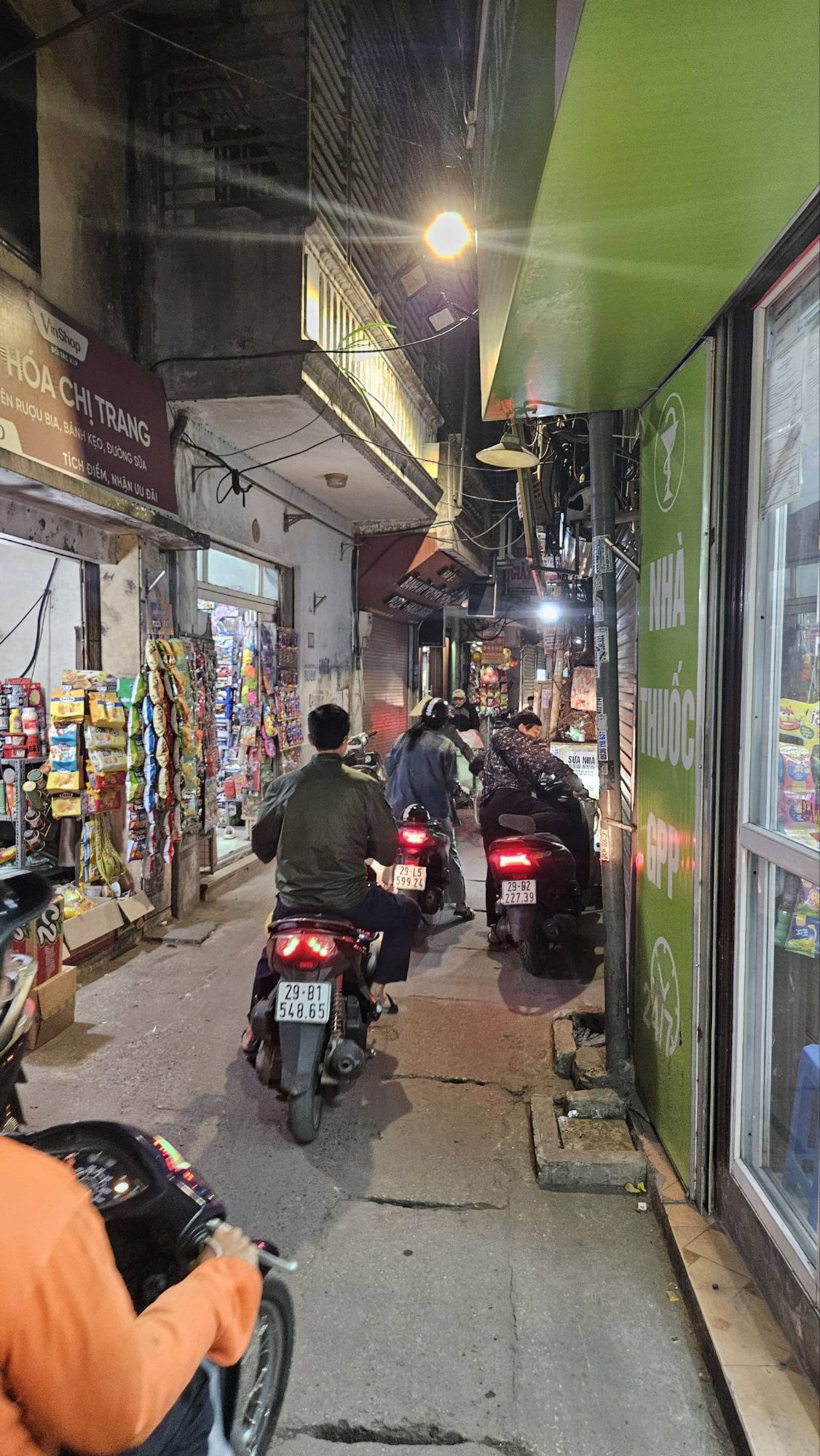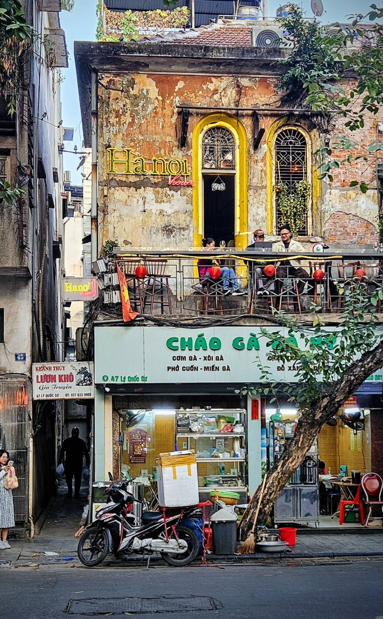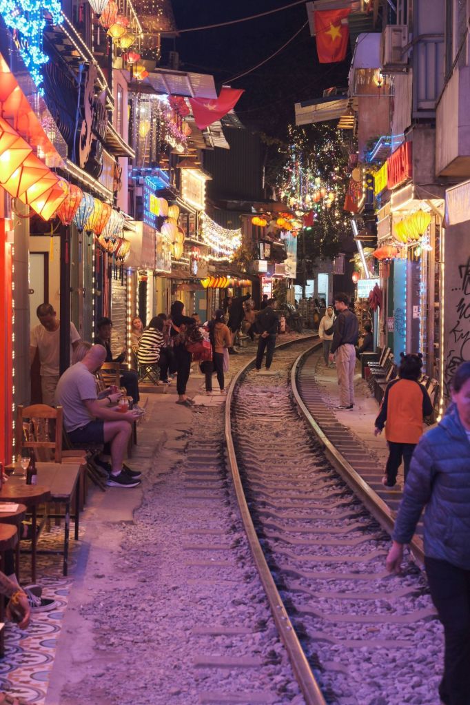 But after leaving the calamity of the morning, and the grotty hostel, behind us and checking-in to somewhere much nicer (but surprisingly no more expensive!), we settled into our time in Hanoi and enjoyed the hustle and bustle (but not the filth!). We found cycling about to be much safer than walking. On the bikes we just blended in with the hoards of mopeds, not moving too quickly, cars giving way to us the way they did to the other two-wheelers. But trying to walk was more tricky. There is no footpath in Hanoi that isn’t dug up, piled high with rubbish, used as storage areas for building materials or covered in parked mopeds. It means that pedestrians spend a lot of their time walking at the edge of the road, in the drainage gutters, which are filthy. So we mainly used the bikes to hop about between the old ramshackled colonial streets and made the most of the many vegetarian restaurants. As always in these places, we enjoyed watching the tourists as much as experiencing the place itself. Wandering the narrow streets of the trainline, with all the twinkling lights, lanterns and night life was like being in another world.