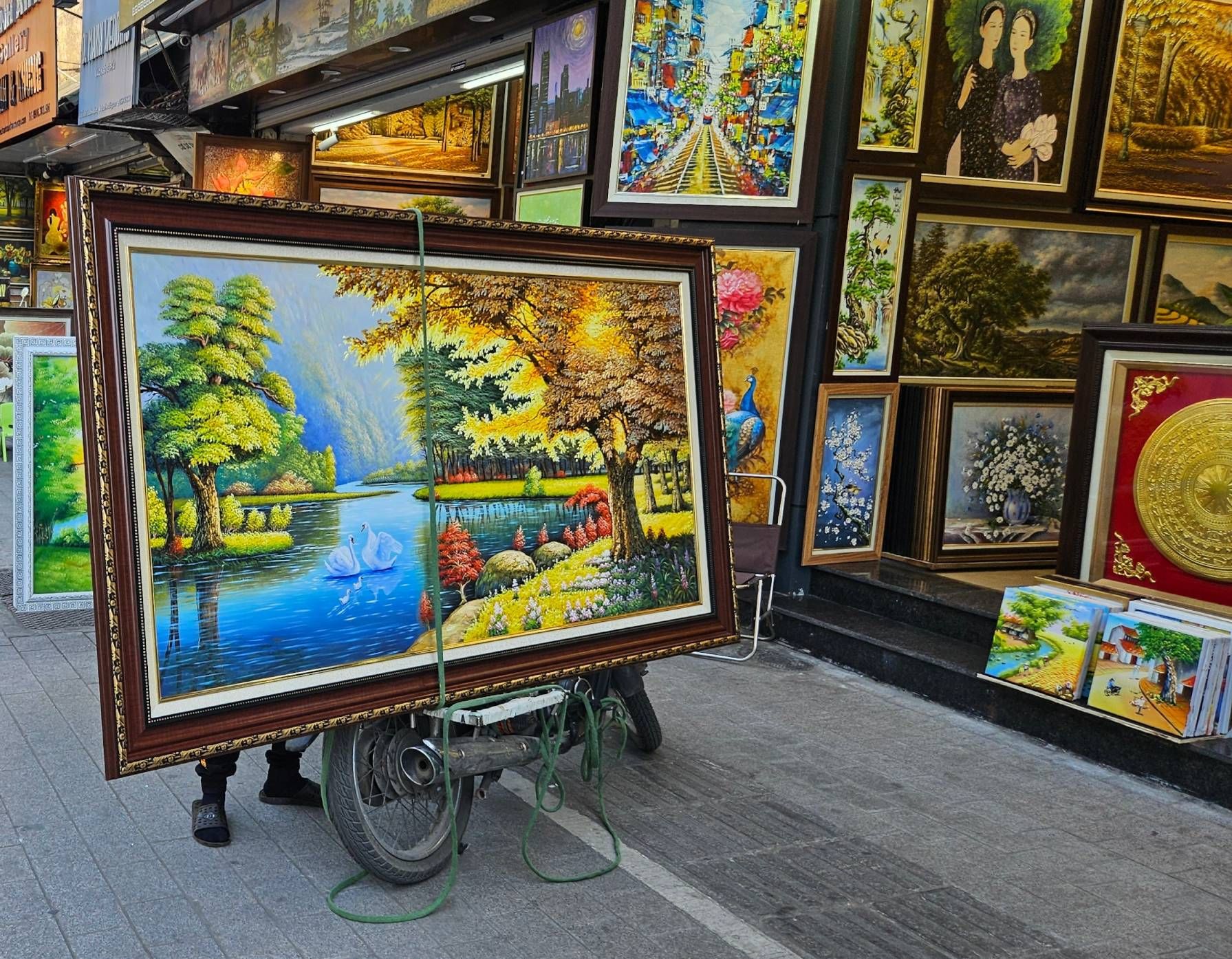 Soon enough, the road widens back into two lanes, the walls disappear and the views open up to reveal flat rice paddy fields, lined with palm trees and complete with water buffalo underneath the hazy grey skies. The roads gradually become busier, moped after moped joining the flow of traffic. They are carrying anything and everything. Where the item is too big to be precariously balanced on top of the moped, it is simply attached to it and then dragged along the floor – steel beams, bamboo and wiring all just toed along behind. And no limit to the carrying capacity, a whole family of five, or was that six, all squished comfortably on board.