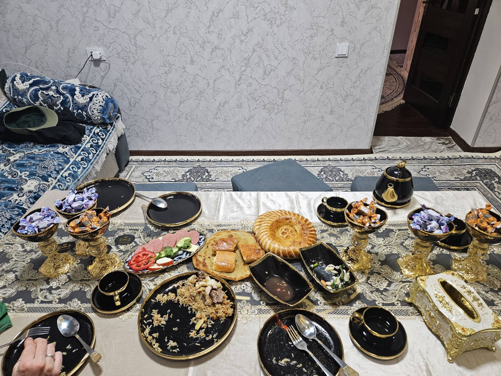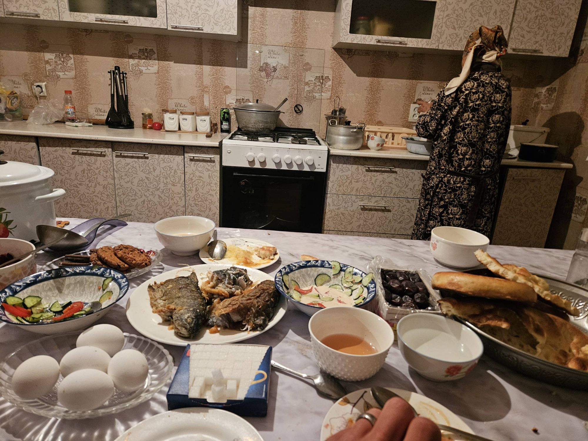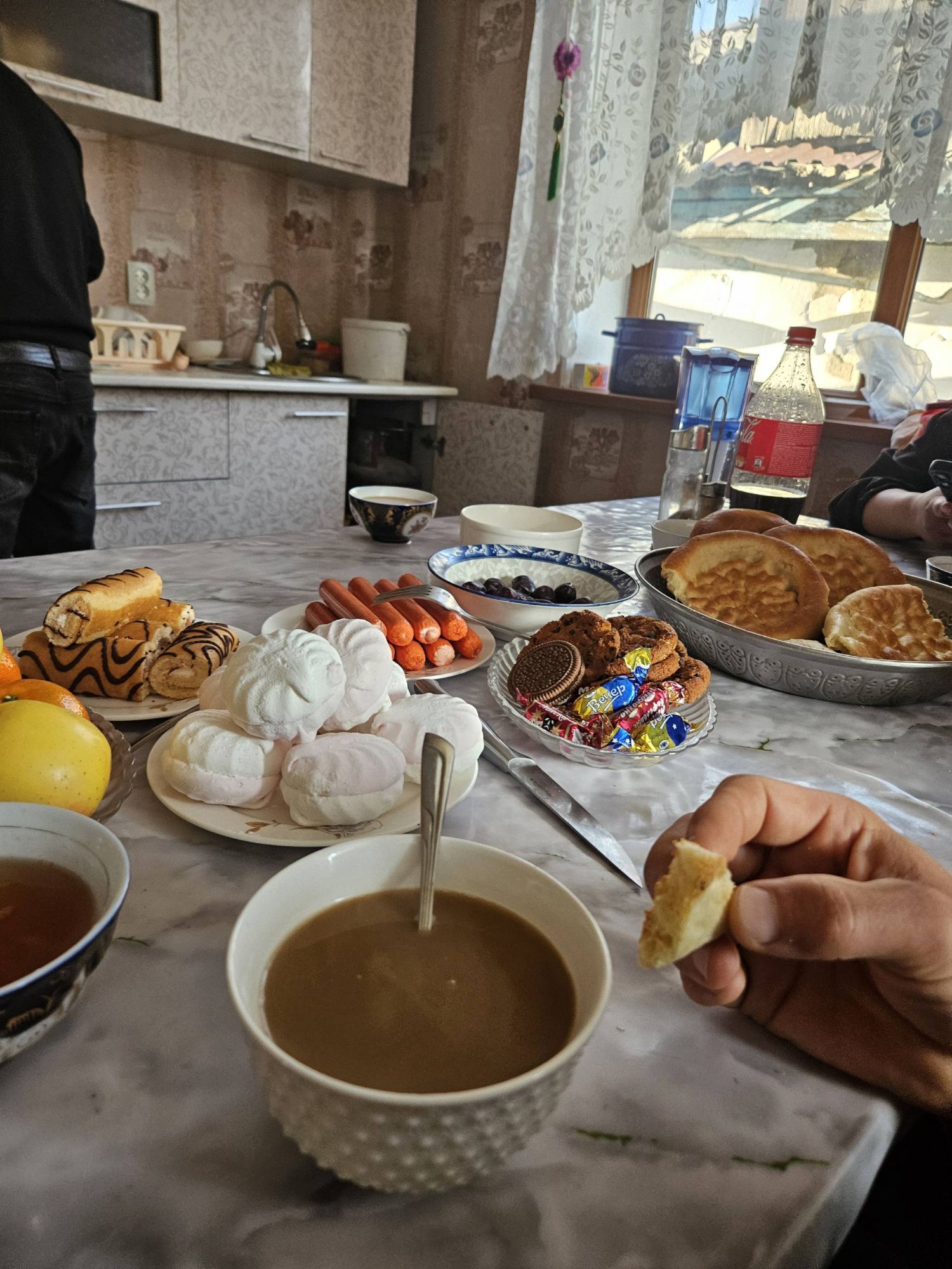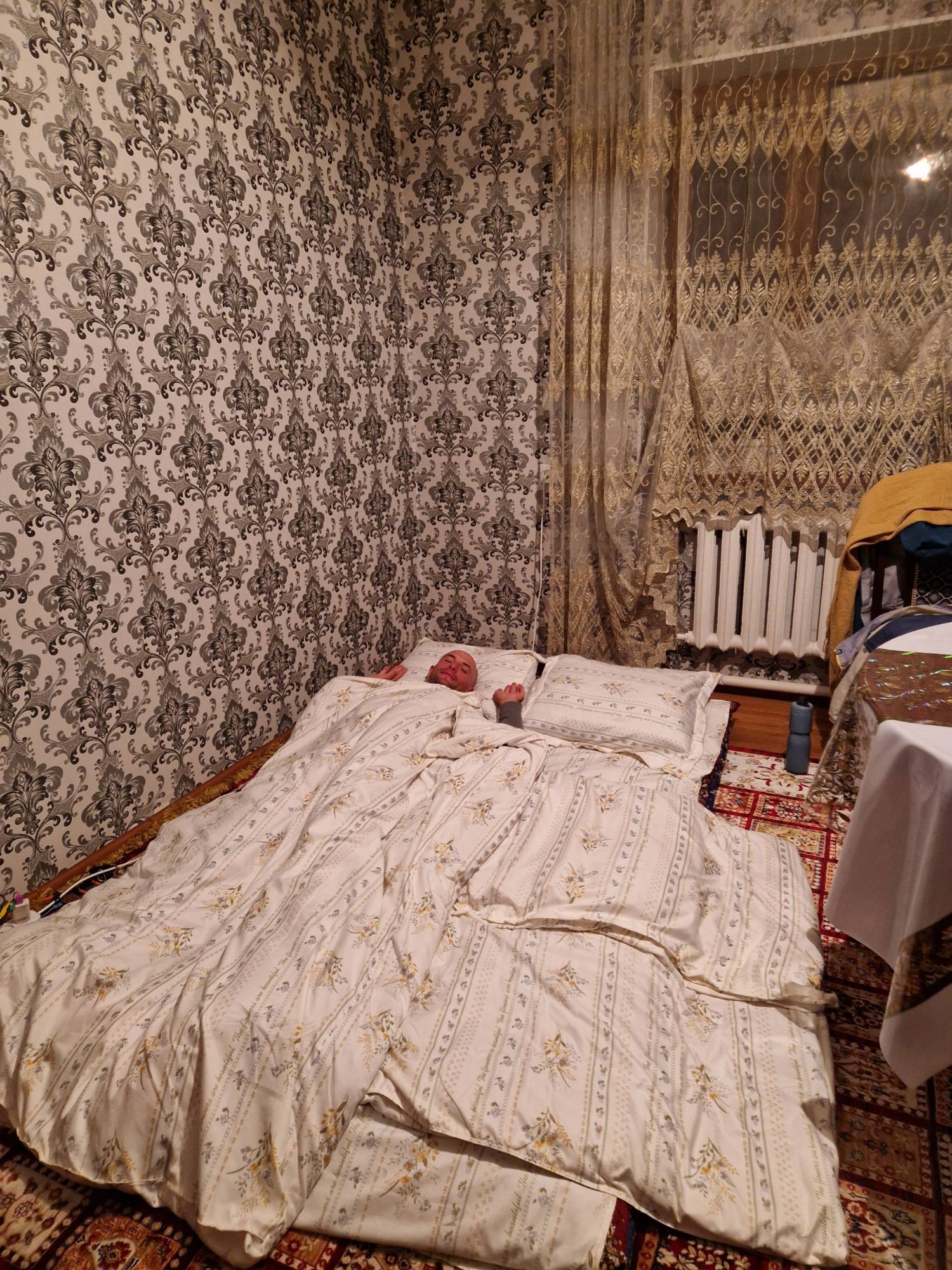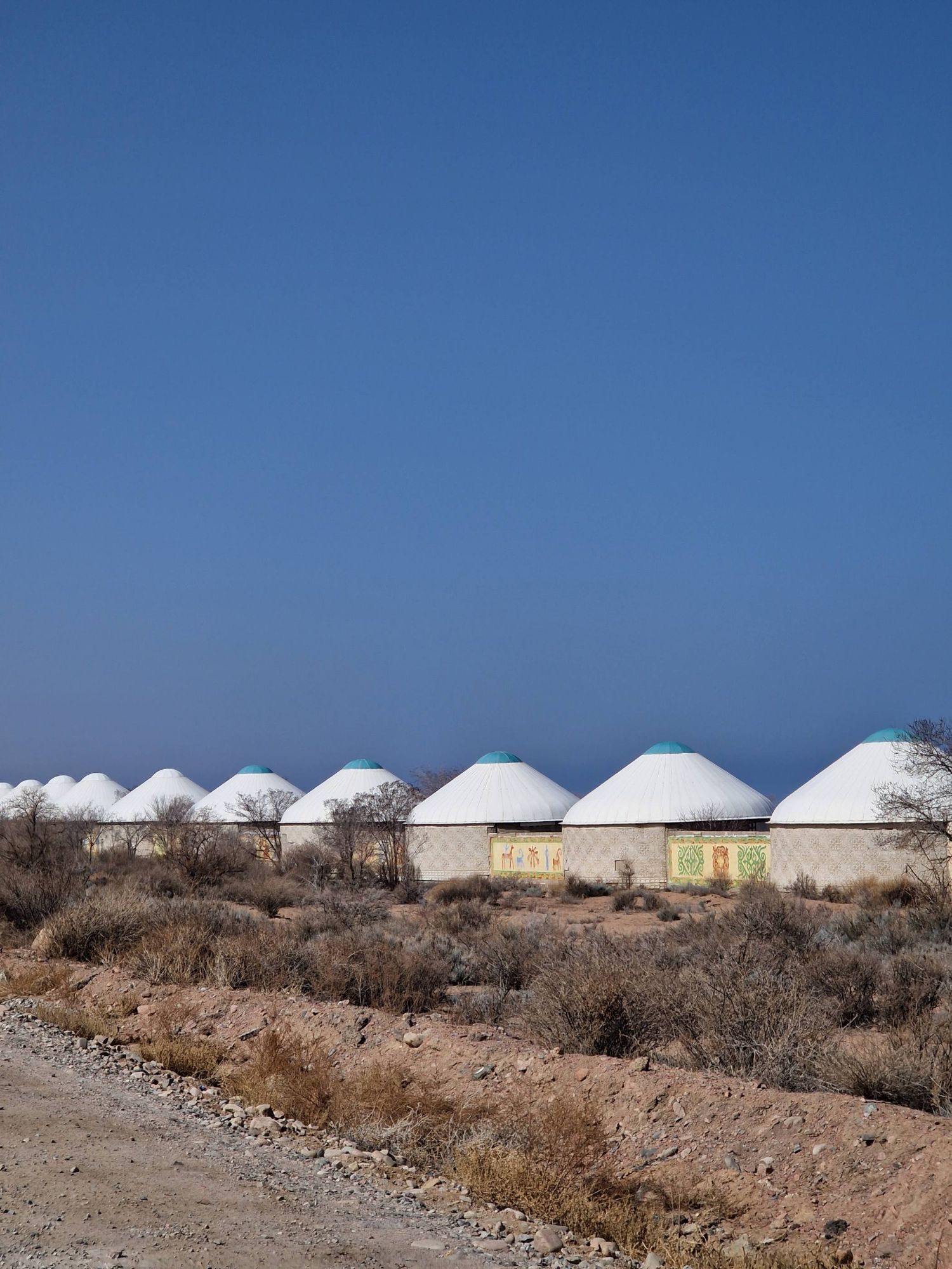 But each day, as the golden light of dusk approached, the Kazakhstan steppe became a different place. Where the winter cold was bearable and manageable during the daylight, it was a different story at night. The temperature fell with the setting sun. The time of day felt as though it was measurable by the drop in degrees. As 4pm rolled around it felt as though our leisurely days became a race off-route to find a small village and ask around for a guest house, a home stay or a floor to sleep on before the sun set. The cough I had developed in Almaty still wasn’t shifting, in fact it was getting worse. Breathing in the cold air all day everyday was aggravating it, so having somewhere inside over night to rest my lungs became pretty important. Thankfully, the friendly helpfulness of locals meant we ended up staying in an Apple Orchard office, a shop owners dining room and a homestay with a fierce-looking farmers wife. It meant we could avoid the worst of the cold, and also allowed us to experience some of the Kazakhstan culture we otherwise would have missed out on. The never-ending refill of the teapot seemed to be of key cultural importance and I for one am pleased this is something we experienced. I mean, I didn’t enjoy having to pick the googley meat out of the mounds of pasta (‘I don’t eat any animals’ here is only understood to mean – I only eat a little bit of meat) and I could easily pass up the traditional sweets, jams and chocolates offered for breakfast, I can remind myself that I really don’t need another serving of the warm, delicious, fresh flatbread but resisting yet another cup of tea is absolutely, totally, wholeheartedly beyond me!