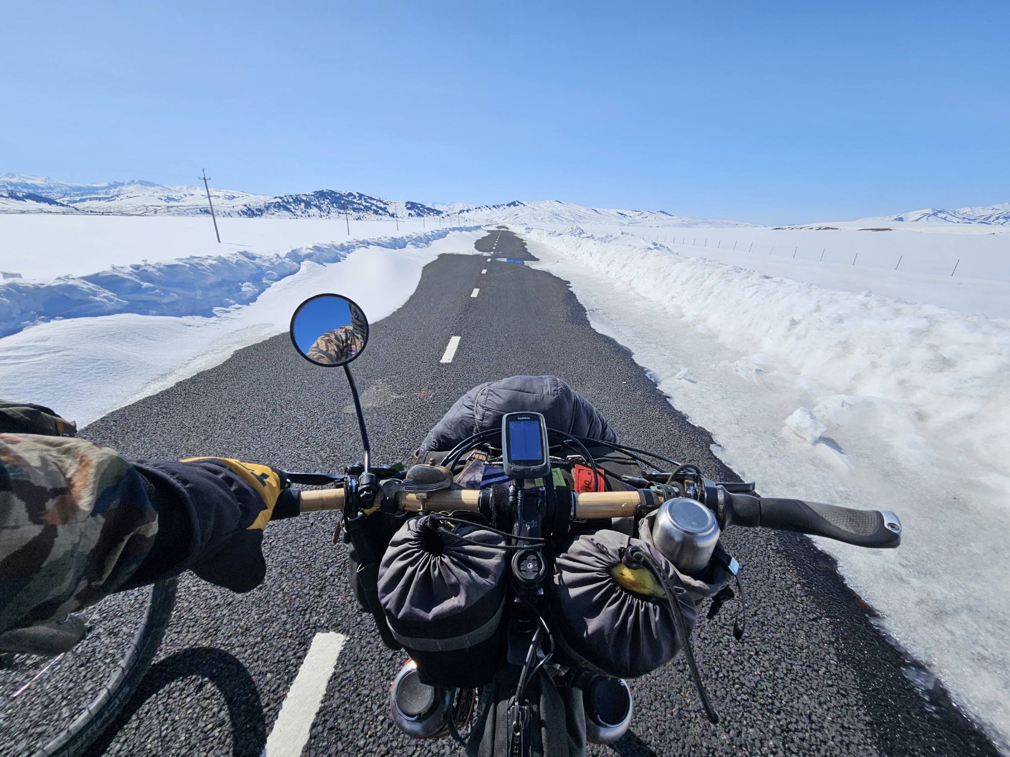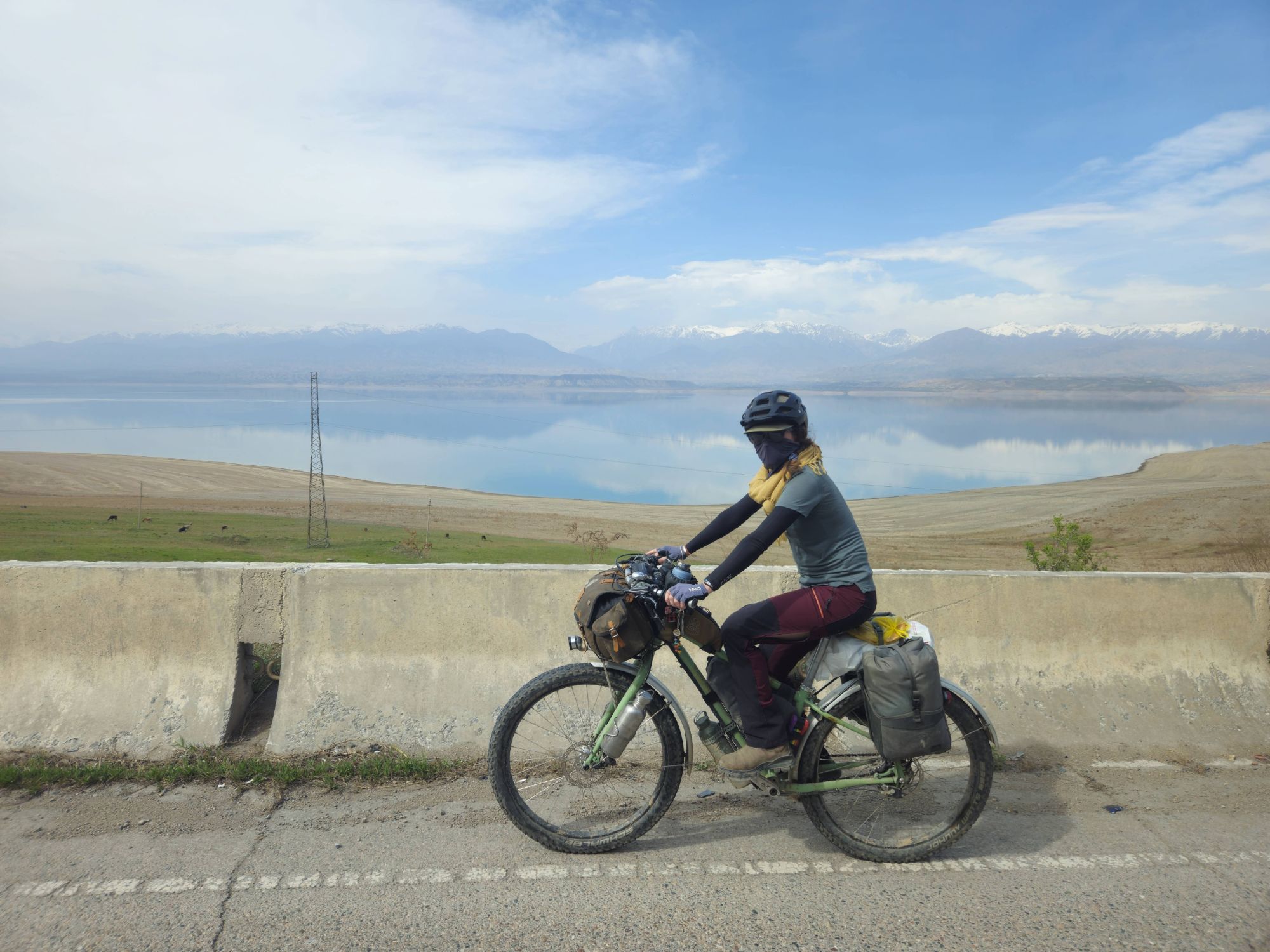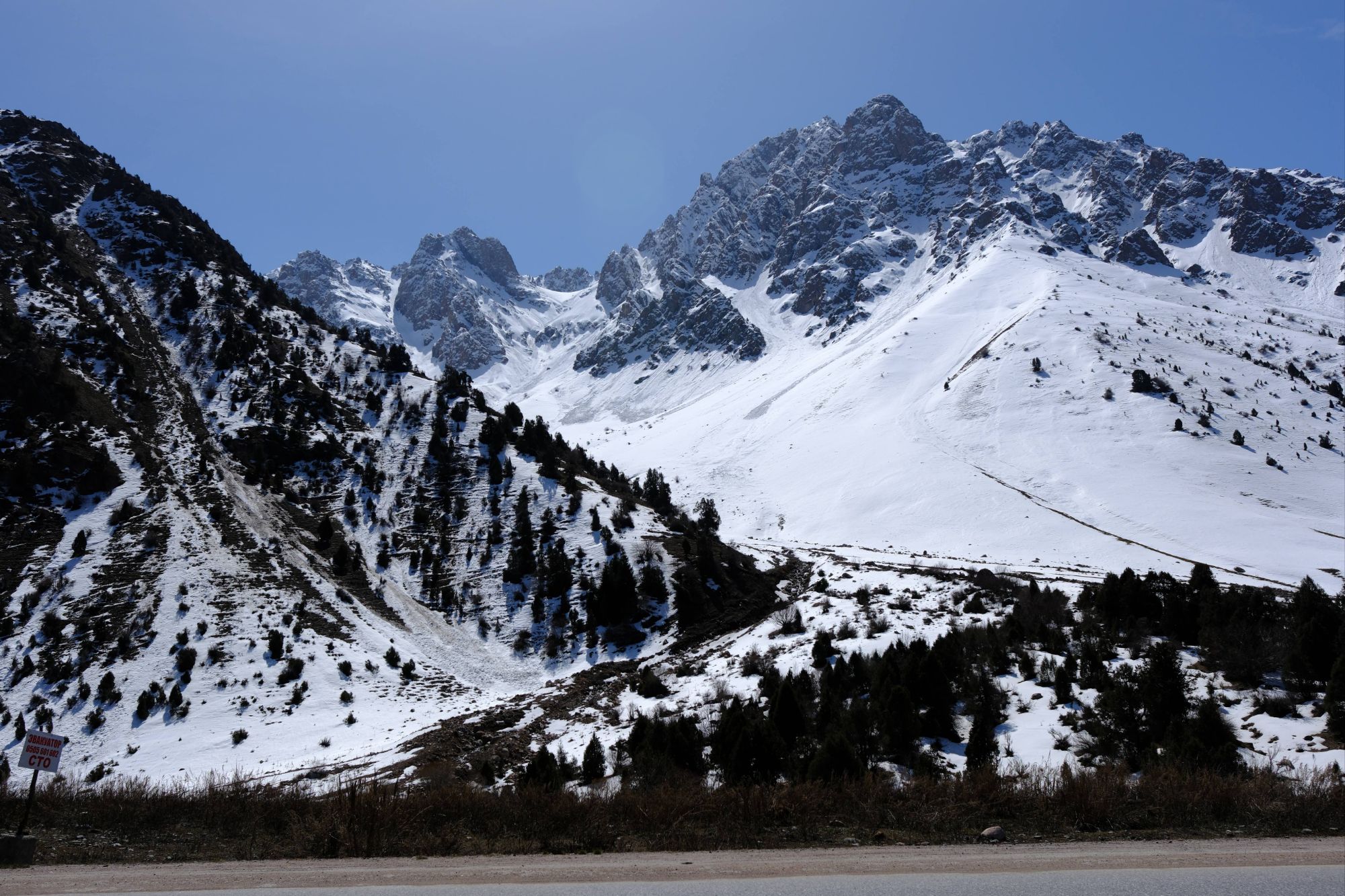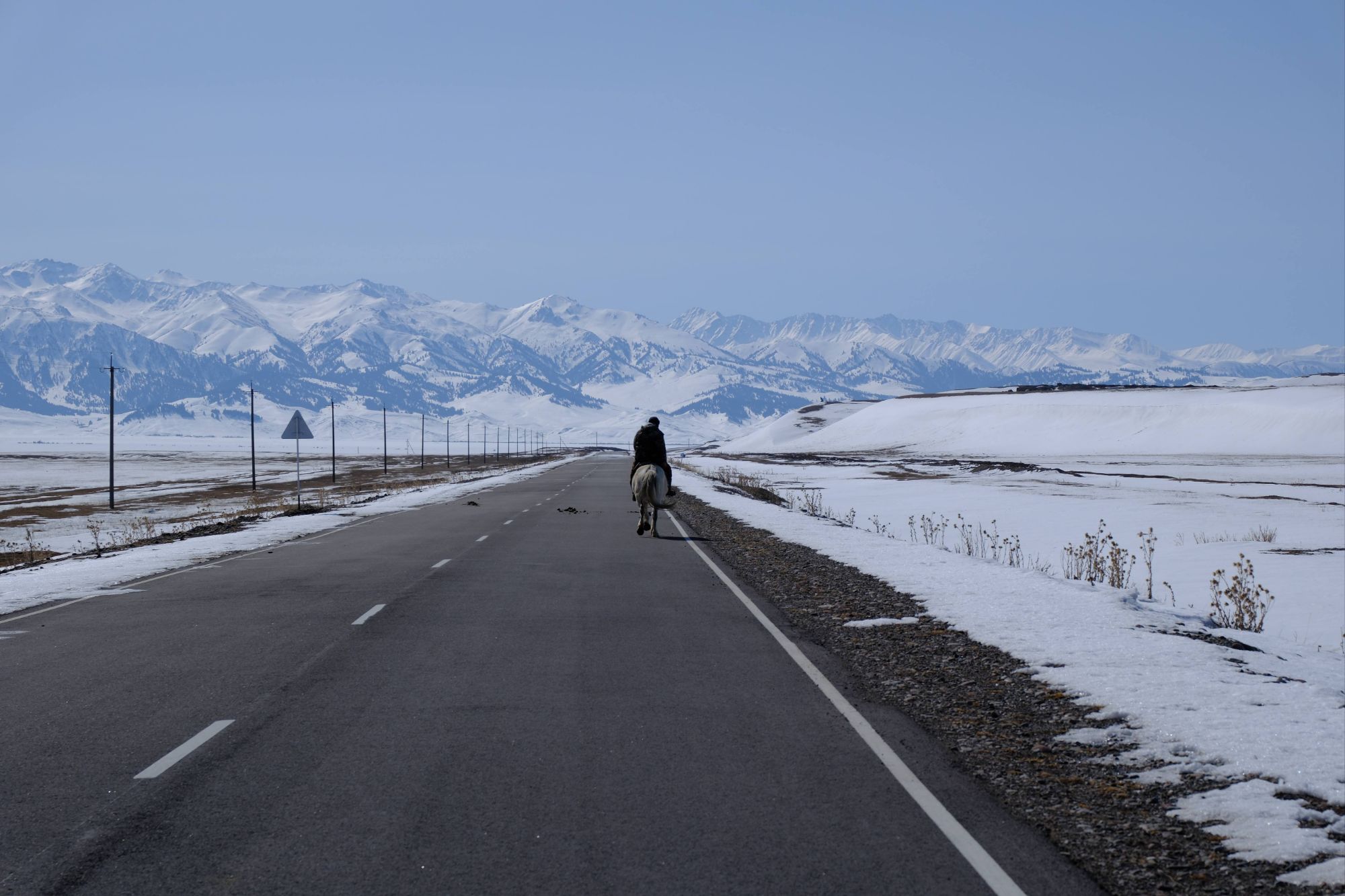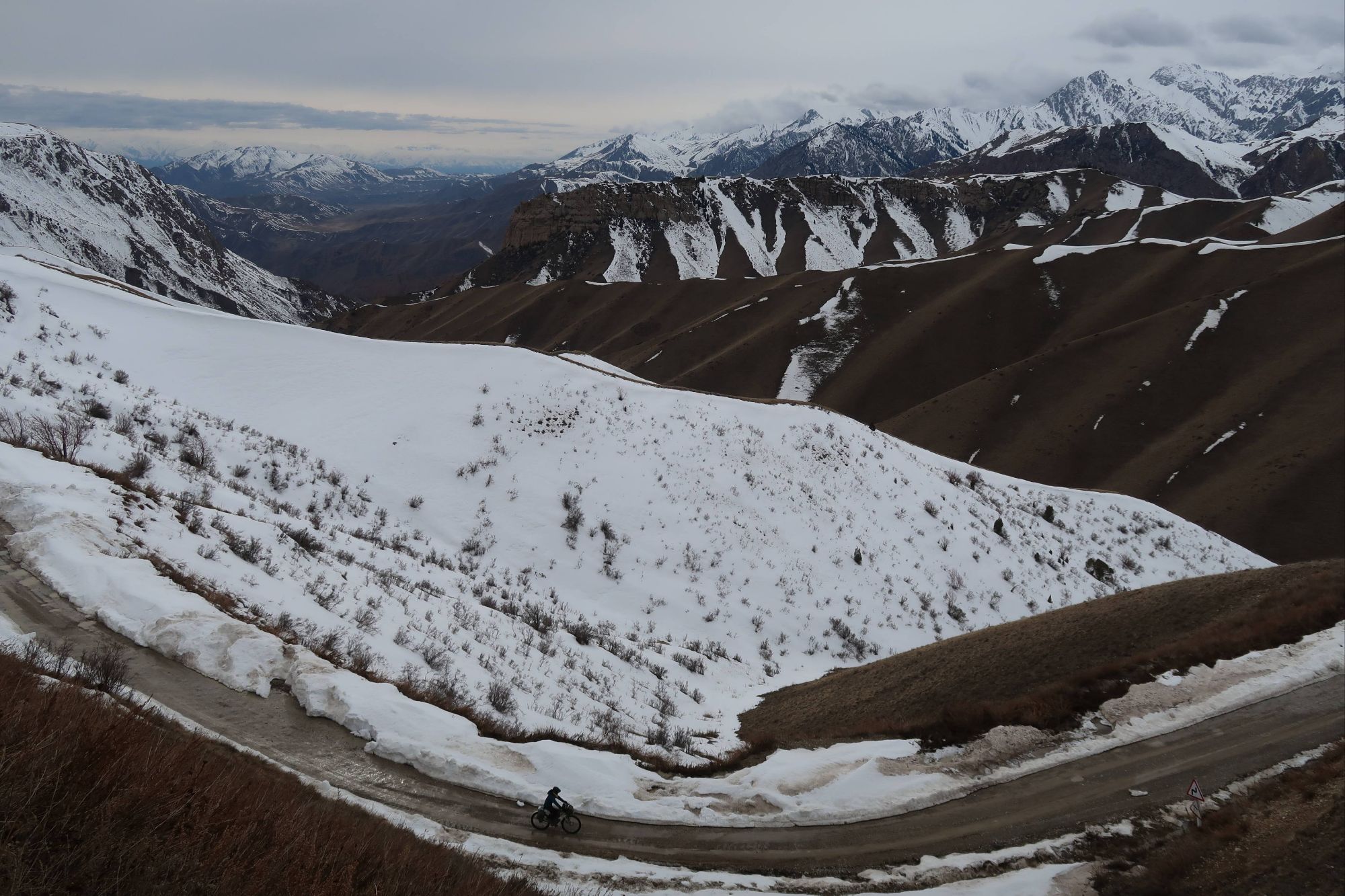 But as we sat eating our luxurious lunch of bread and tomatoes in the shelter of a bustop, the reality of riding here at this time of year really sank in. With the snowline sitting at around 2000m and the snow on either side of the road being about one meter deep, it was clear that a lot of the route we had planned in Kyrgyzstan was not going to be rideable, not even push-able. As we descended the pass, approaching our first turn off the main road, the decision was made for us. The side-road we were supposed to take was covered in snow, nothing but a road sign indicating that a road even existed under the thick blanket of white. It was disappointing. We had dreamt of the mountain passes of Kyrgyzstan for years, but we resolved to make the most of it, and head to the lower regions around the vast Lake Issyk-Kul instead. It turned out to be an excellent decision!