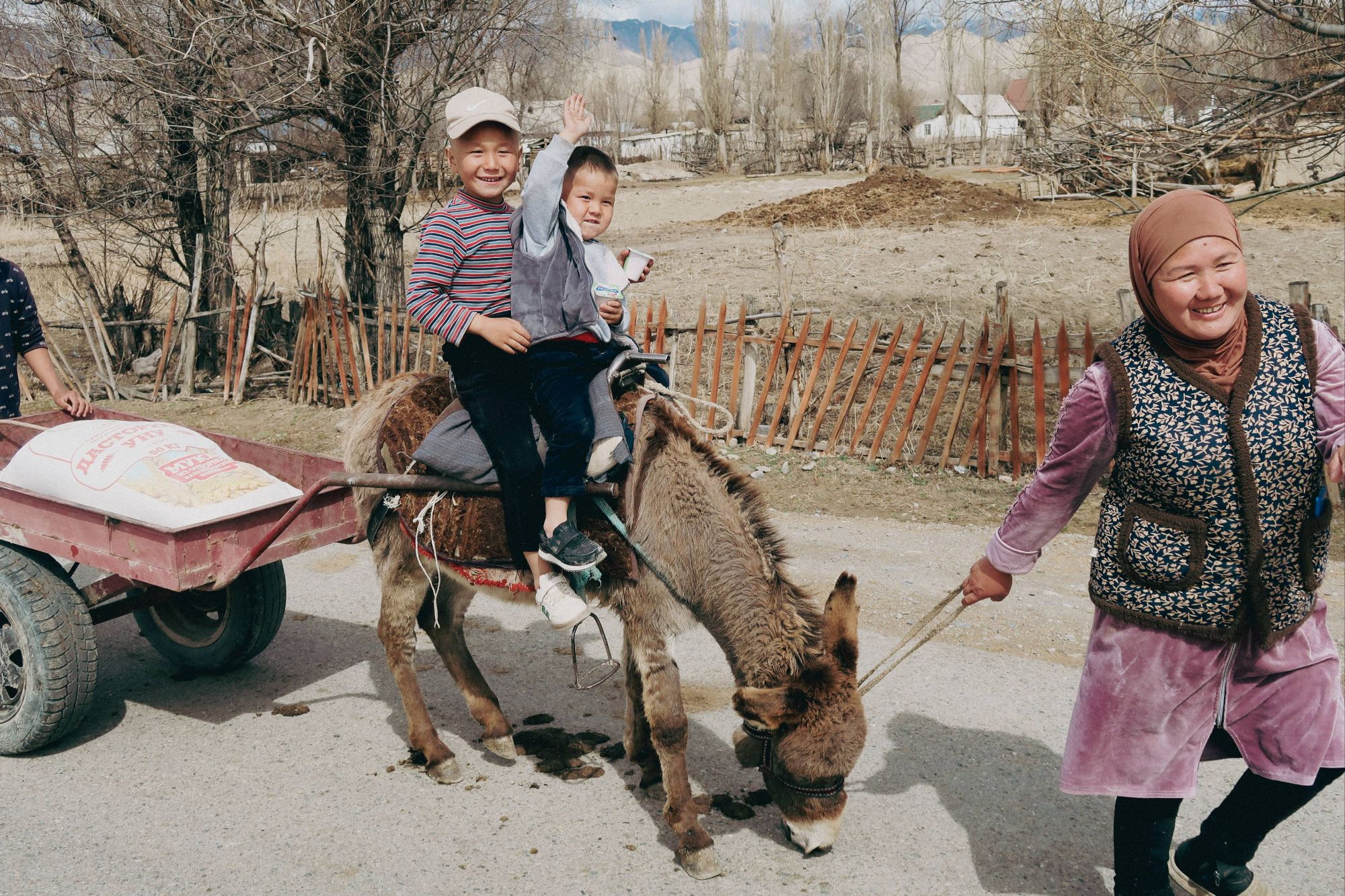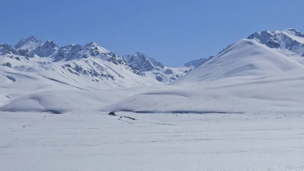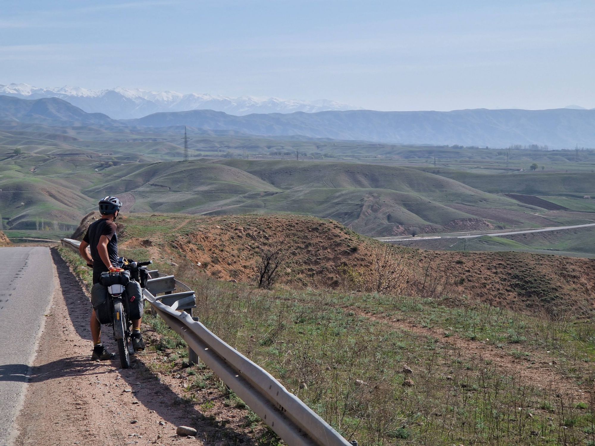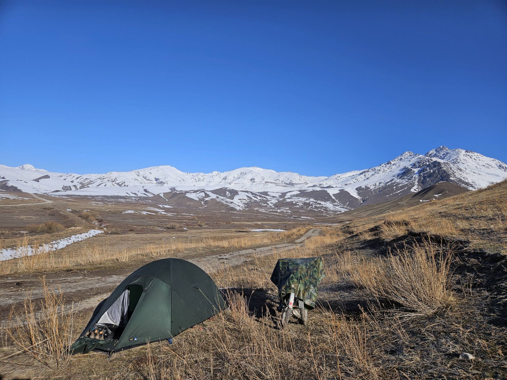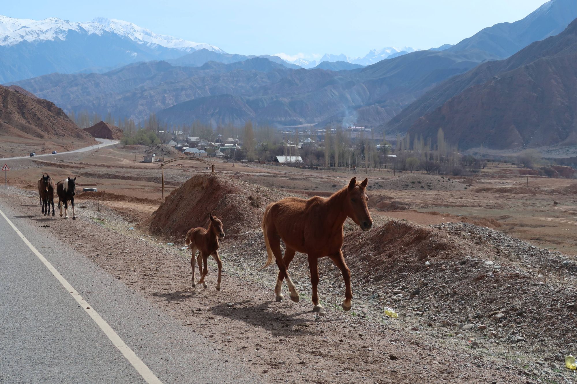 But as we sat eating our luxurious lunch of bread and tomatoes in the shelter of a bustop, the reality of riding here at this time of year really sank in. With the snowline sitting at around 2000m and the snow on either side of the road being about one meter deep, it was clear that a lot of the route we had planned in Kyrgyzstan was not going to be rideable, not even push-able. As we descended the pass, approaching our first turn off the main road, the decision was made for us. The side-road we were supposed to take was covered in snow, nothing but a road sign indicating that a road even existed under the thick blanket of white. It was disappointing. We had dreamt of the mountain passes of Kyrgyzstan for years, but we resolved to make the most of it, and head to the lower regions around the vast Lake Issyk-Kul instead. It turned out to be an excellent decision!