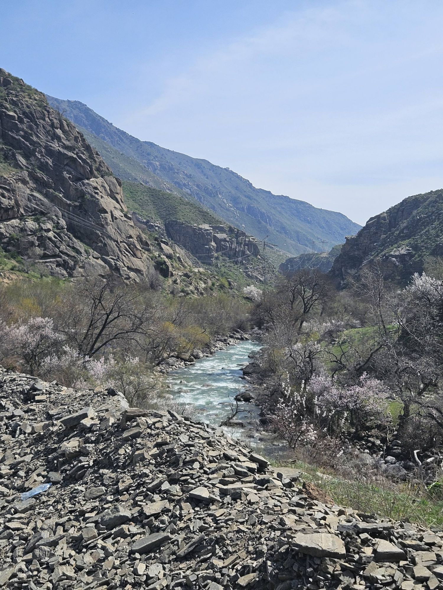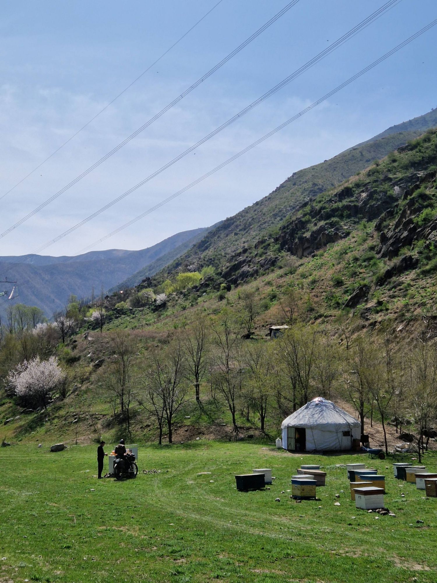 So after leaving our Swiss friend and his van of chocolate behind, we found ourselves descending out of winter. The black and white scenes from our climb up to the top of the pass suddenly had a blue sky above them. Then some trees were added into the mix. We kept descending. Dark, dark evergreens started breaking up the patchy snow as we descended back below the tree line. The early shoots of grass started to peep their heads up offering another tone to the colour palette. We kept descending. Trees suddenly had bright green shoots again. Birds were singing. The sun had some warmth to it. We kept descending. There were trees full of blossom and bees. Seasonal businesses were opening their doors for the first time, brushing away the dust and cobwebs of winter. Roadside yurts were selling honey. We descended over 2500m and suddenly found ourselves in spring. Our fingers were too hot inside our mittens, the trousers and merino tops suddenly felt ridiculous. And as we peeled off our waterproofs and packed them away, it felt like this time we were truly shrugging off the last of winter, as though the last of my lingering mental gloom was being thrown out with a good spring clean. We were boldly stood in spring in full bloom and it felt great.