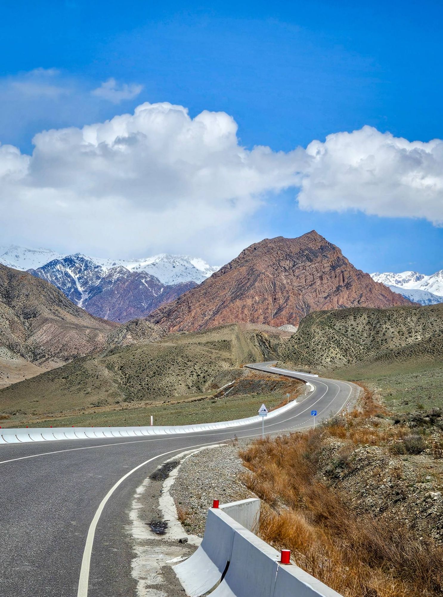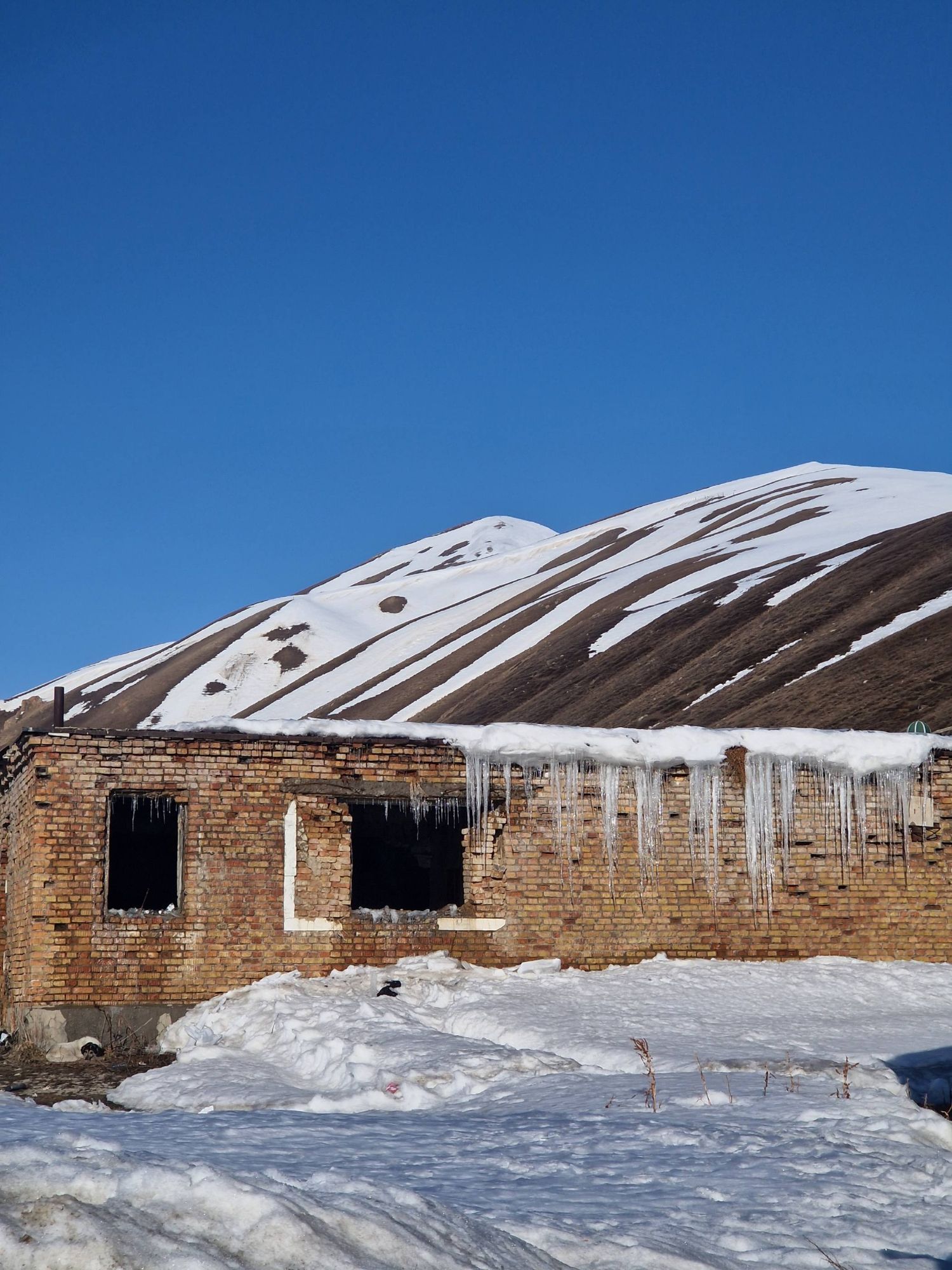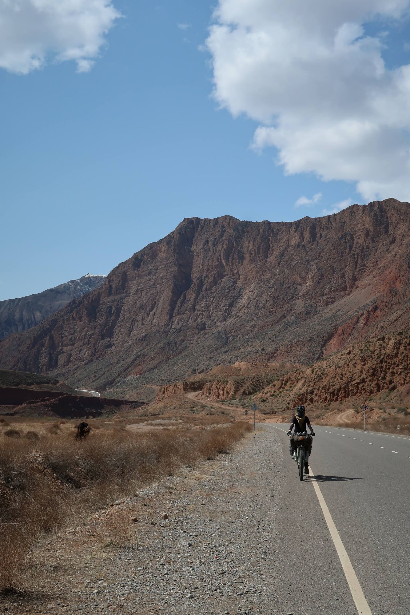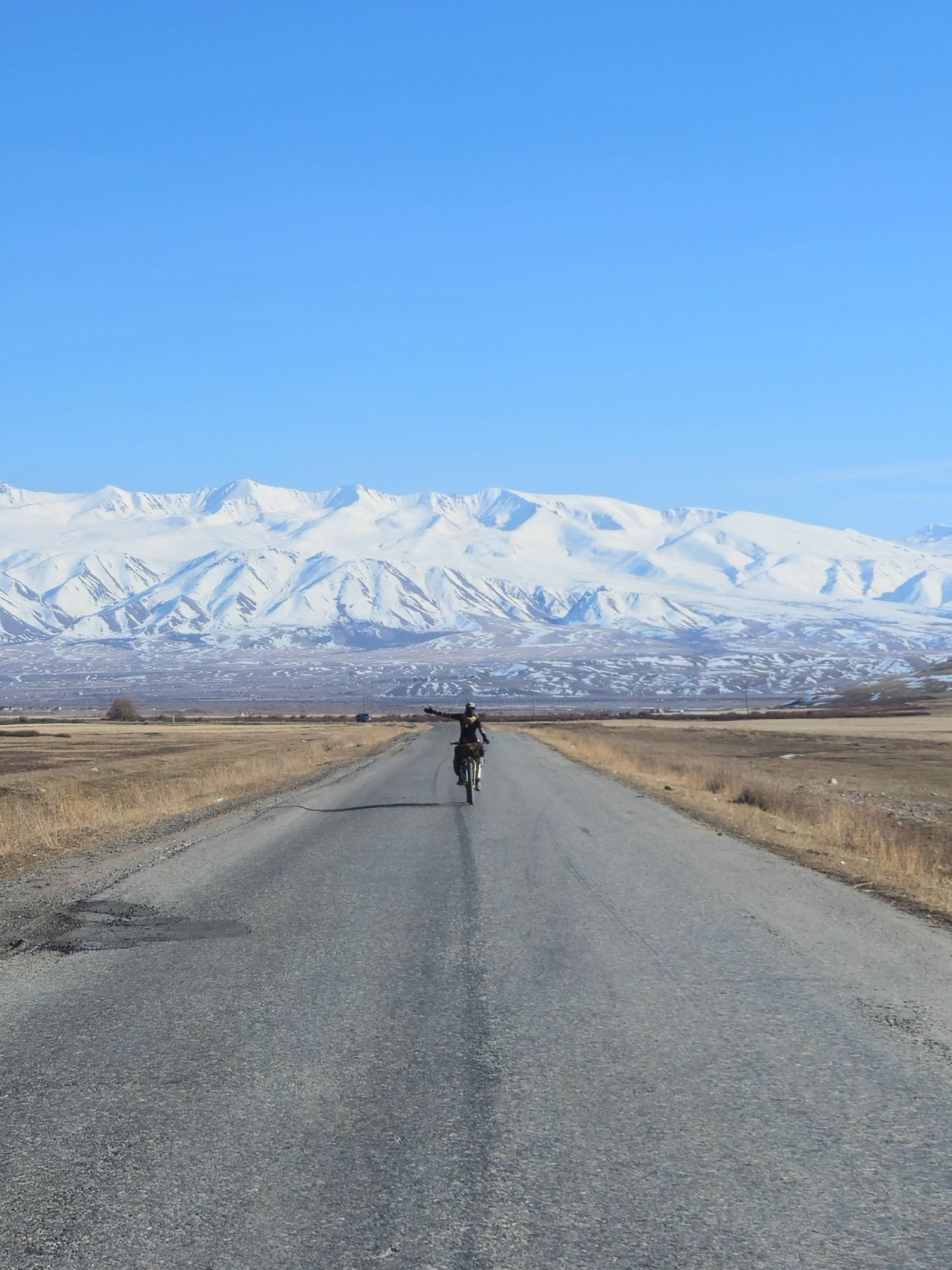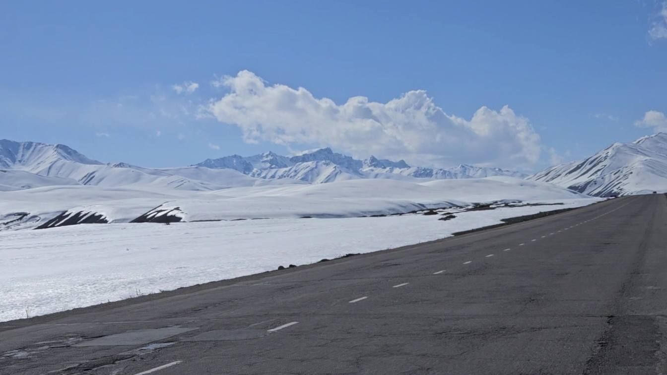 The main road was a perfectly paved double laned highway, but as we ticked off each kilometer, the road became quieter and quieter. 25kms later and it was eerily quiet. Until it was just us. That niggling feeling that this main road was closed too, suddenly grew much bigger. I decided to ask the next car that passed, only there was no one in sight. We did what any self-respecting cyclist would do and used our time waiting for a car, to eat (more bread and tomato!). By the time we had finished munching, a car was on its way towards us, and the guys in it confirmed our fears. They showed me a photo of the tunnel on their phones, it’s entrance way blocked by over a meter of snow. Great. So we retraced the 25km back to Kazarman where we had started the day. A whole 50km of cycling to get us back to where we started. Not ideal.