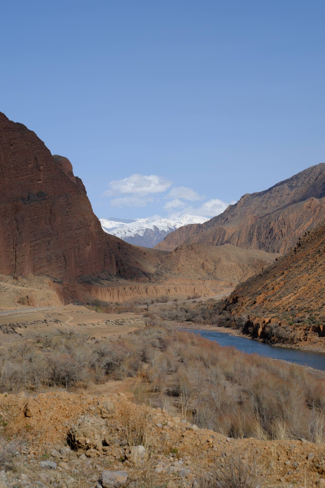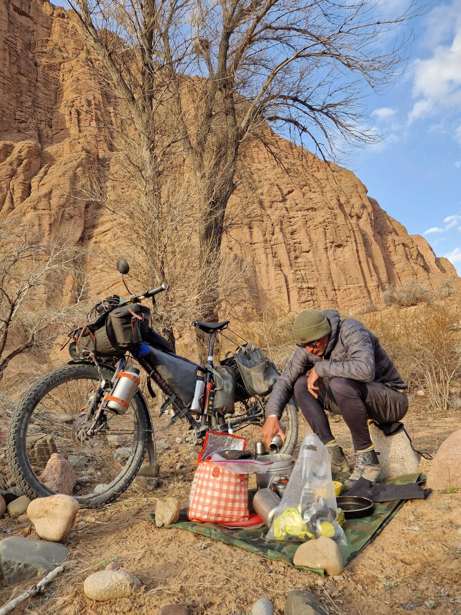The following day we set off again up the empty road, it became more and more beautiful the further along we cycled. The photos really don’t do it justice. The rock formations and the colours and the river and the mountains and the snow and the blue blue sky – what a combination. We still had the road to ourselves, I think we saw about ten cars the whole day, but they hadn’t turned around and head back towards us, which was a good sign. Our day was slow going purely because we stopped so much to take photos or just to stand and stare at everything that was before us, trying to take it all in. As we camped that night, under huge red rock formations that reminded us of Utah, we were releived to realise we were now on the northern part of the road, and had linked the two sections on our map. Regardless of this, we had also come to realise that this road was exactly where we were supposed to be, we were supposed to come this way to see all this amazing beauty, to enjoy a few days at slightly lower elevation, to defrost in the warmer temperatures and to cruise along on smooth traffic free asphalt. It turns out it was just what my body and mind needed – things happen for a reason after all.
