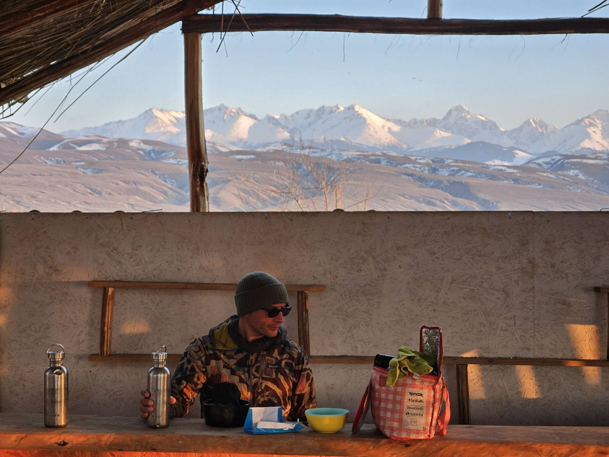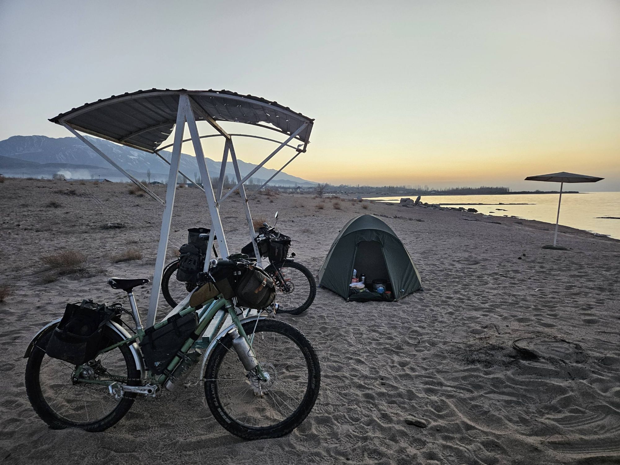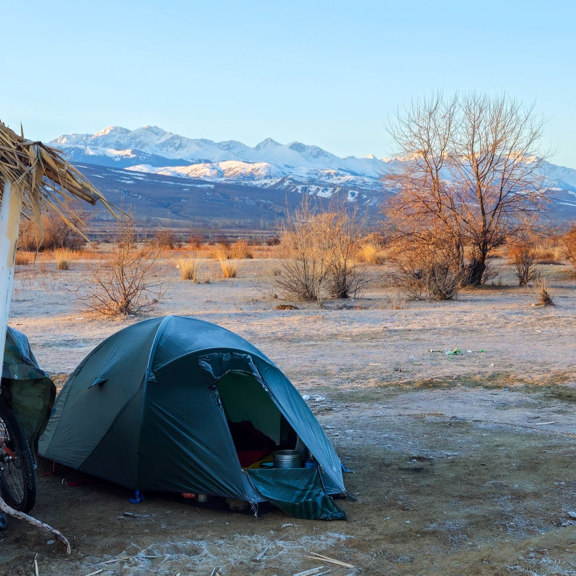 We spent our time skirting around Lake Issyk-Kul braving the freezing cold temperatures at night in the tent, and enjoying the warmth of the sun during the day. We camped on white sand beaches along the lakeside, enjoying the views of the snow capped peaks on the North edge of the lake, watching impressive winter sunsets over the water before retreating to cosy up in the tent. We had each beach campspot all to ourselves – which would be totally unheard of in the warmer months.