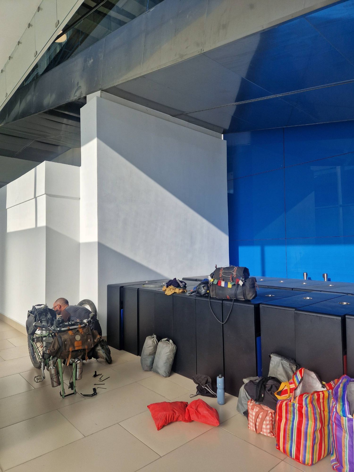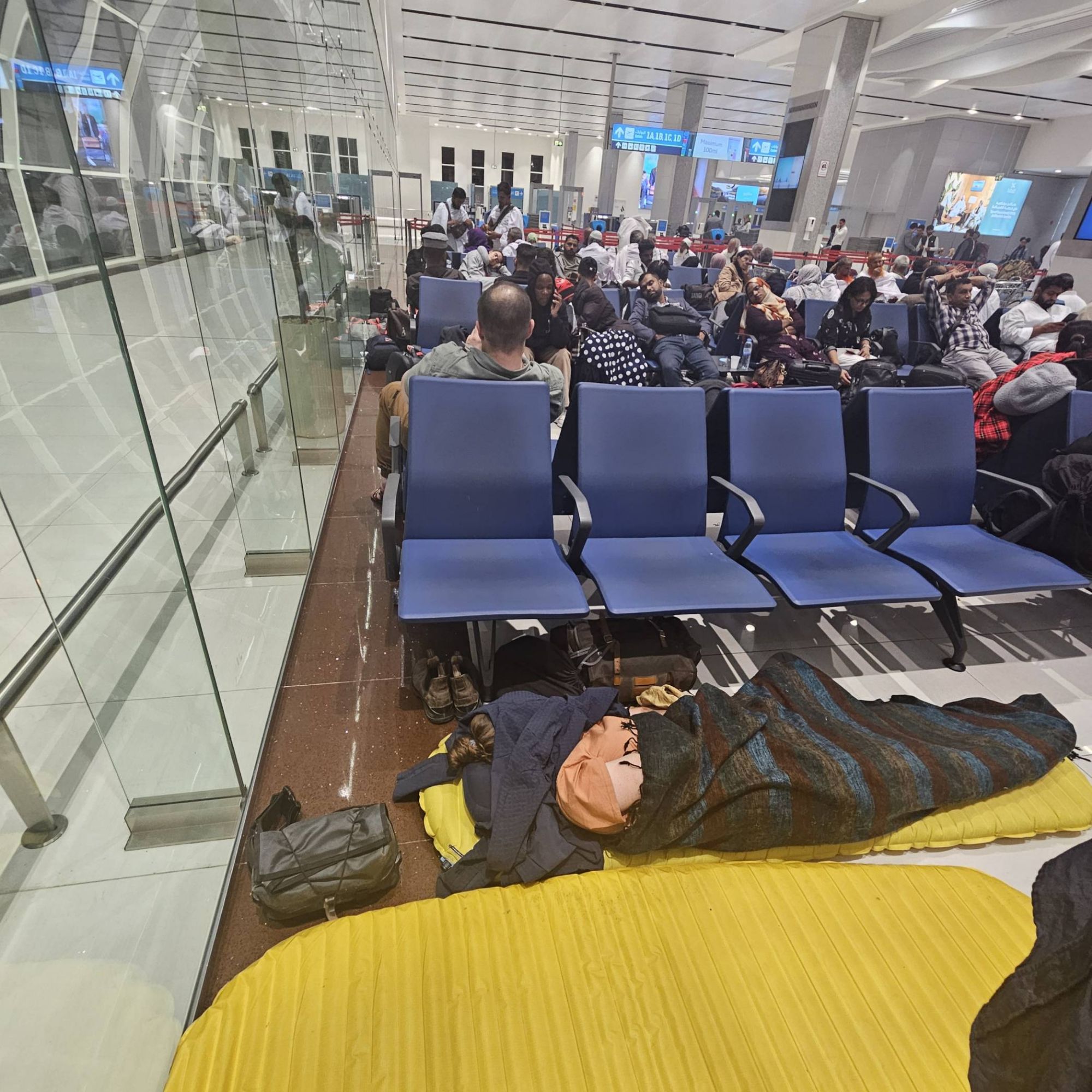 Our late night flight out of Kathmandu meant we knew we would be getting little sleep, but we had hoped that a 9 hour lay-over in a random airport in the UAE would provide us with some time to catch up on some much needed shut-eye. We are used to sleeping in a different place every night, so we figured we would find a quiet corner of the airport and set up our rollmats and sleeping bags and be as comfortable as ever, but as we emerged from our first flight, our eyes readjusting to the bright glare of the airport illuminations, we realised this was going to be harder than we thought. We somehow seem to have found the busiest and loudest airport we’ve ever been to. Every seat was occupied, every inch of the floor between seats was covered with people laying down. There was no quiet corner, there was no under-the-stairs to hide in. And, wow, the noise, it was like a cattle market with everyone shouting to one another, everyone playing their phone music or TikTok videos at full volume – whether they were watching the viral rubbish or were somehow managing to sleep through it, they still had it playing at full volume. Total craziness.
