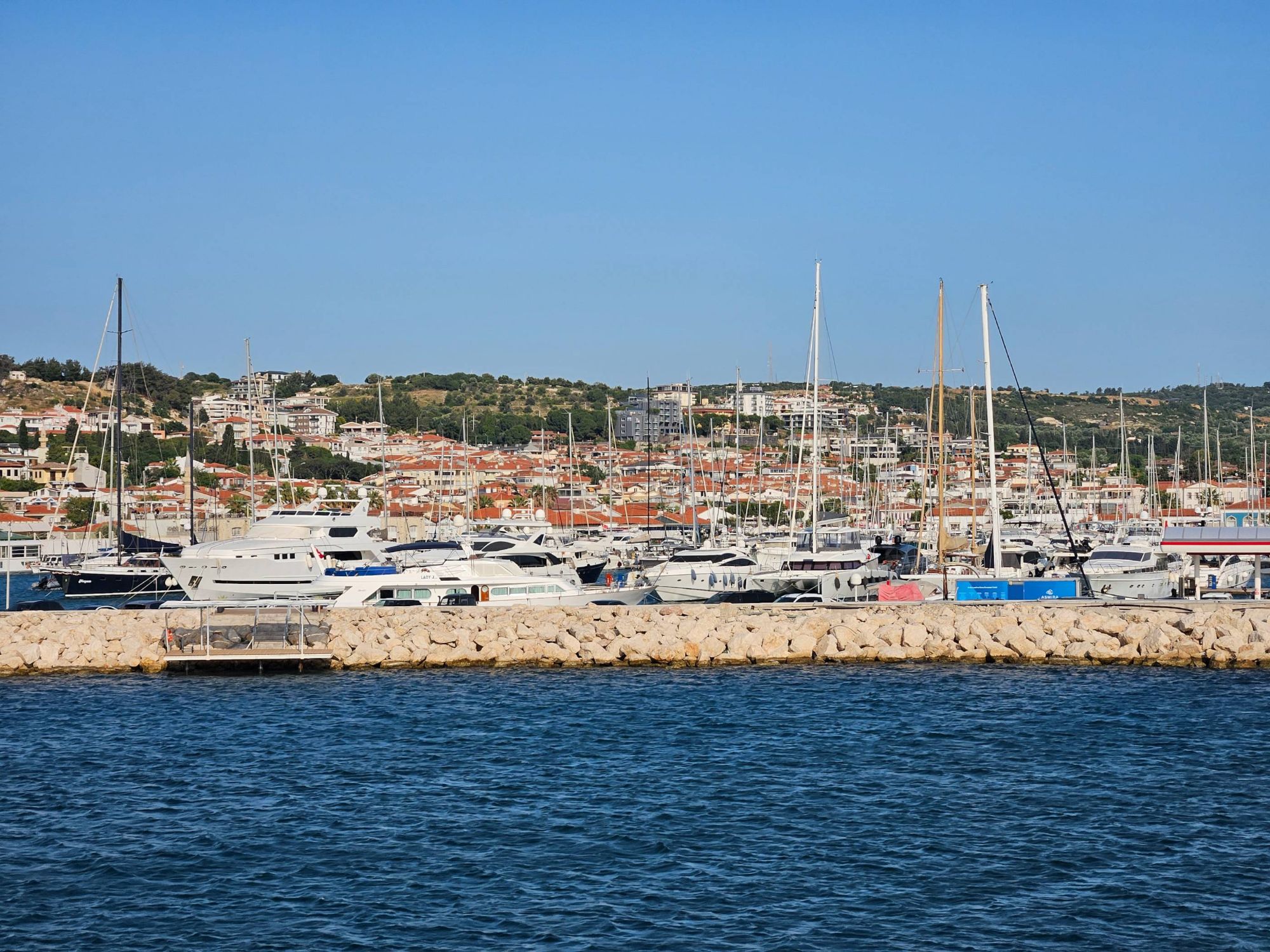 From Izmir, we whizzed along busy coastal paths, dodging fishermen’s rods and wiggling between families out walking. This was nothing like the Turkiye we had come to experience over the last month or so. The Adriatic Sea was the bluest blue and we could feel the homely familiarity of salty stickiness in the air and clinging to our skin, as white horses were whipped up by the strong winds blowing inland. Bit-by-bit everything was beginning to look and feel more like a Greek island – cobbled streets winding through small coastal villages, blue shutters on white washed houses, large men perched outside bakeries on rickety old chairs, lazy sleeping cats occupying every patch of speckled shade created by thick, twisting vines.