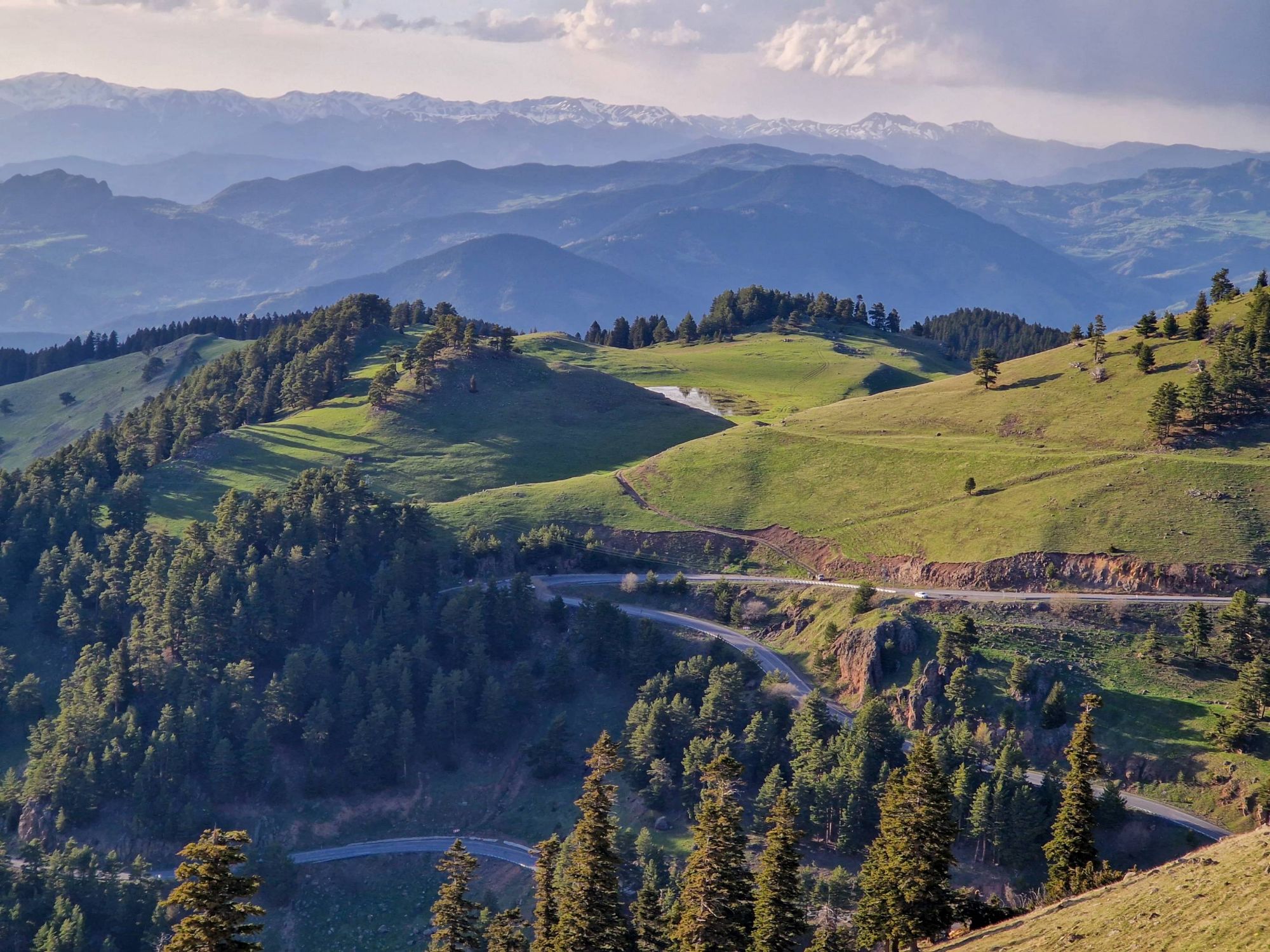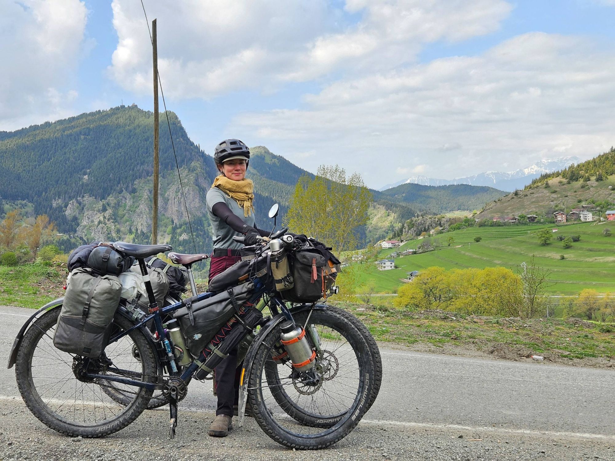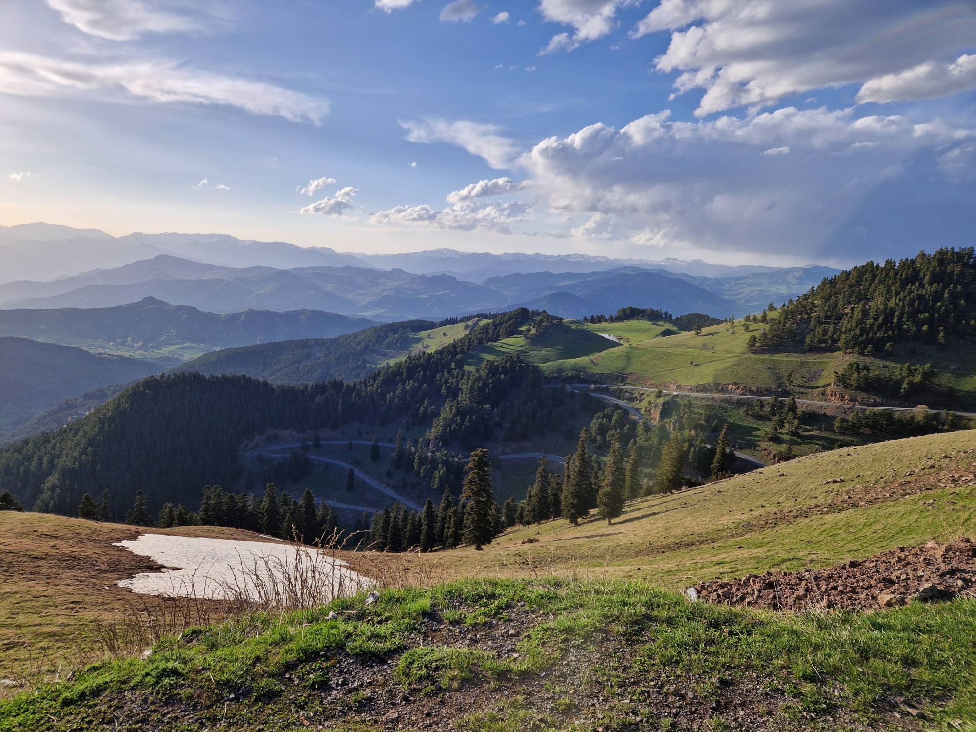 Safe to say, we survived the night, and awoke the following morning to incredible views. The meadows and mountain tops all around us, which had been obscured by all of the weather the day before, were pretty special. We couldn’t quite believe our eyes. Were we really in Turkiye? Our preconceived notions of Turkiye involved package holidays, sleazy men and dry desert-y scrubland with the occasional tortoise. But this. This was a lush, green, mountainous wonderland, with ridgelines extending in all directions and the last of the winter snow highlighting dramatic rock formations. Our initial vague thoughts with our time in Turkiye had been to maybe catch a boat across the Black Sea, but with our, quite frankly, ridiculous preconceptions being so clearly wrong even on day one, we came up with another plan.