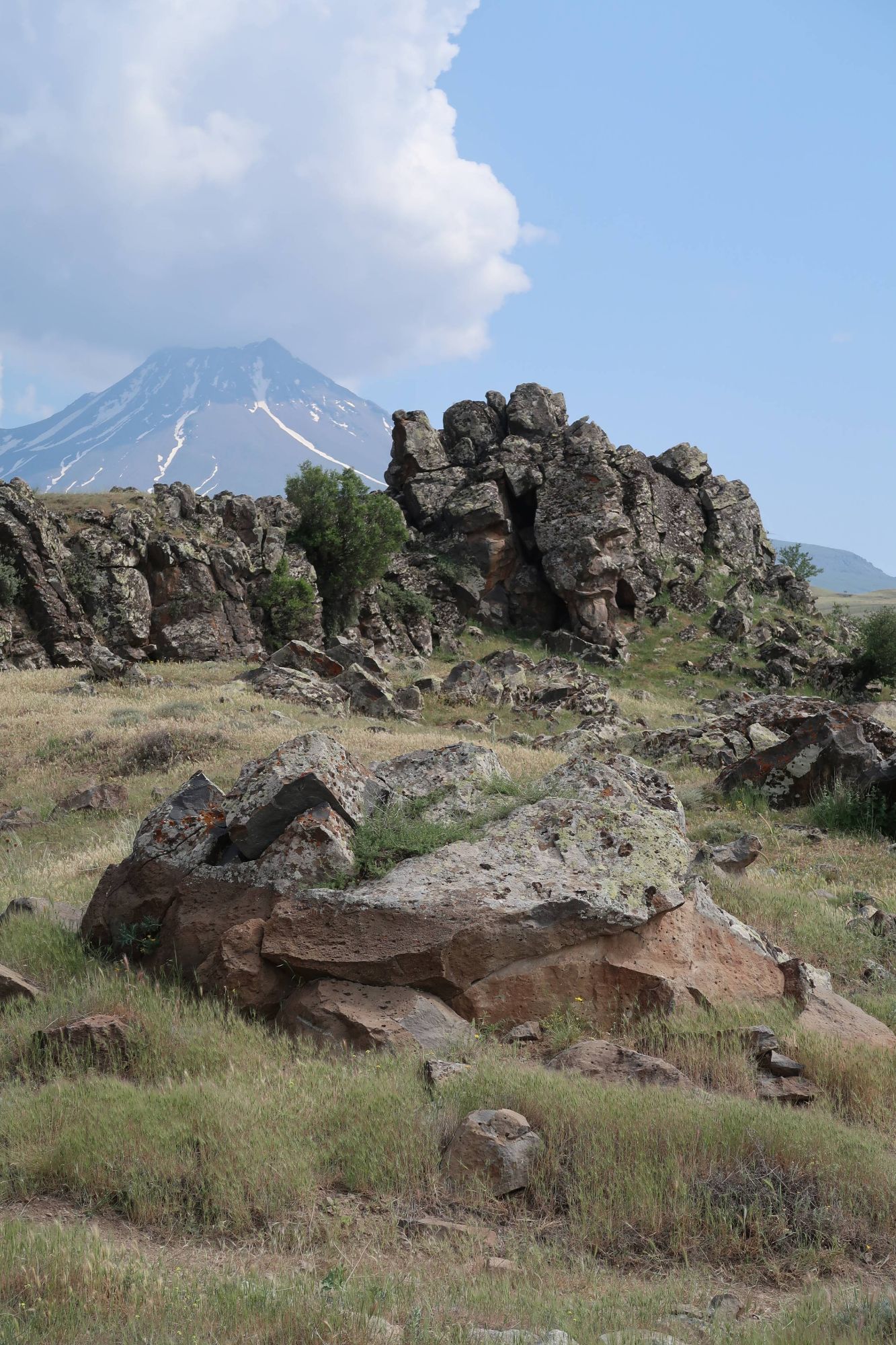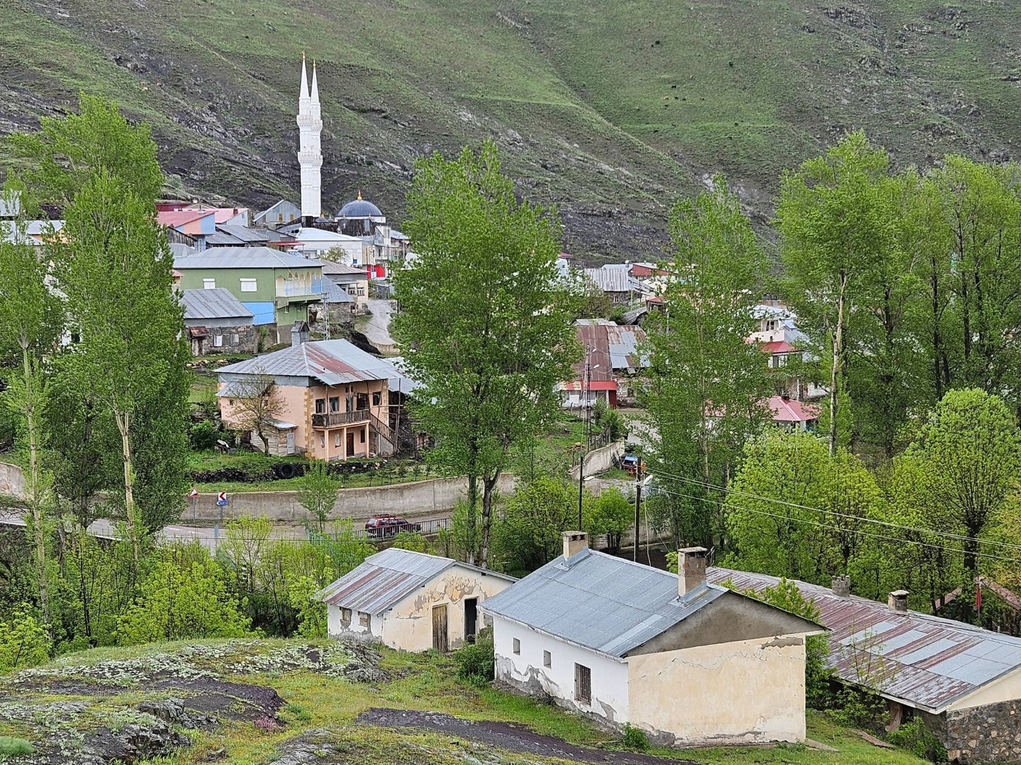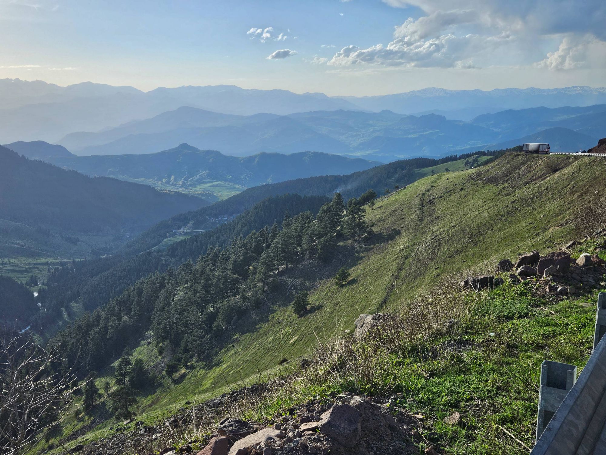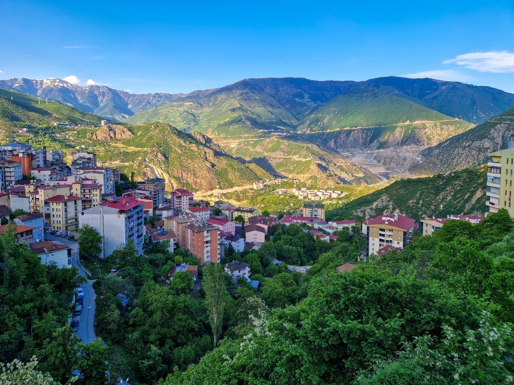 Safe to say, we survived the night, and awoke the following morning to incredible views. The meadows and mountain tops all around us, which had been obscured by all of the weather the day before, were pretty special. We couldn’t quite believe our eyes. Were we really in Turkiye? Our preconceived notions of Turkiye involved package holidays, sleazy men and dry desert-y scrubland with the occasional tortoise. But this. This was a lush, green, mountainous wonderland, with ridgelines extending in all directions and the last of the winter snow highlighting dramatic rock formations. Our initial vague thoughts with our time in Turkiye had been to maybe catch a boat across the Black Sea, but with our, quite frankly, ridiculous preconceptions being so clearly wrong even on day one, we came up with another plan.