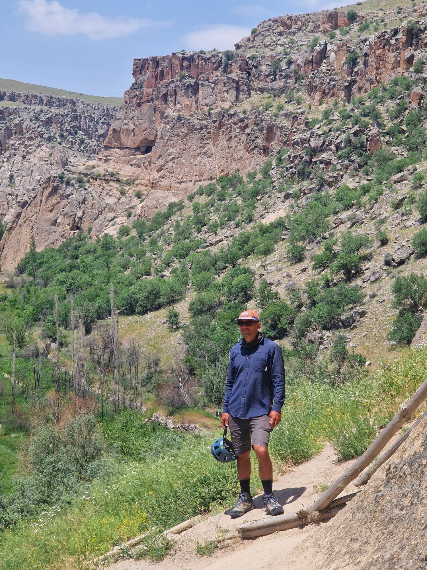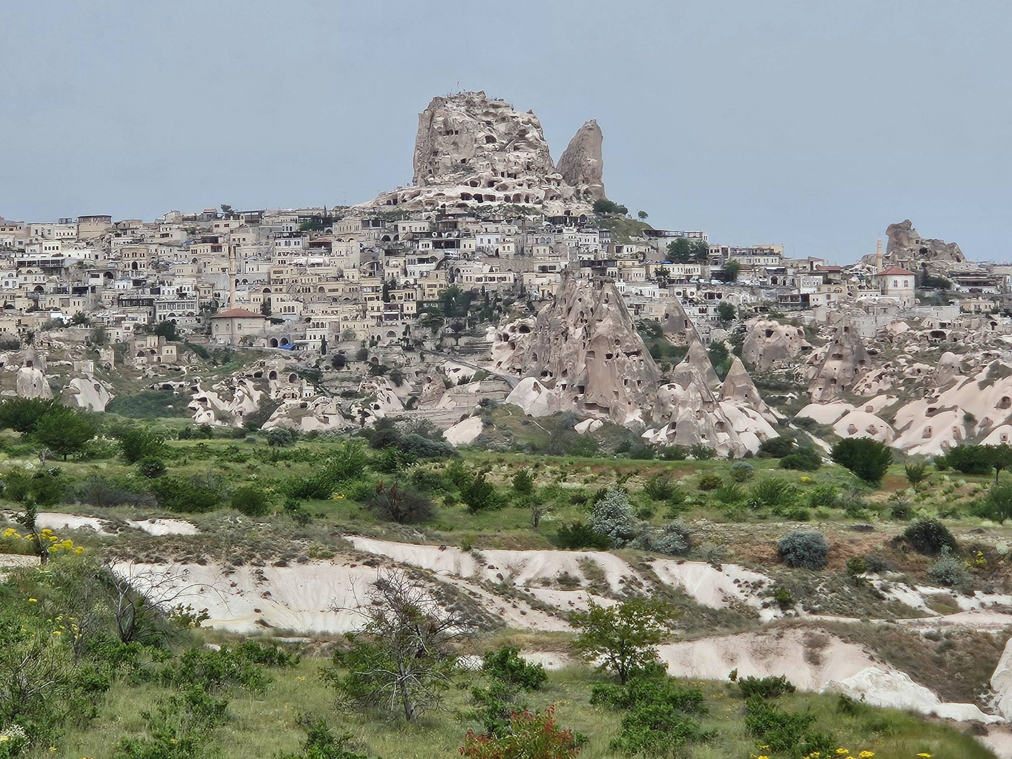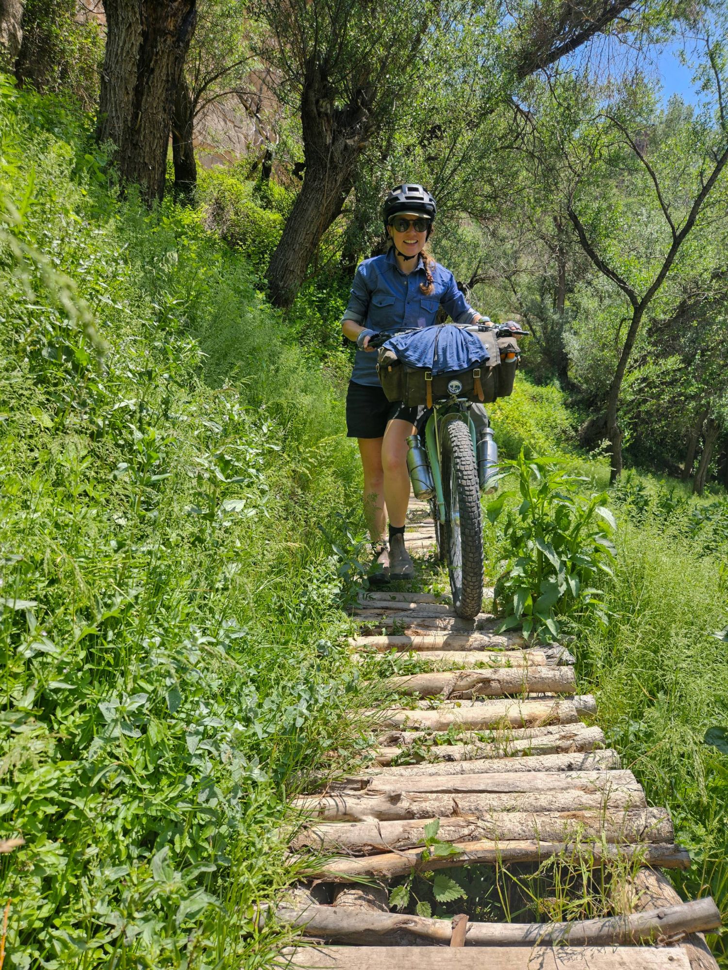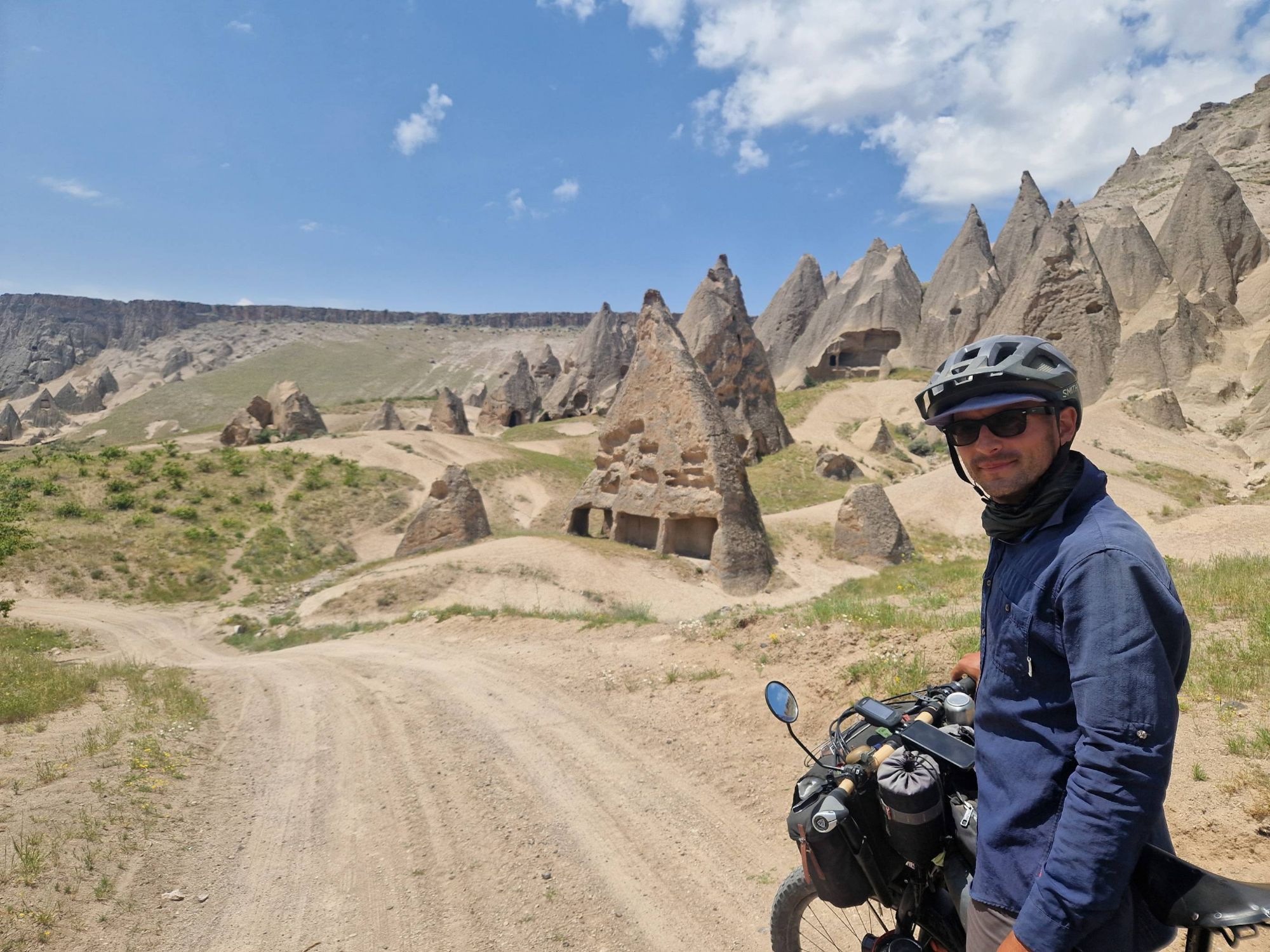 The wildflowers remained with us as we approached the Cappadocia region. A region famous for it’s cave systems, underground cities, ‘fairy chimneys’ of rock and, now thanks to tourists, hot air balloons. We approached the region from the South East, and joined a popular bikepacking route to take us on some off-road trails to see the best of the region. There are so, so many off-road routes in this area so we were pretty surprised when the route took us down a dried up river bed that quickly turned into deep, energy-sapping, unrideable sand. We cursed ourselves for not spending the time to work out a route for ourselves and then cracked-on, pushing and heaving the bikes, using old hike-a-bike muscles that haven’t had a strength session in a while and sweating profusely under the midday heat. But as soon as we crested the edge of the canyon near Soganli, and plummeted down the off-road track towards the river, all was forgiven. As we caught our first glimpse of the famous caves and fairy chimneys, we stopped in our tracks and tried to take in what we were seeing. A whole canyon, carved deep and wide by the river, the bottom full of green trees and grasses, surrounded by fairy chimneys, hundreds of them, all with little windows and doors carved into them. Higher still, and all the cliff faces of the canyon were scattered with cave entrances, windows and the remnants of stairways and walkways linking them all. It was incredible. The photos really don’t do it justice. And once we had the opportunity to walk around inside them – wow. They were so much more homely than I ever imagined – separate rooms for sleeping, storage or socialising. Communal kitchens centred around the one chimney, the ceiling, blackened by the years of smoke. Washhouses with troughs and pipeways linking them together – all carved out of stone. But the thing that was most mind-boggling was the sheer number of them, everywhere you looked. And even as we pedalled through one canyon after another, heading further North towards the more touristy towns, you could look up and see even more caves or fairy stacks tucked into the trees. It’s hard to imagine that many people living here. And now they are all empty, where have all the people gone!?